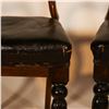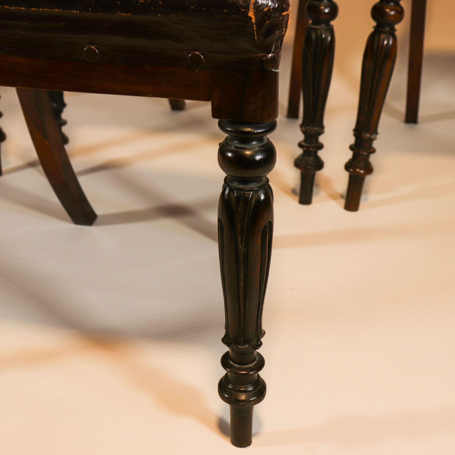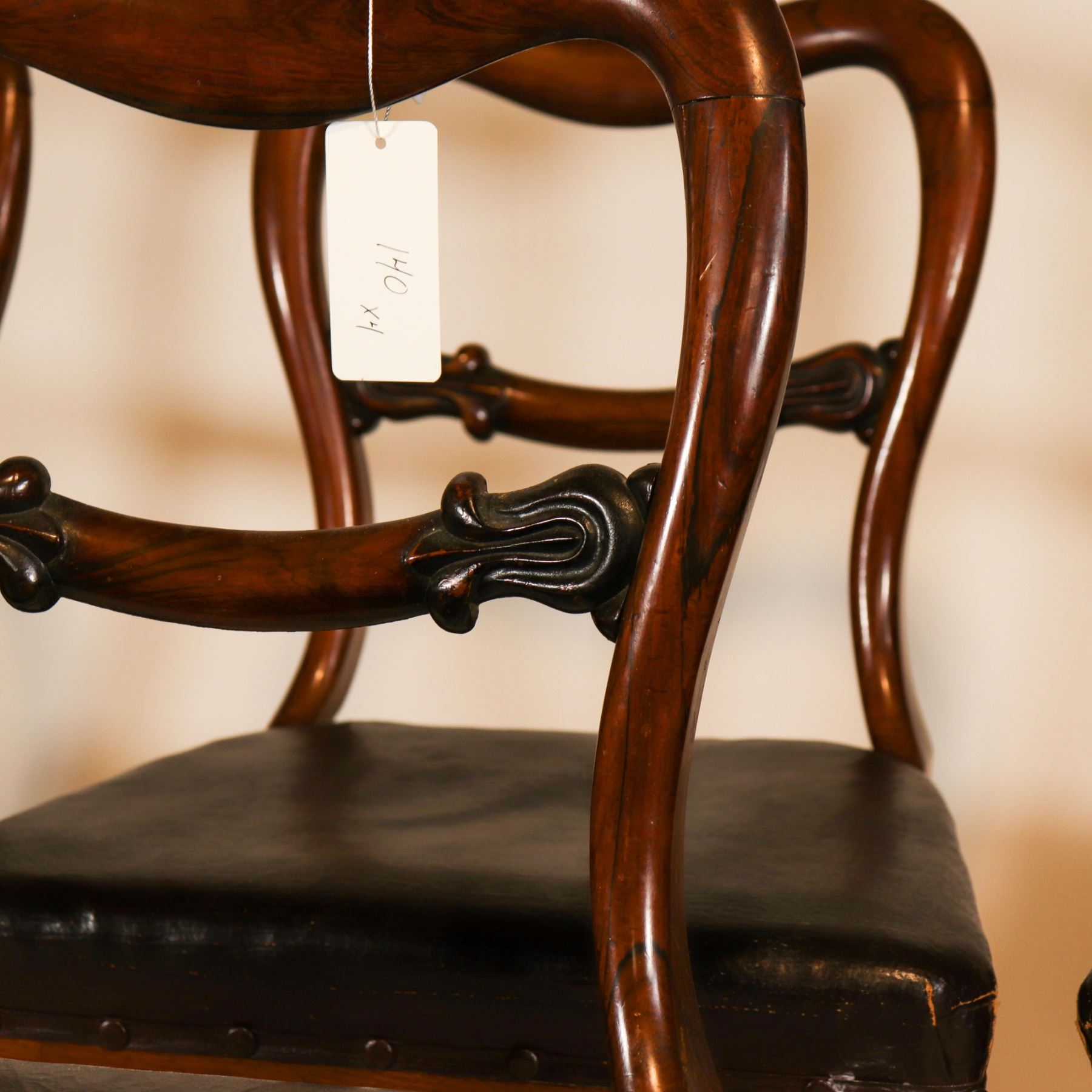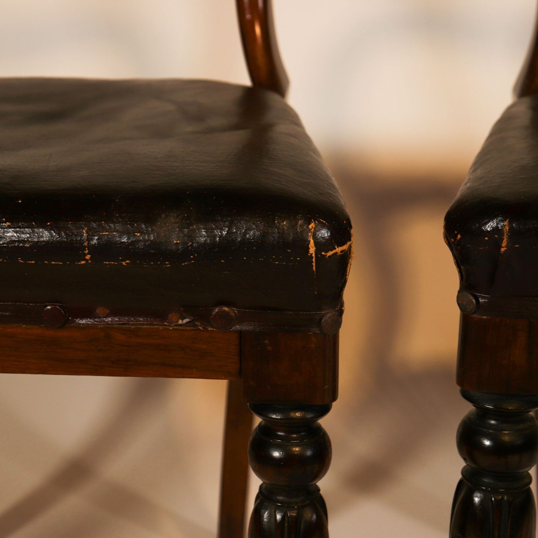 Set of four Victorian balloon-back side chairs, late 19th century, each with a shaped balloon back above a pair of scroll-carved horizontal splats, over a square seat upholstered in dark leather or leathercloth, raised on turned and reeded front legs and splayed rear legs. Warm medium-brown finish with ebonized details to the carved splats and legs. Several joints are loose and some chairs will require regluing and tightening; sold as a restoration group. Approx. 33 in. high, 18–19 in. wide; seat height approx. 17–18 in.