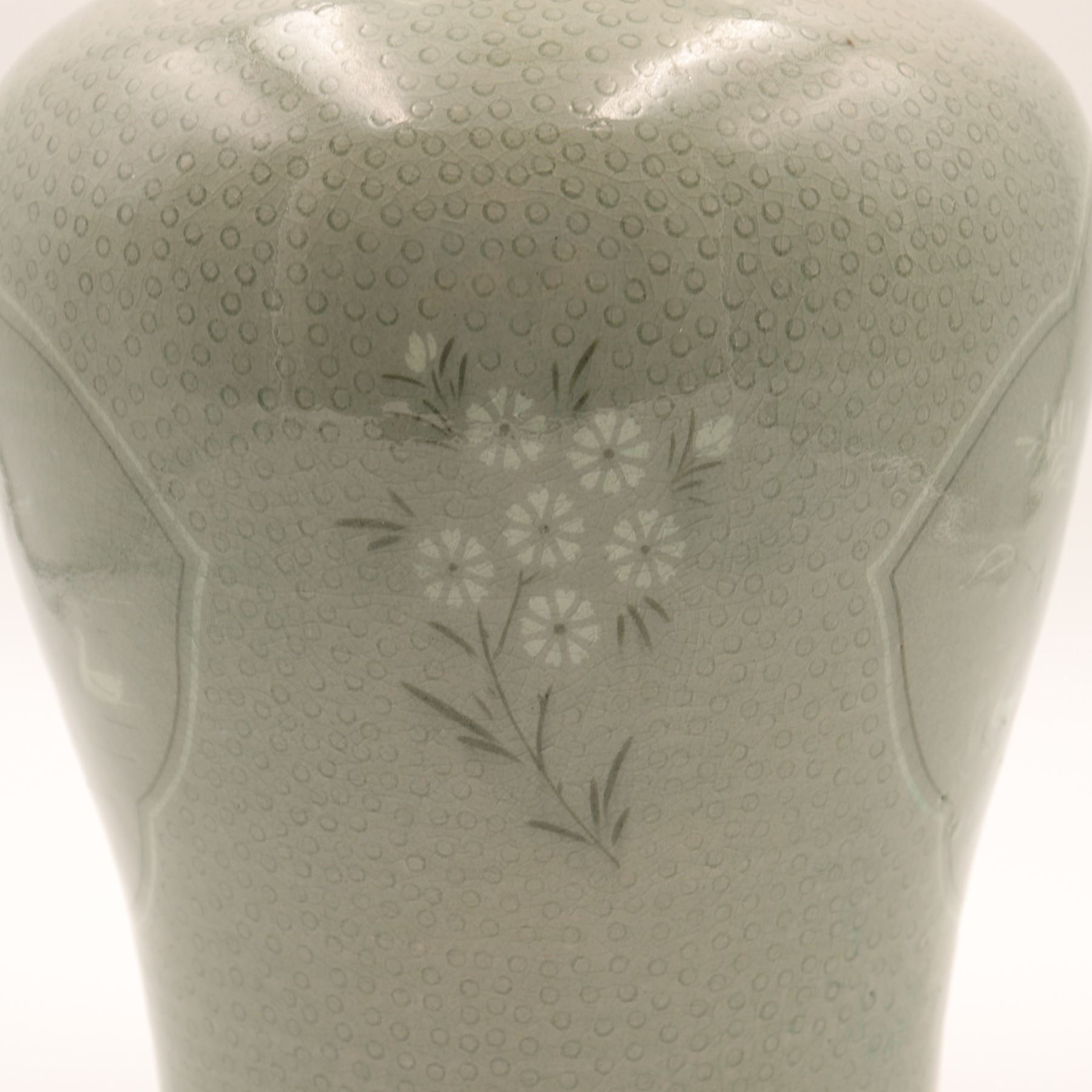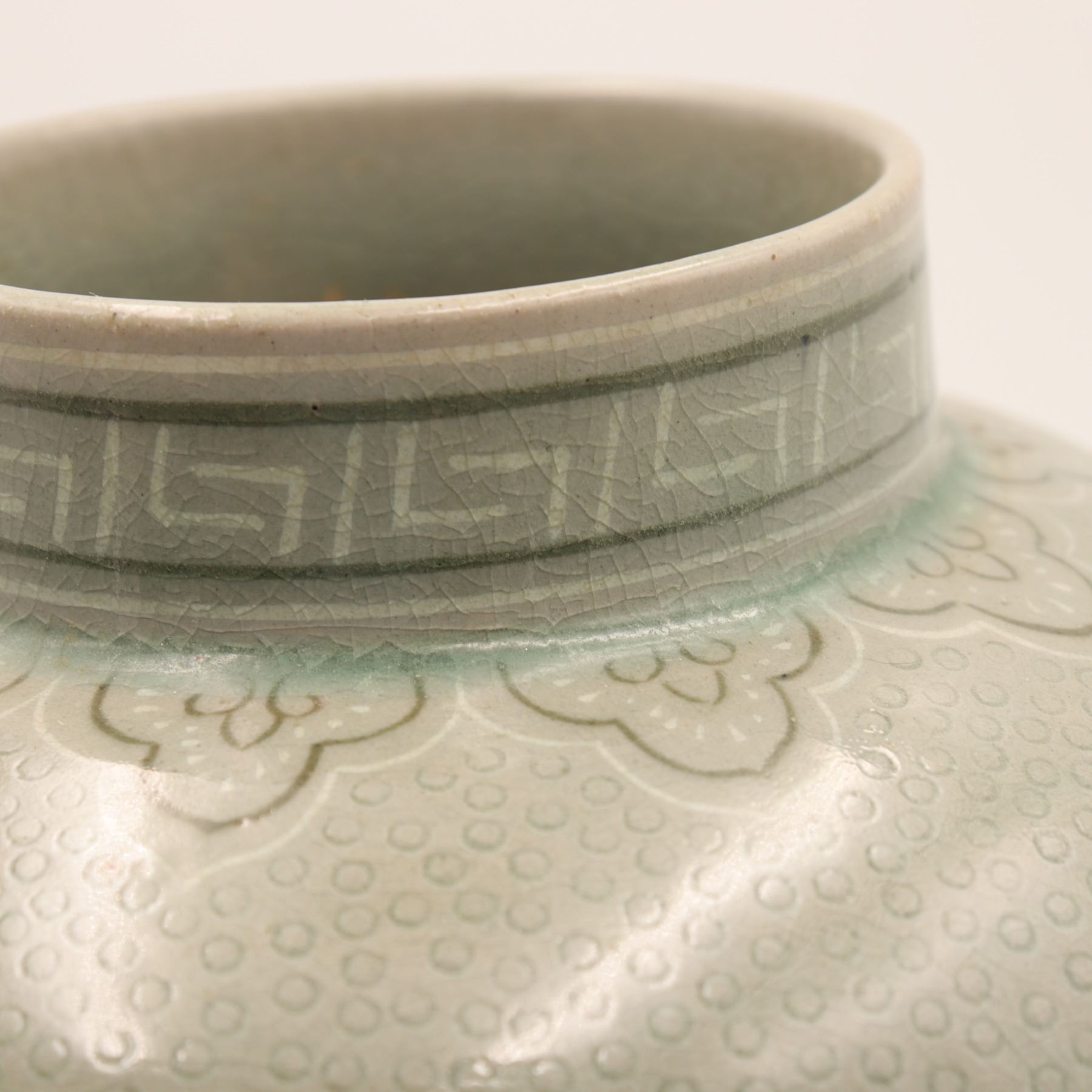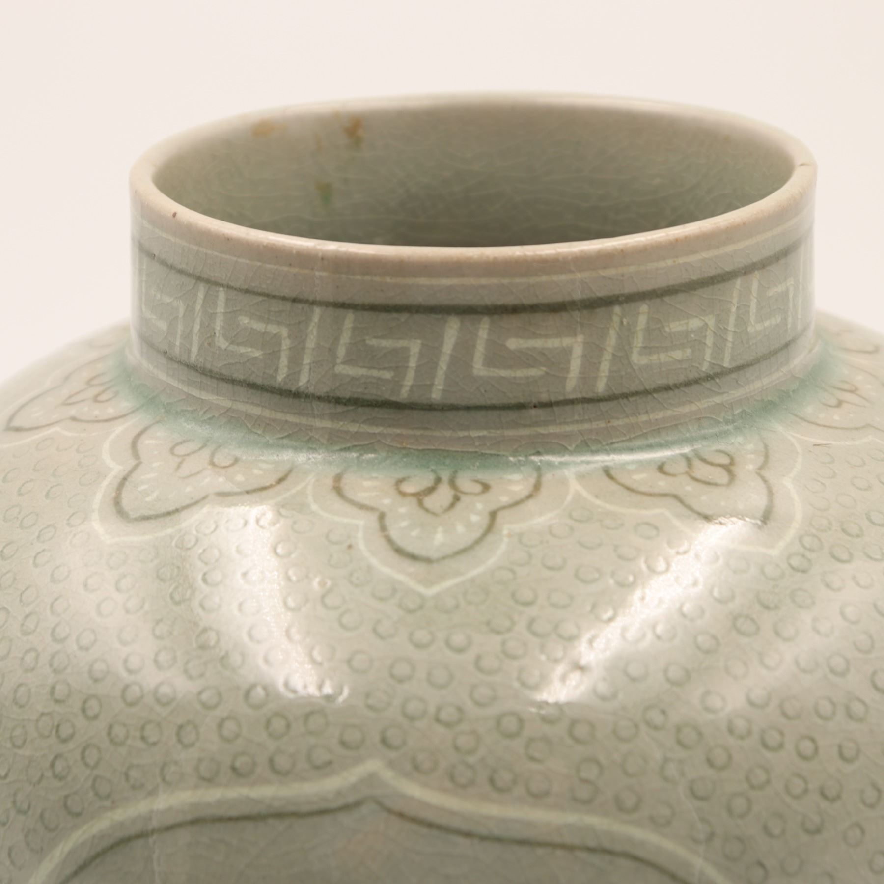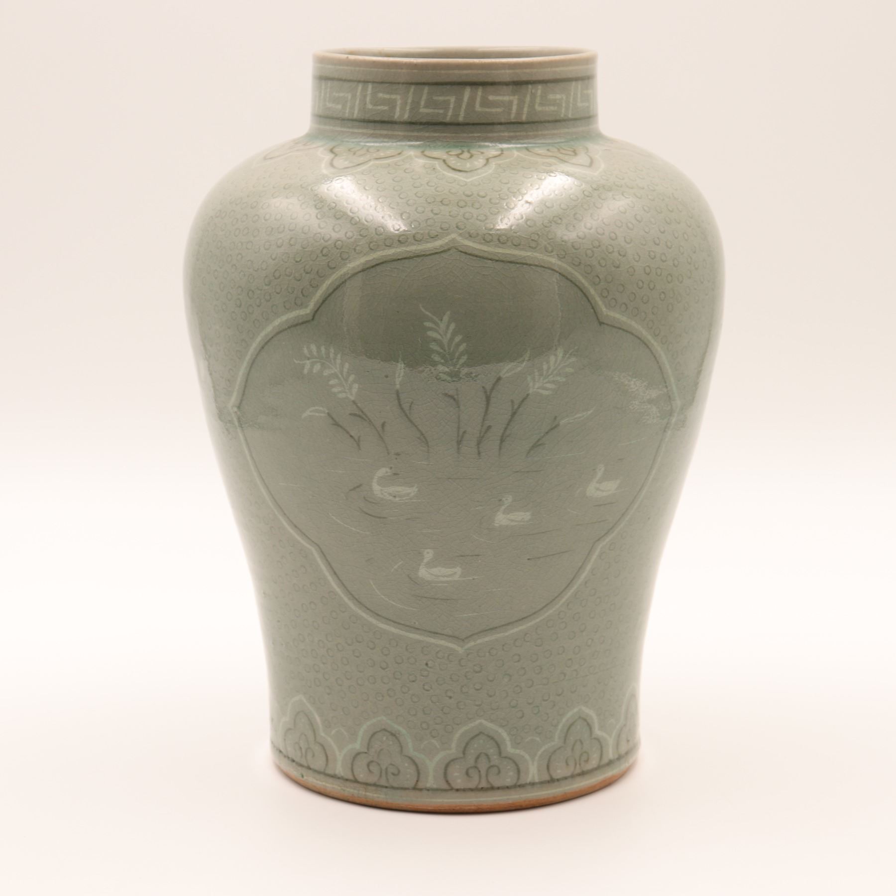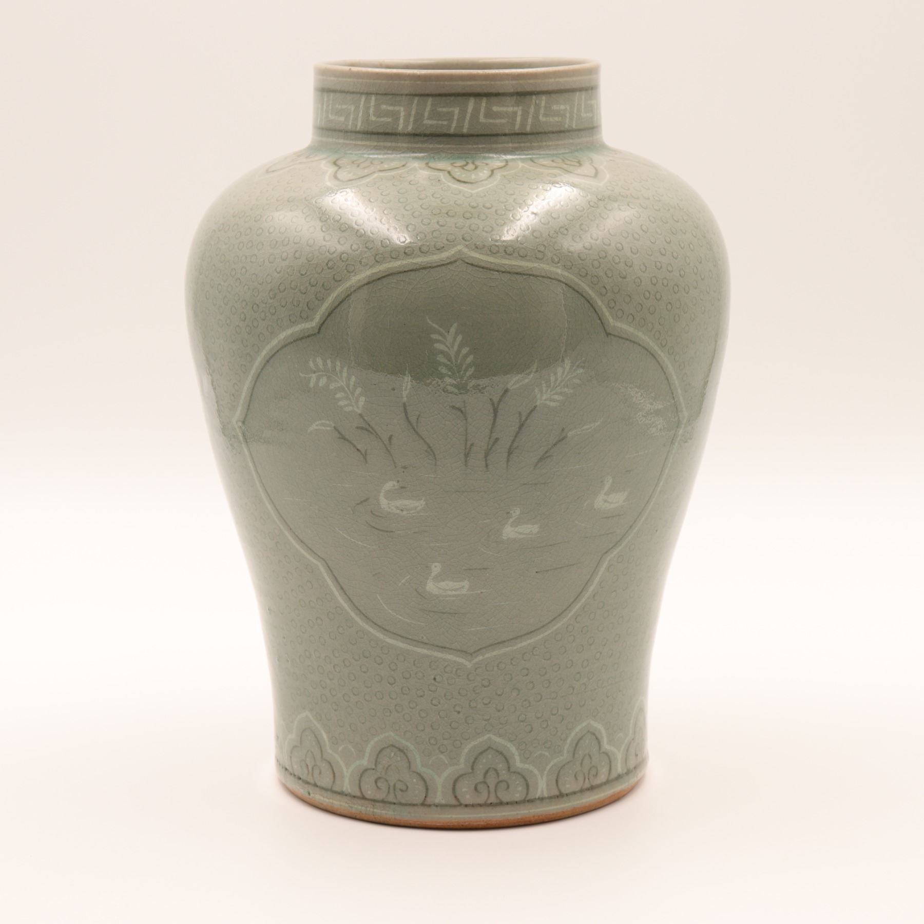 Hand-thrown Korean celadon glazed stoneware vase, ovoid form with short straight neck and slightly flared mouth, the pale blue-green glaze with allover crackle. The body is decorated in reserved cartouche panels with a subtle inlaid scene of ducks swimming among reeds, framed by a scalloped border. The surrounding ground carries a dense pattern of small raised dots, above a band of stylized petal lappets around the foot. The neck is encircled by a key-fret border and the shoulder with a cloud-lappet motif. The base is fully glazed with an unglazed footrim, inscribed with Korean characters and an impressed seal mark, indicating studio or artist production. A fine modern interpretation of traditional Goryeo-style celadon. Condition: no chips, hairline cracks, or restorations observed under normal inspection; glaze with intentional allover crazing typical of this ware, with a few darker craze lines more visible on the base; minor firing imperfections including small pinholes and glaze bubbles, especially to the underside, and a few tiny iron specks in the glaze; very light surface wear to the footrim from display. Height approx. 11 in.; max. diameter approx. 6 1/2 in.