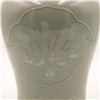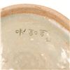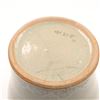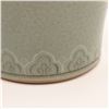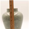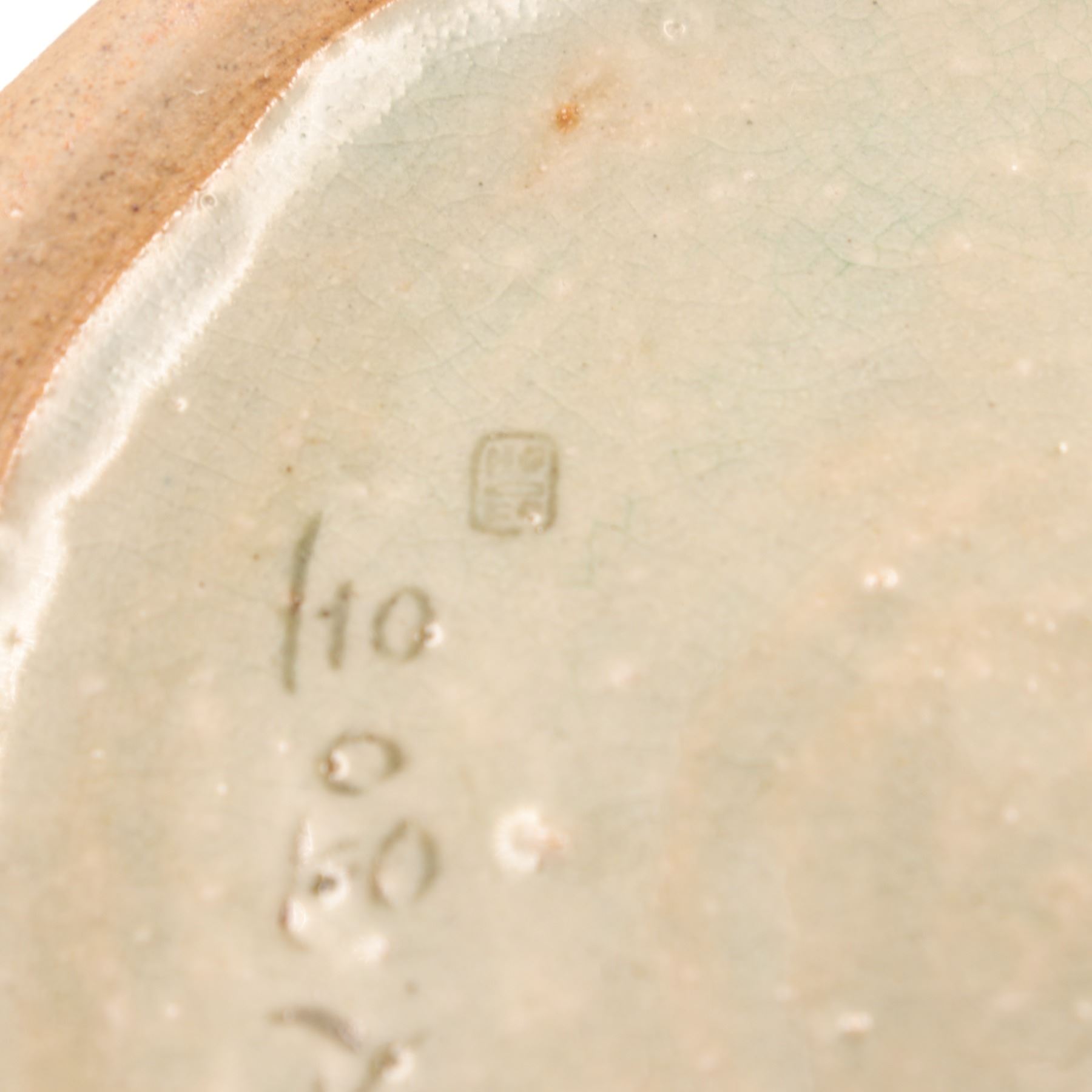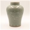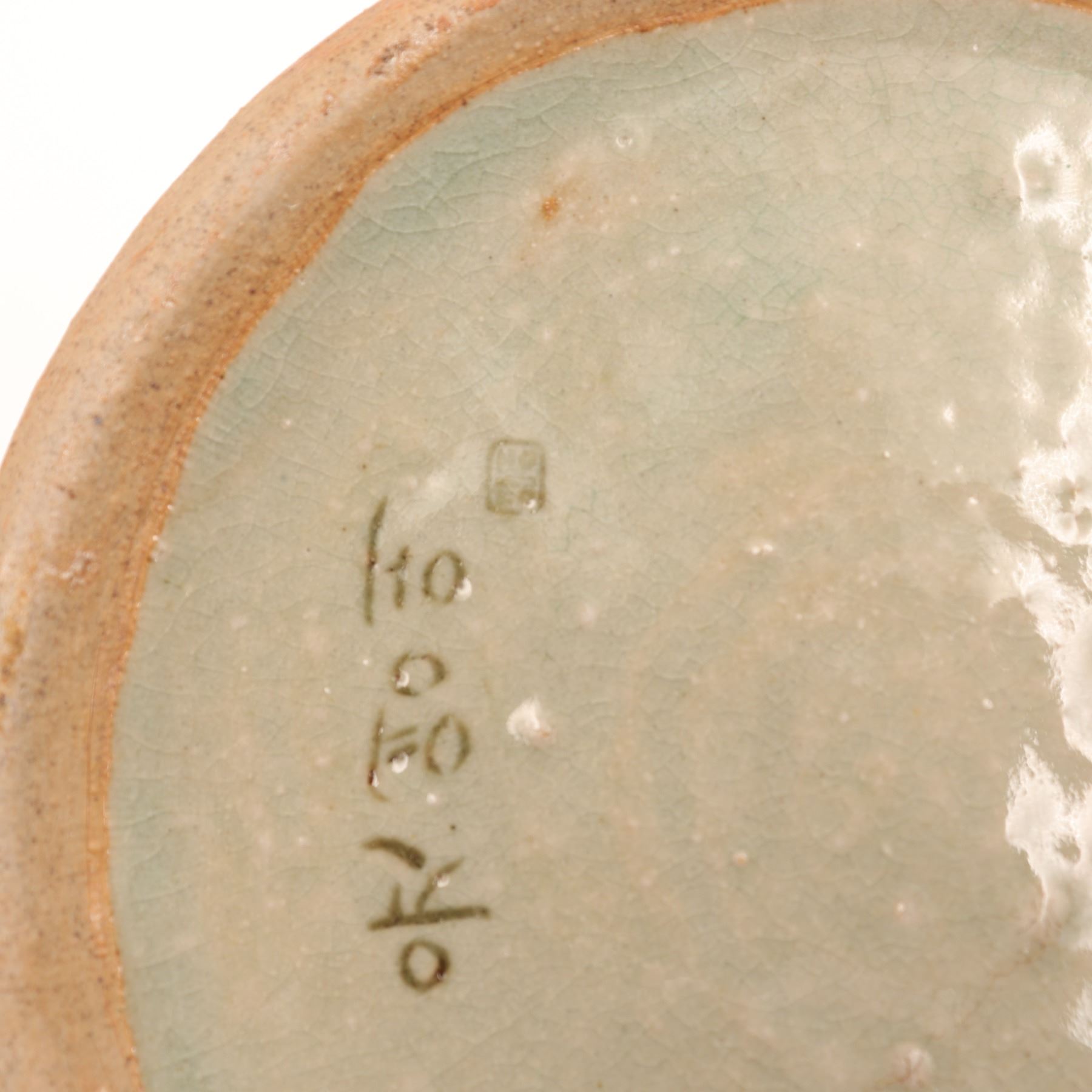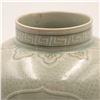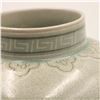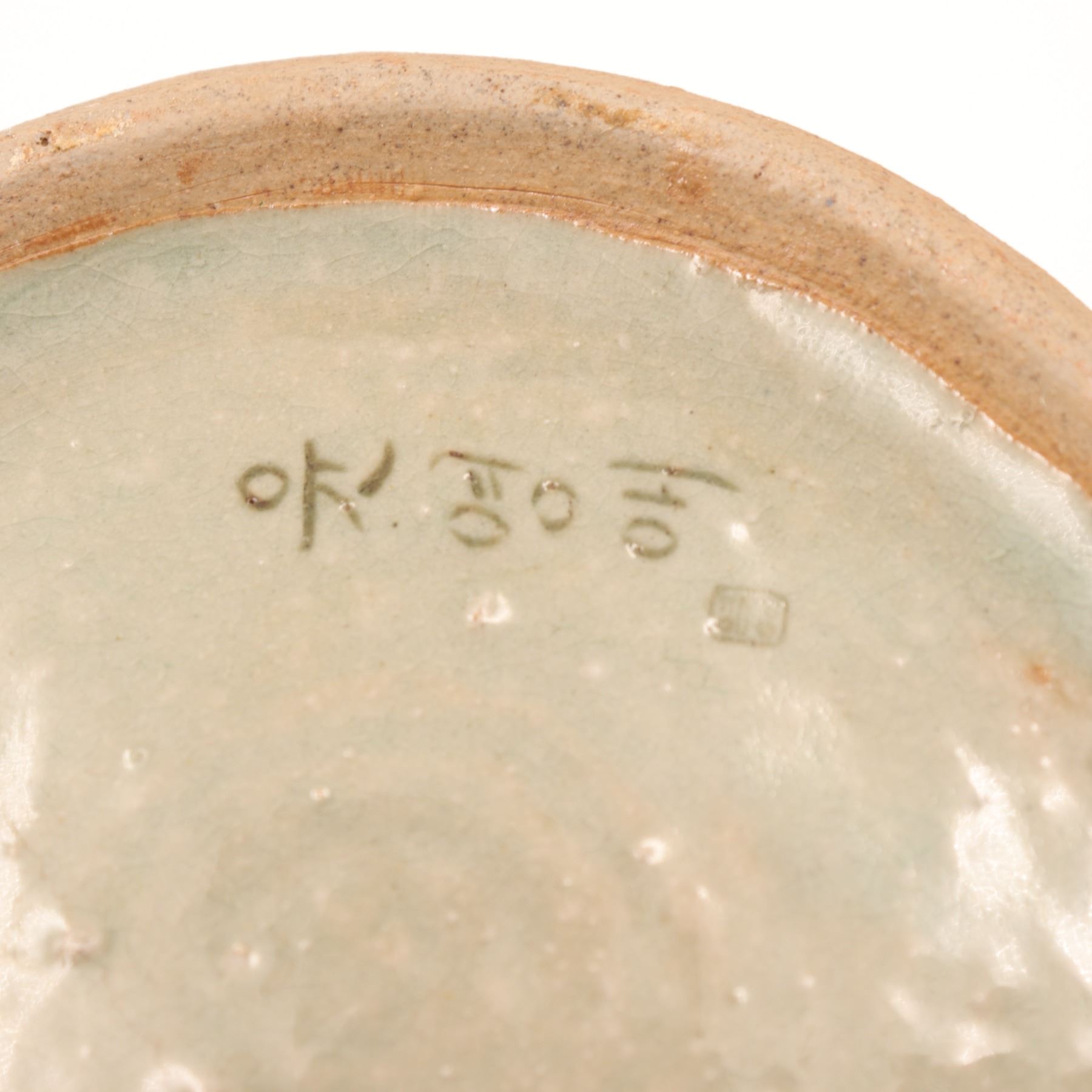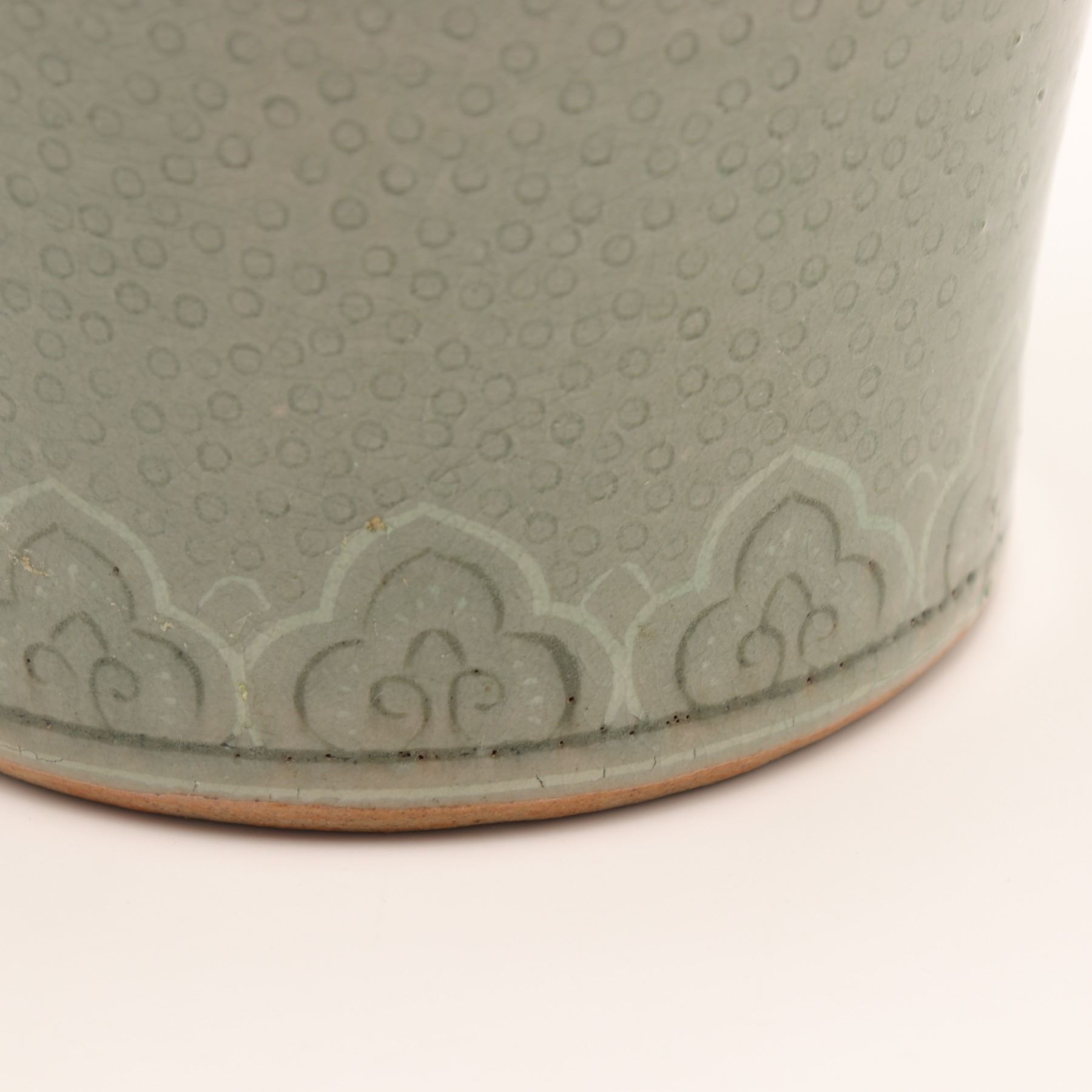 Hand-thrown Korean celadon glazed stoneware vase, ovoid form with short straight neck and slightly flared mouth, the pale blue-green glaze with allover crackle. The body is decorated in reserved cartouche panels with a subtle inlaid scene of ducks swimming among reeds, framed by a scalloped border. The surrounding ground carries a dense pattern of small raised dots, above a band of stylized petal lappets around the foot. The neck is encircled by a key-fret border and the shoulder with a cloud-lappet motif. The base is fully glazed with an unglazed footrim, inscribed with Korean characters and an impressed seal mark, indicating studio or artist production. A fine modern interpretation of traditional Goryeo-style celadon. Condition: no chips, hairline cracks, or restorations observed under normal inspection; glaze with intentional allover crazing typical of this ware, with a few darker craze lines more visible on the base; minor firing imperfections including small pinholes and glaze bubbles, especially to the underside, and a few tiny iron specks in the glaze; very light surface wear to the footrim from display. Height approx. 11 in.; max. diameter approx. 6 1/2 in.