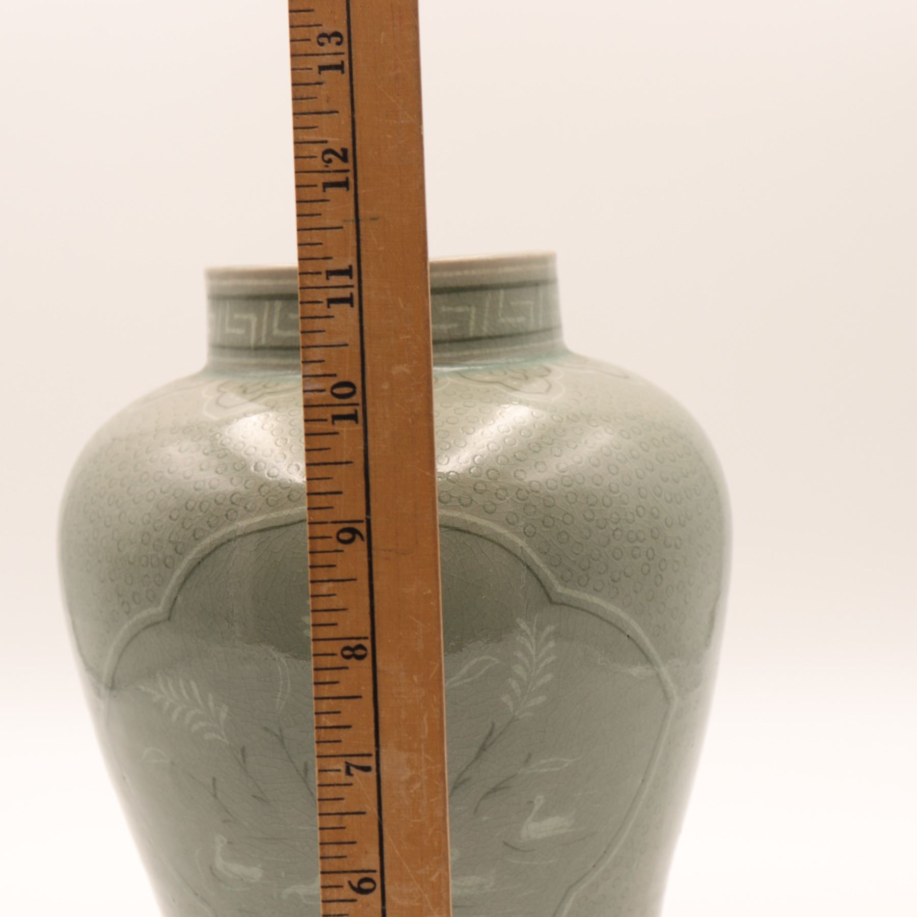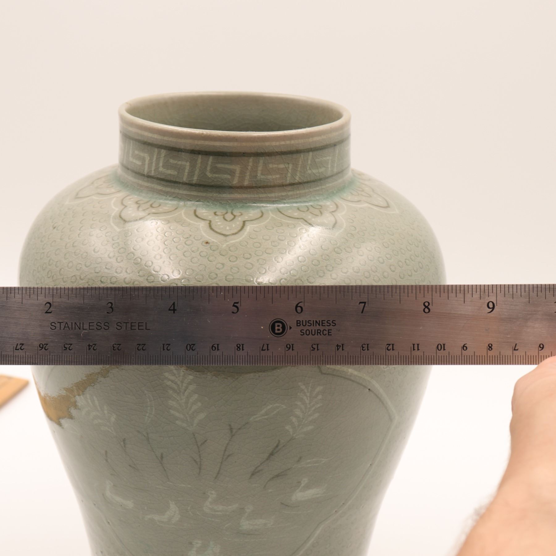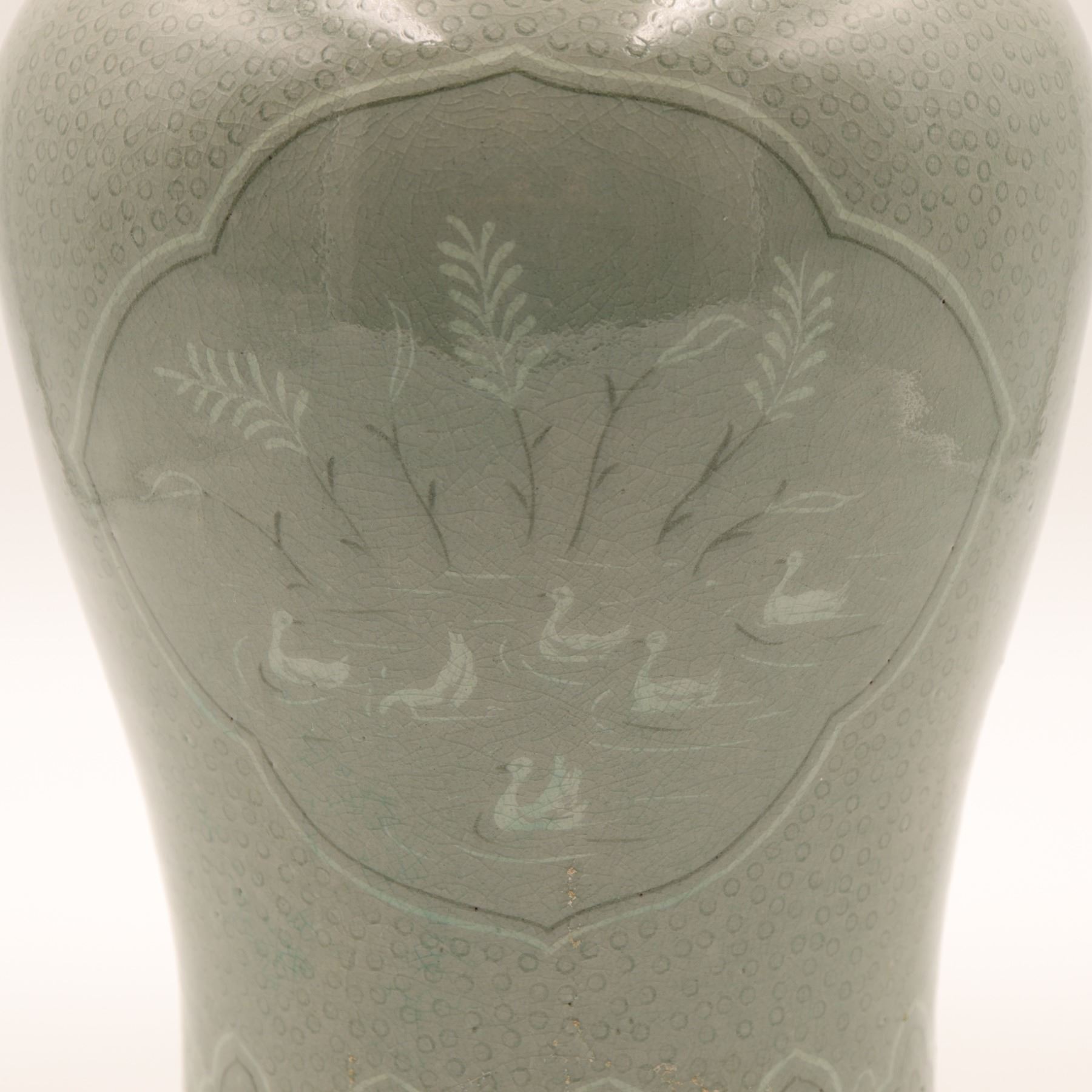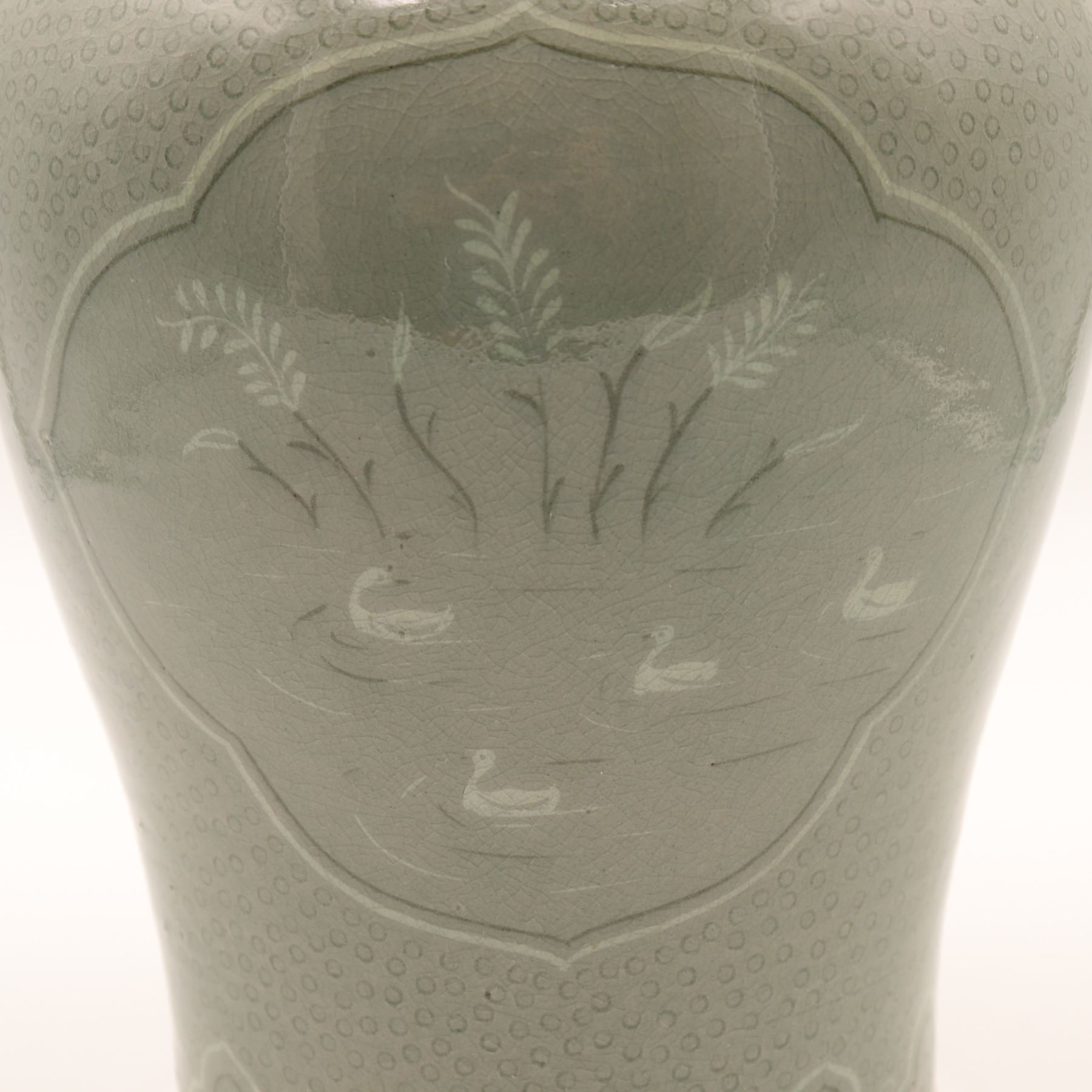 Signed Korean Celadon Vase with Inlaid Duck and Reed Decoration