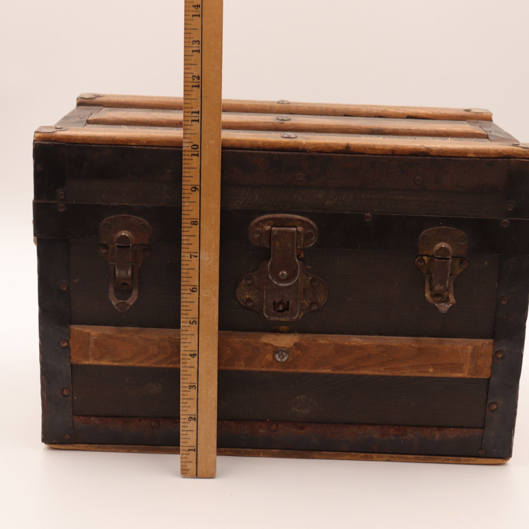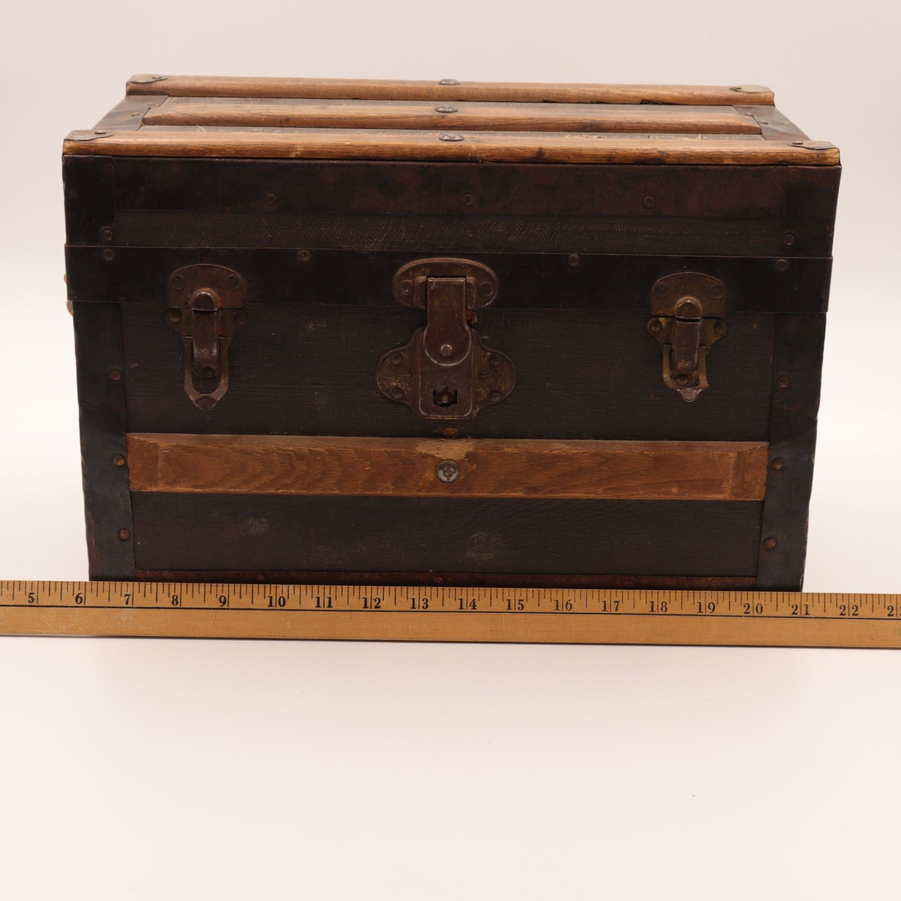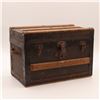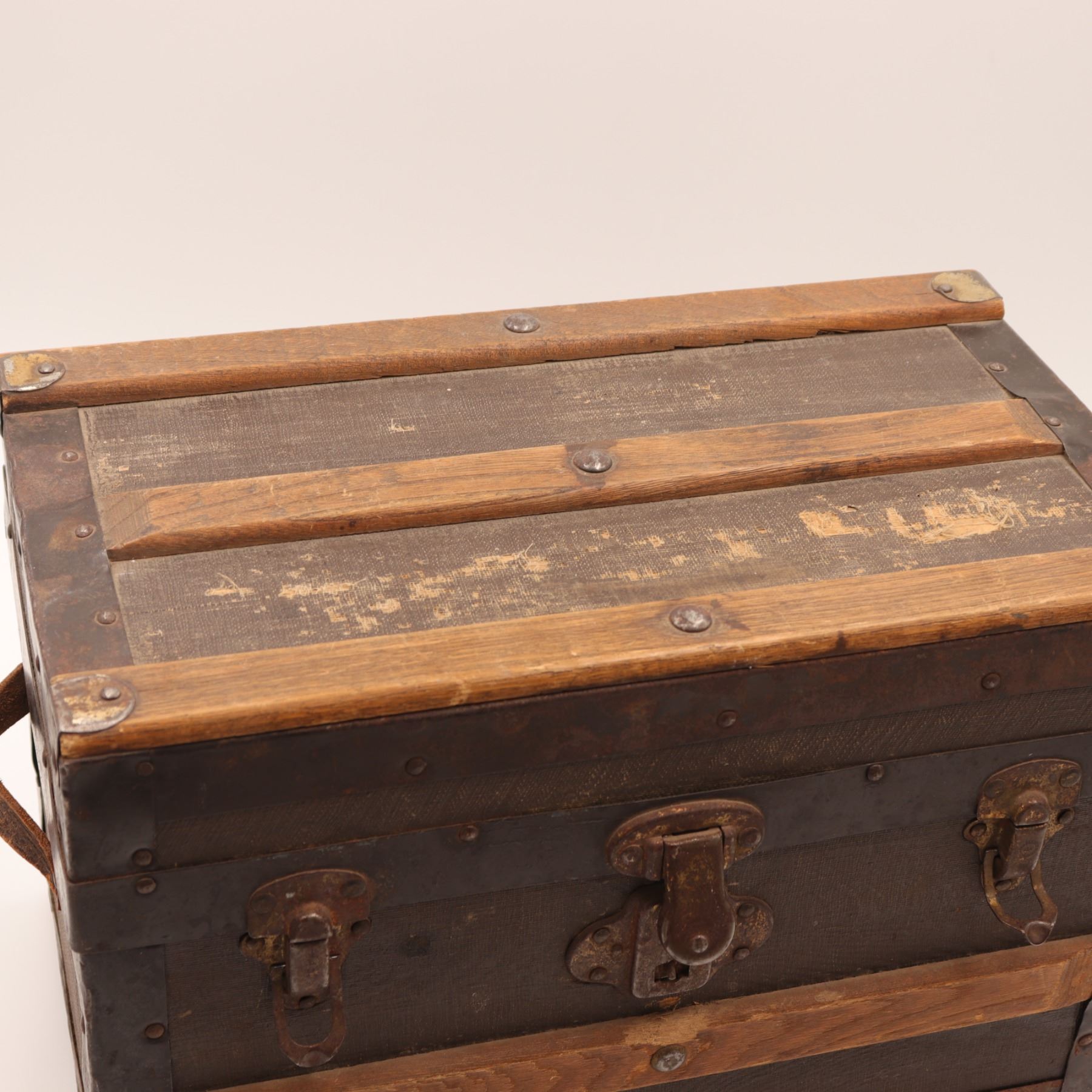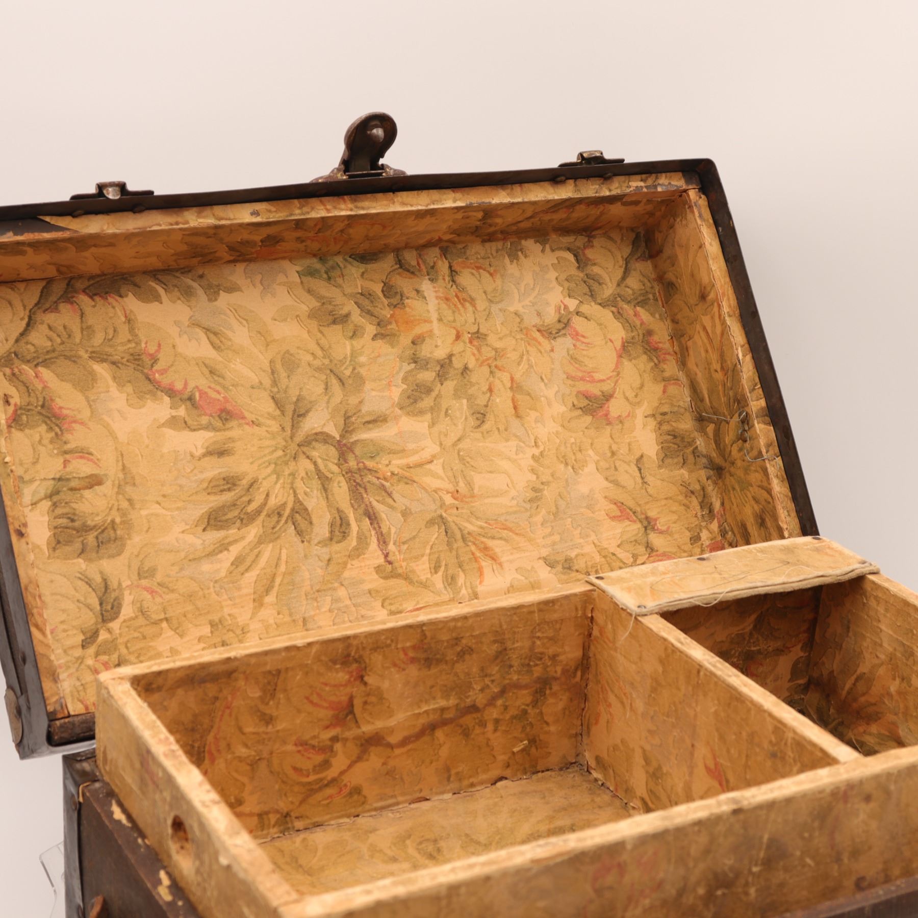 Late 19th–early 20th century small travelling trunk, wood carcase covered in textured canvas with nailed iron strapwork and pine slats to the domed lid; original leather side grips; interior lined in printed floral wallpaper with a removable divided tray. Three front latches with a central lock plate (key lacking). Honest surface, attractive patina.