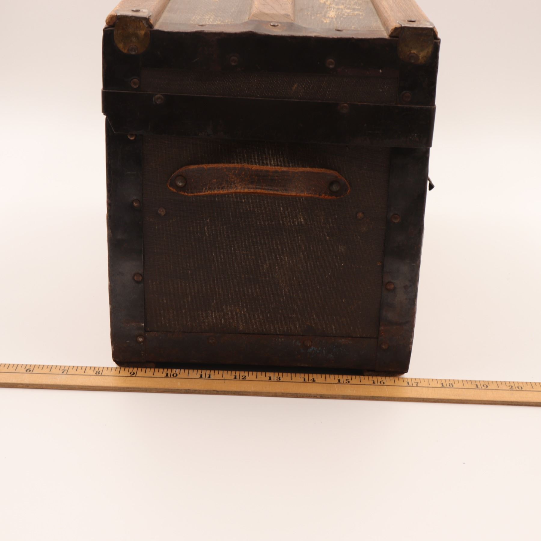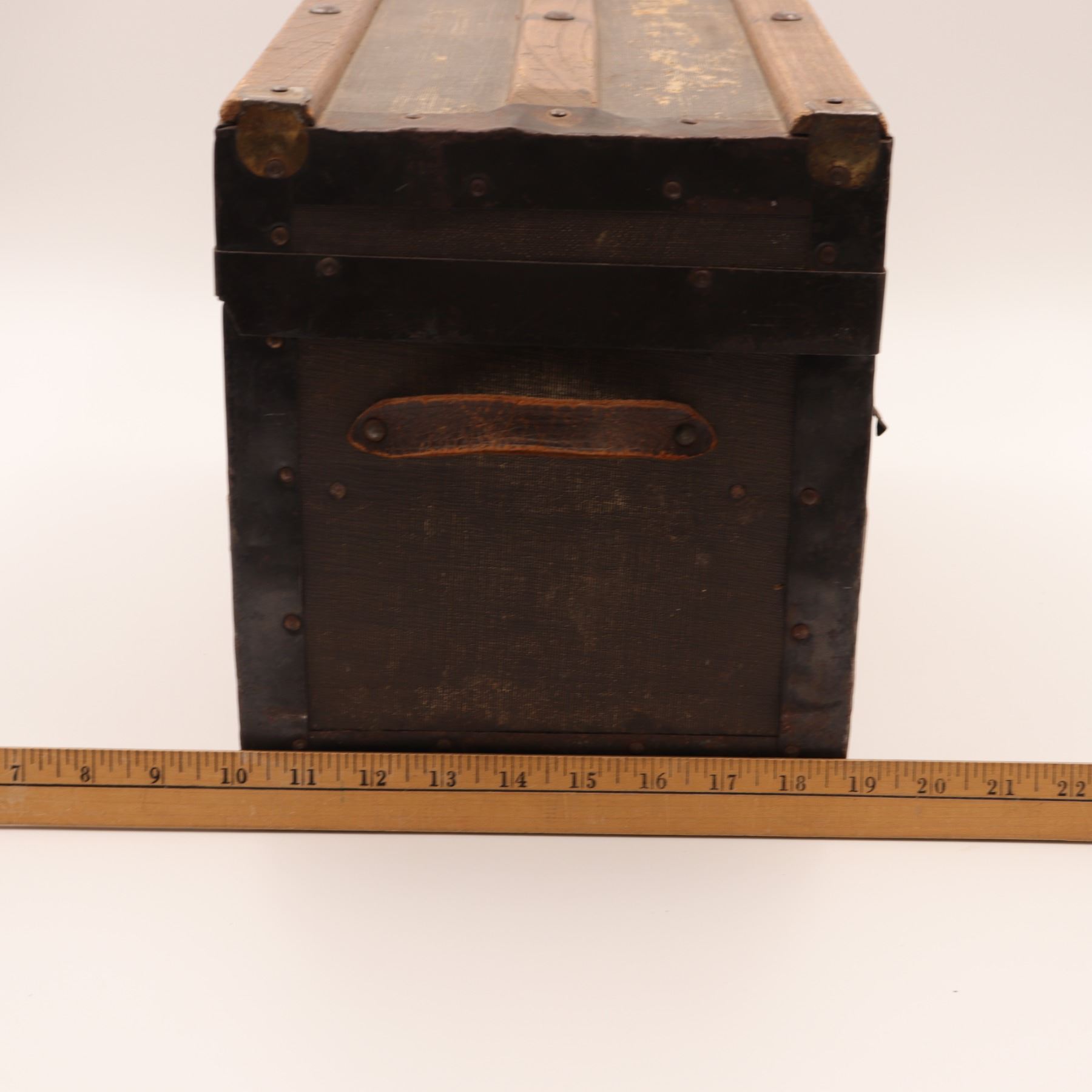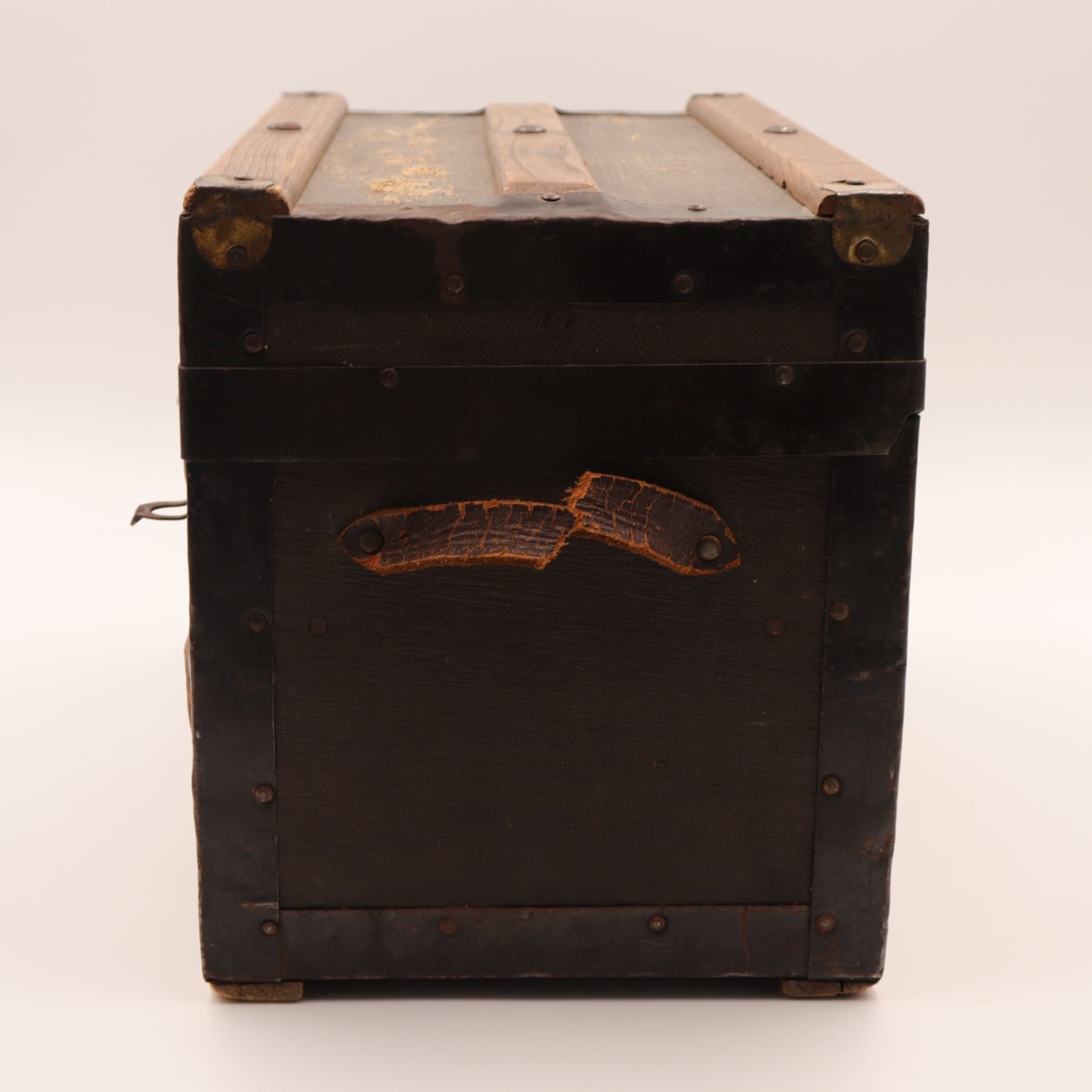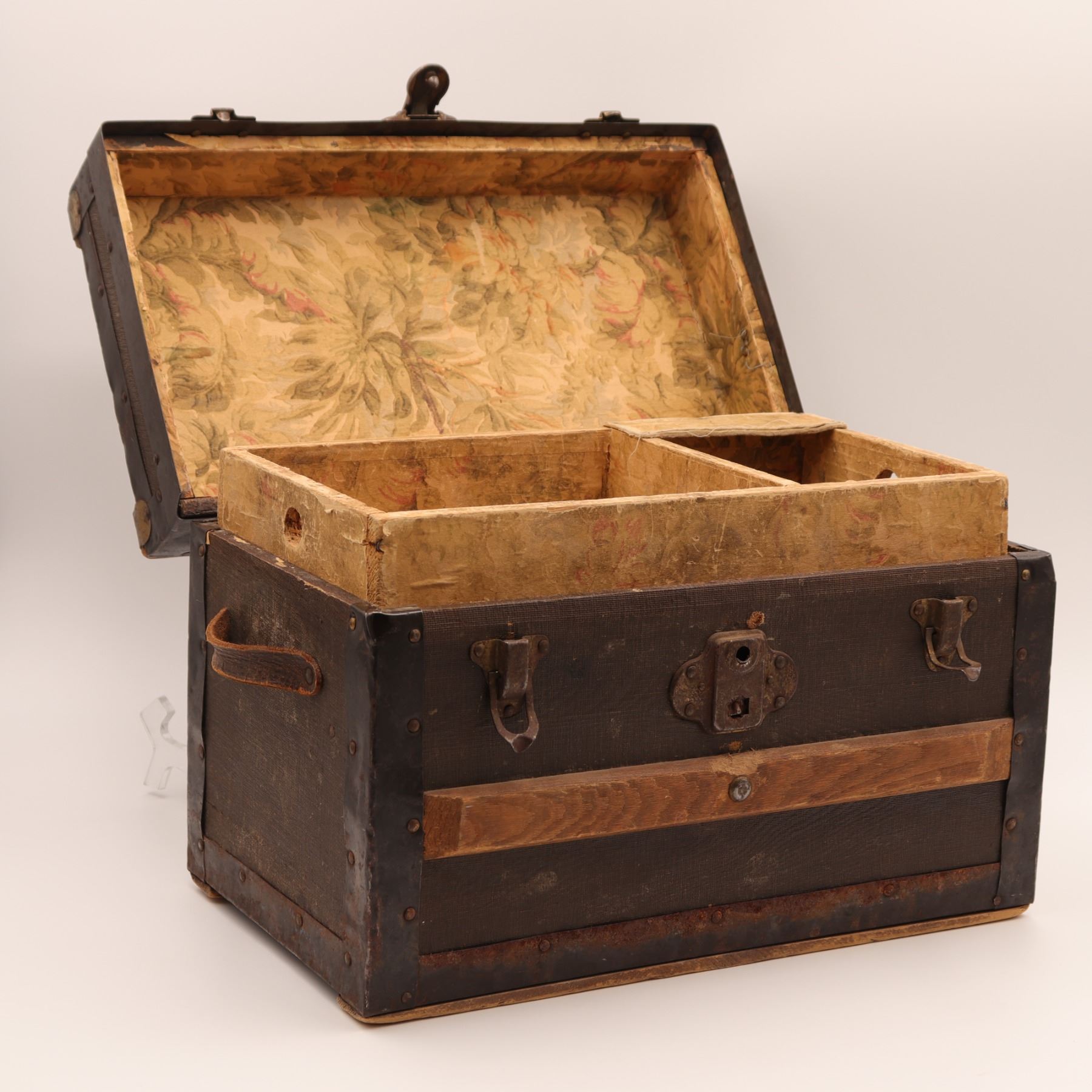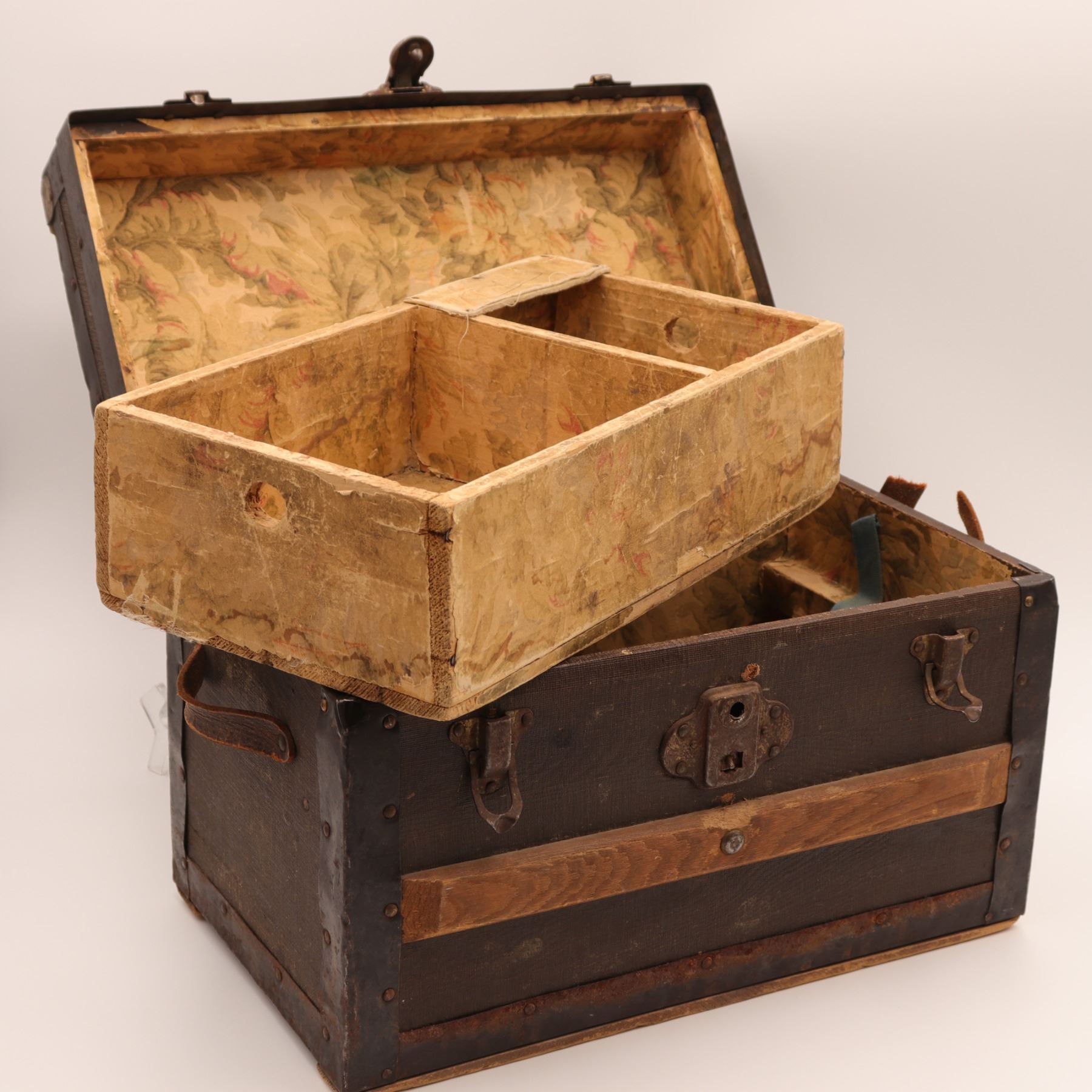 Construction & features: nailed iron banding; applied wooden slats; leather loop side handles; papered interior; tray with finger holes and small compartment.