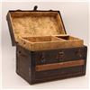 Small “cabin” trunks of this type were popular for short journeys ca. 1880–1915. The pressed-pattern canvas covering, iron strapwork and wallpaper lining are consistent with that period.