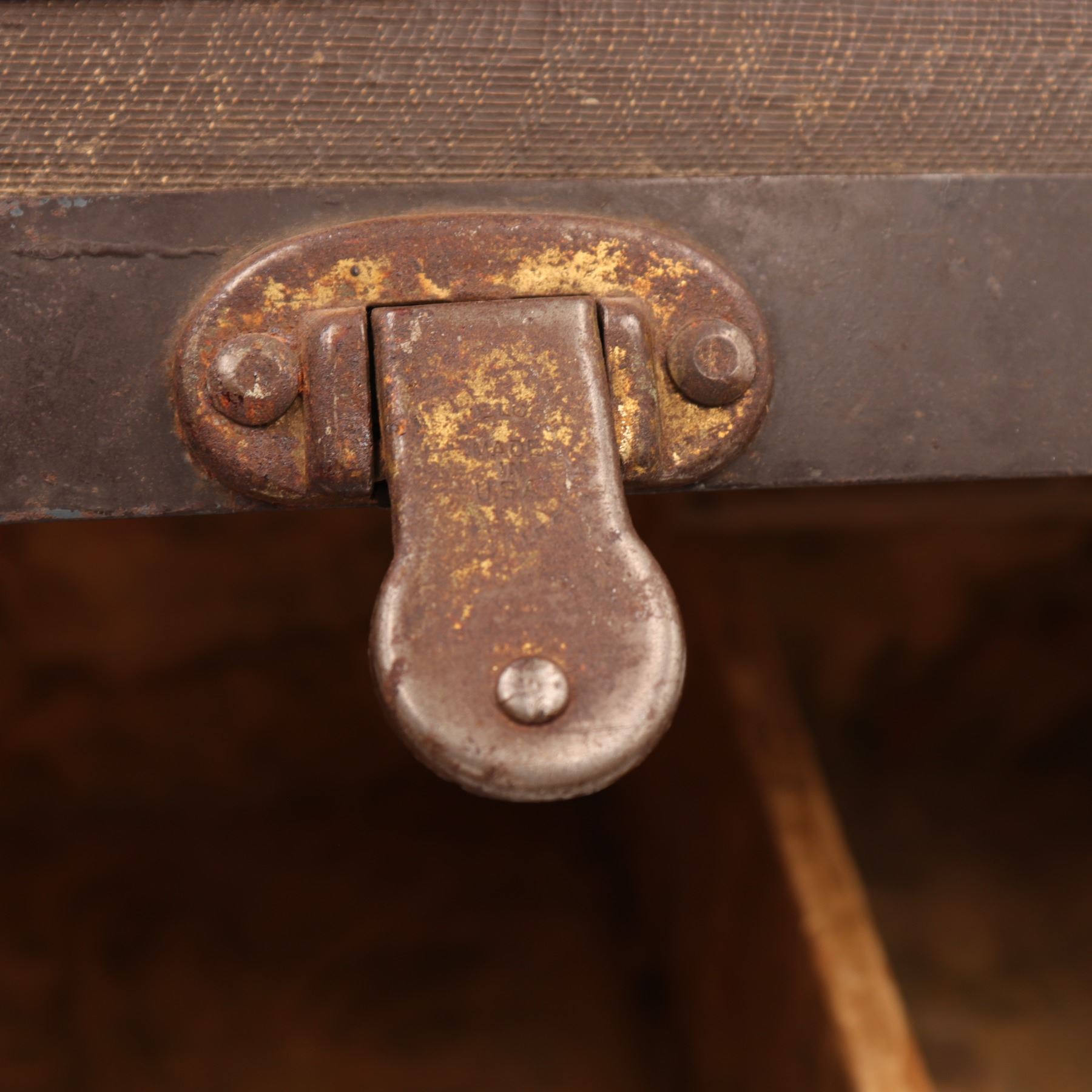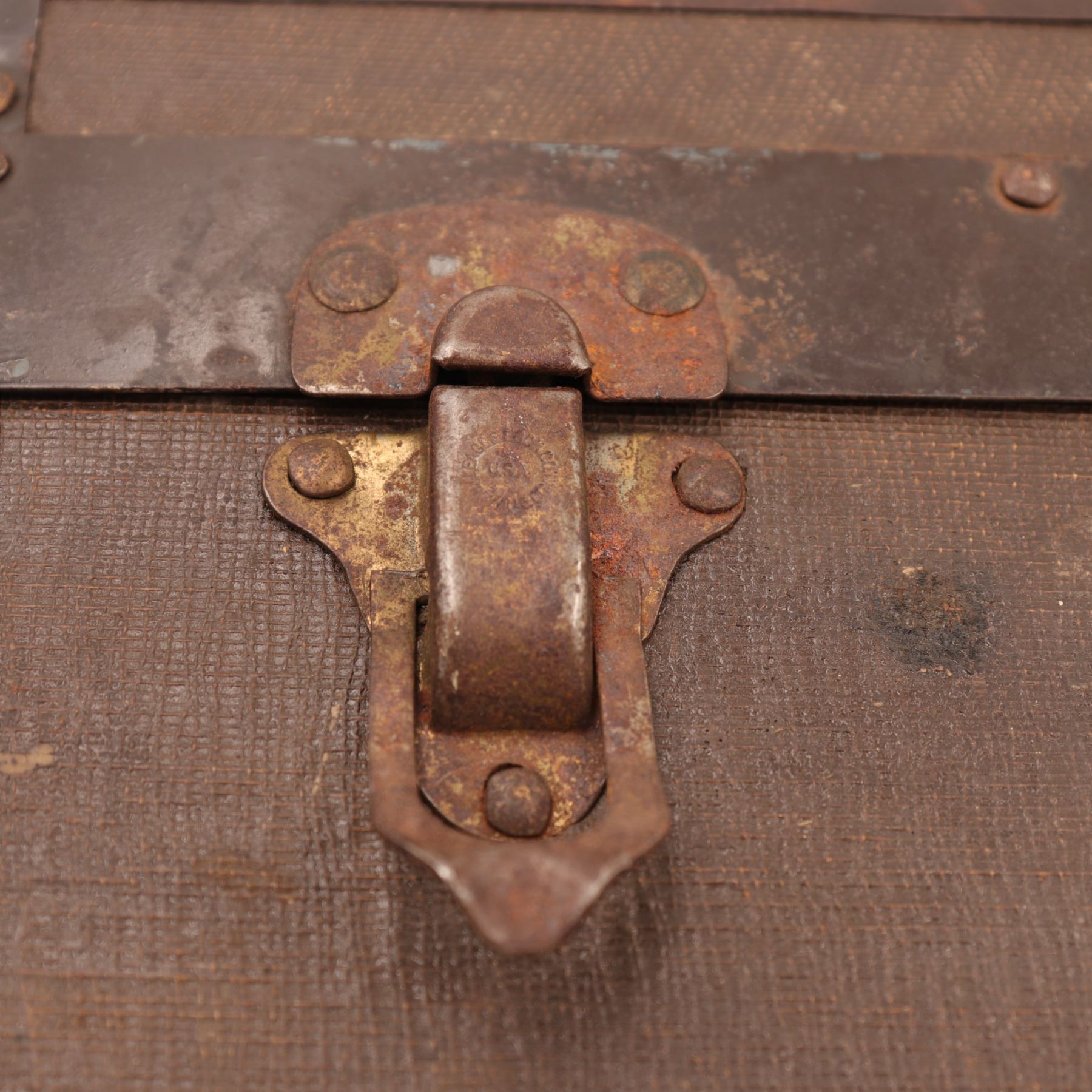 The style of latches/lock is similar to hardware made by Eagle Lock Co., Terryville, CT—the company supplied a vast range of trunk locks/hasps in the early 1900s (see Eagle Lock Co. catalogues, e.g., 1910s–1928 editions).