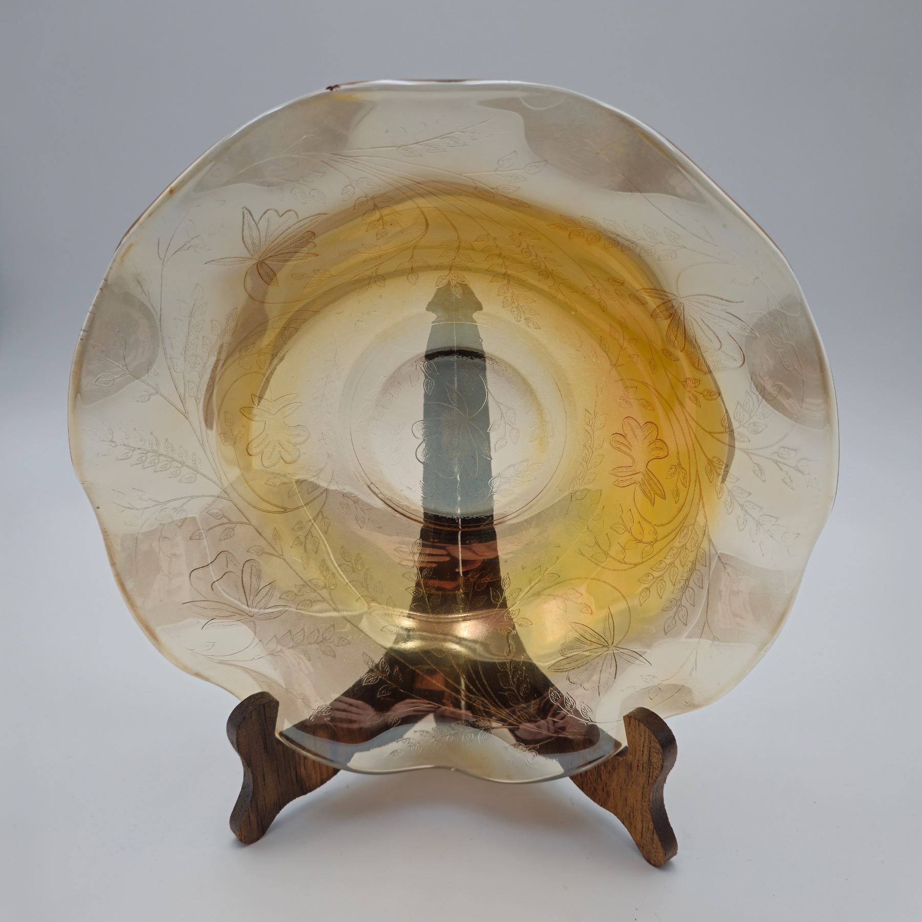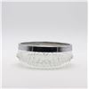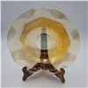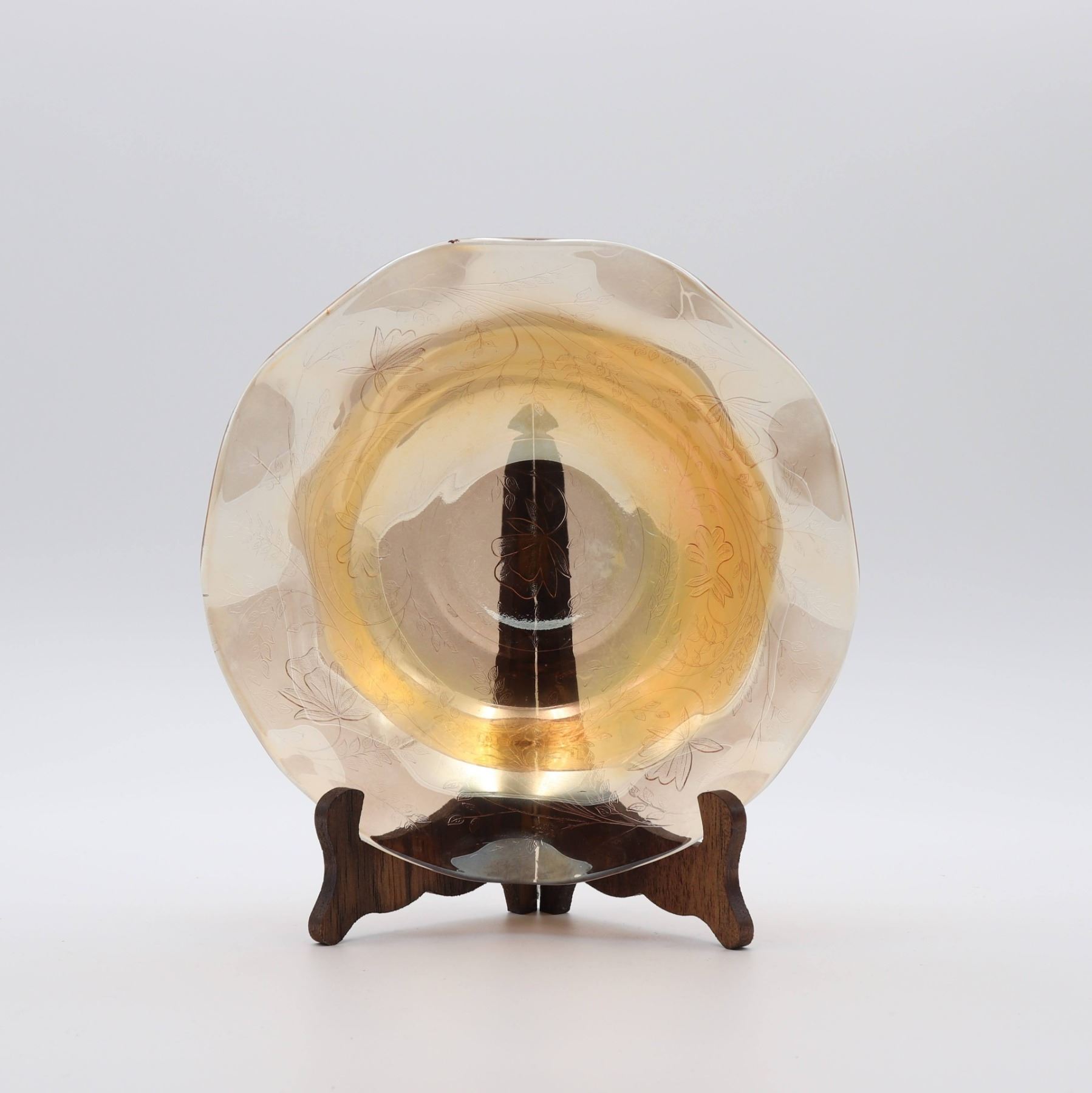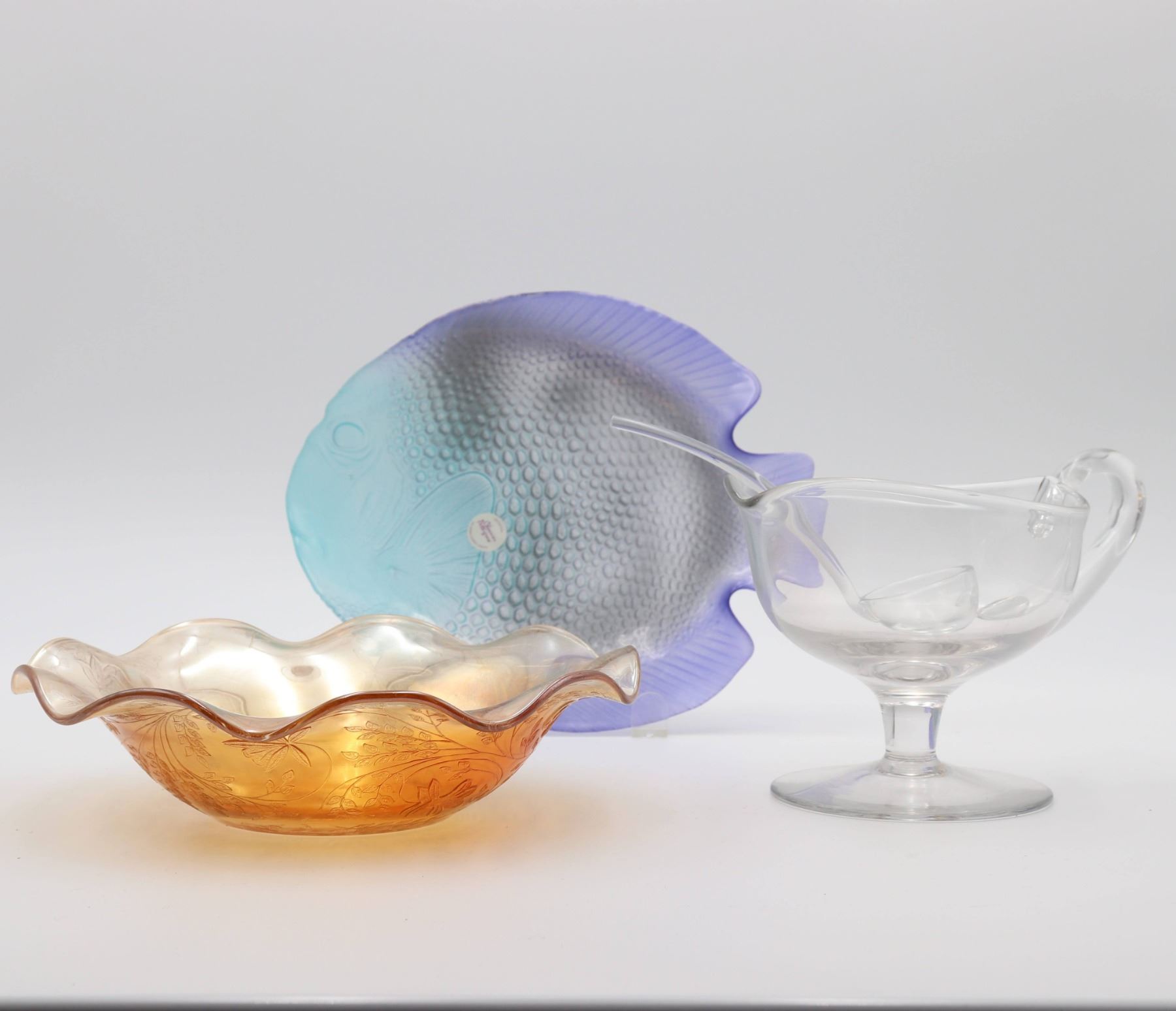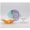 Glass footed saucer with ladle, fish plate, silver rimmed bowl, iridescent scalloped edge bowl
