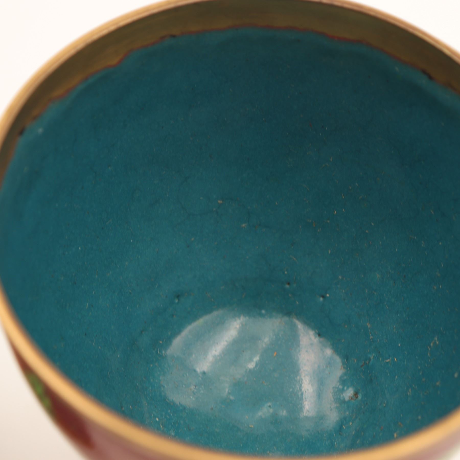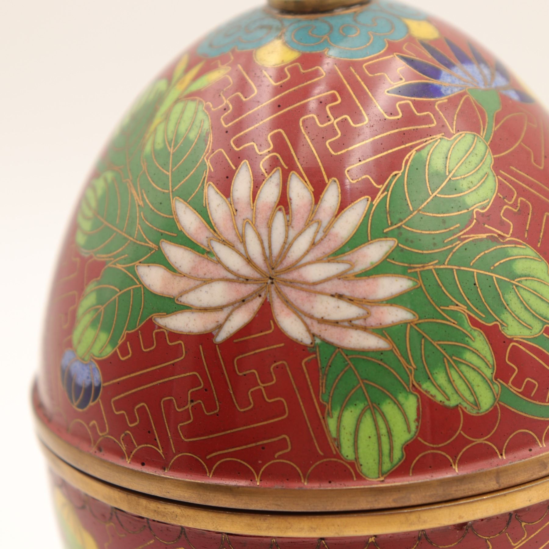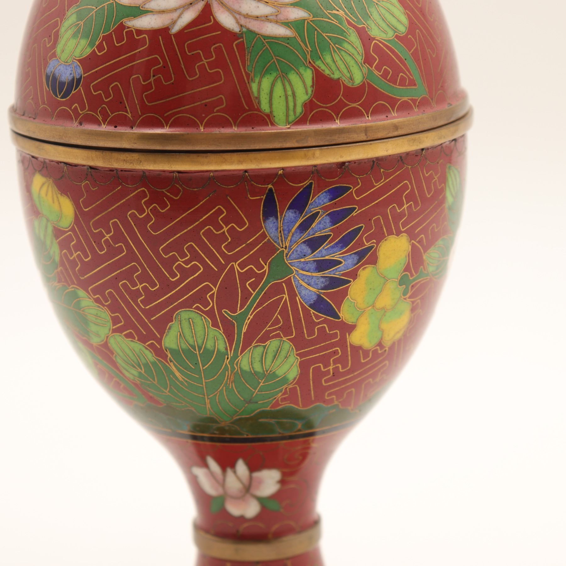 A striking Chinese cloisonné covered cup in the form of an egg on a flaring pedestal stand, the exterior decorated with lotus blossoms and scrolling foliage reserved on an iron-red ground filled with key-fret pattern, all picked out in gilt wires. Fitted with a brass finial and rims, the interior finished in turquoise enamel. A colourful mid-century example of Chinese export cloisonné, impressive in height and presence.
