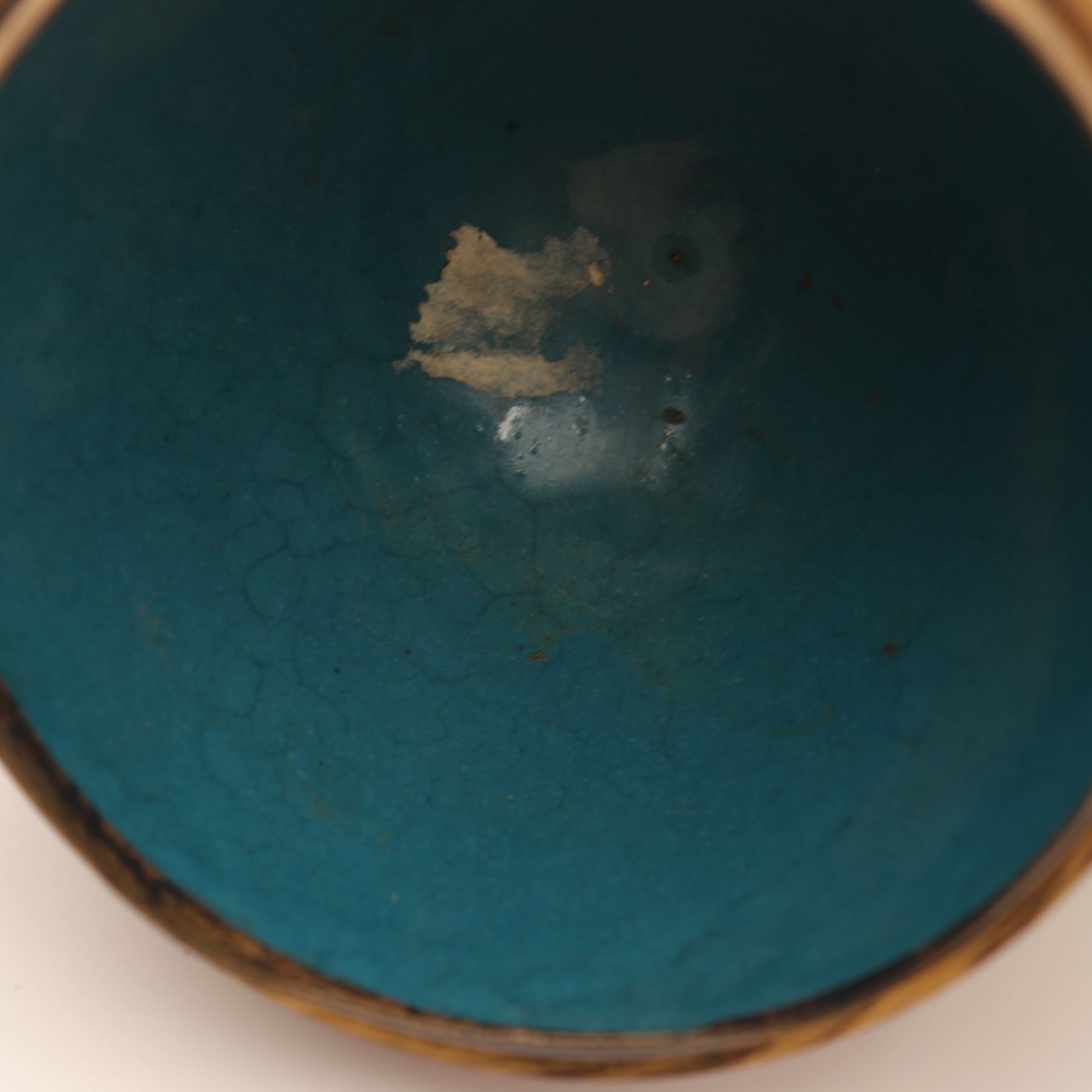 Condition: Very good condition with bright, intact enamels; minor manufacturing pits and light rubbing/tarnish to the brass mounts; no apparent chips, cracks, or repairs.