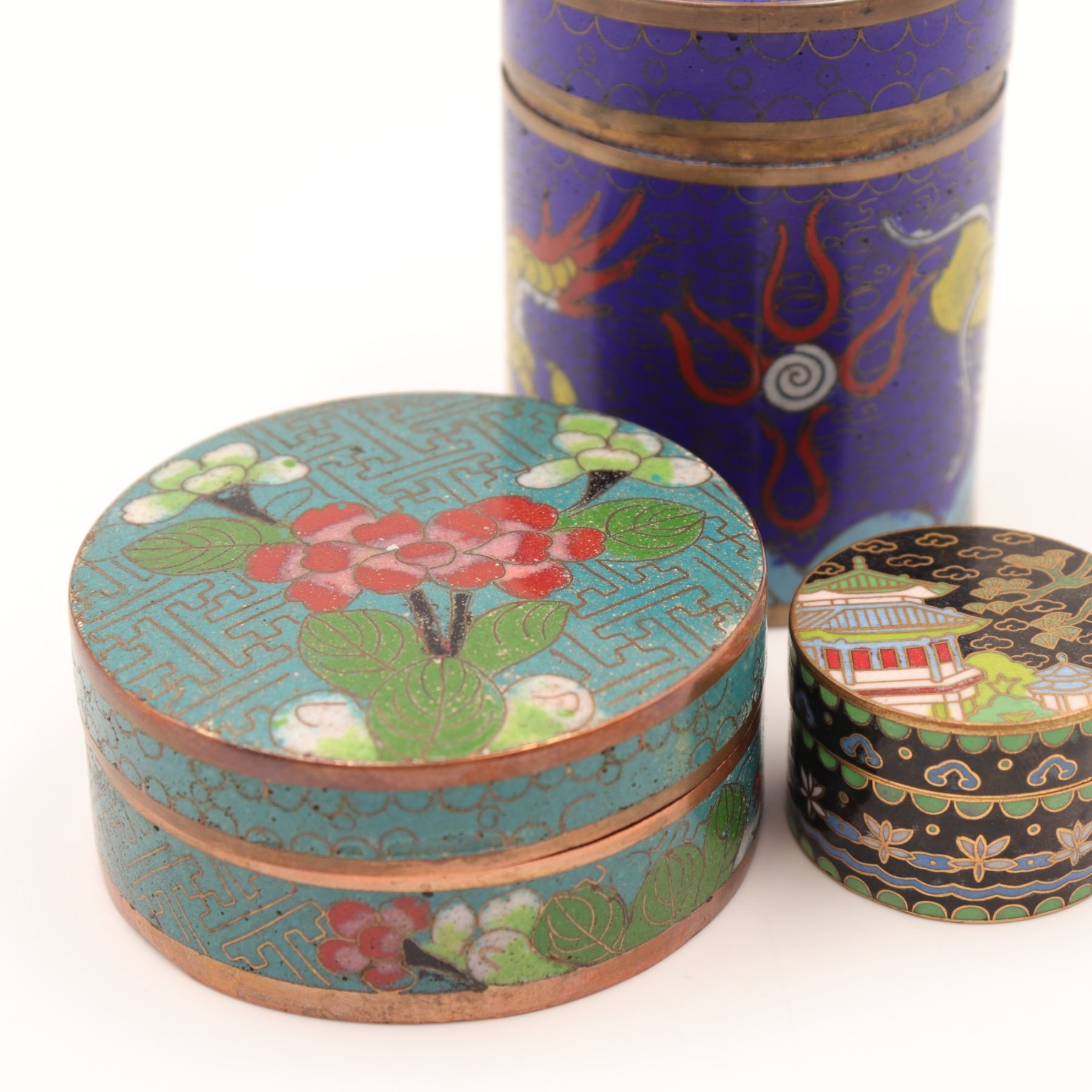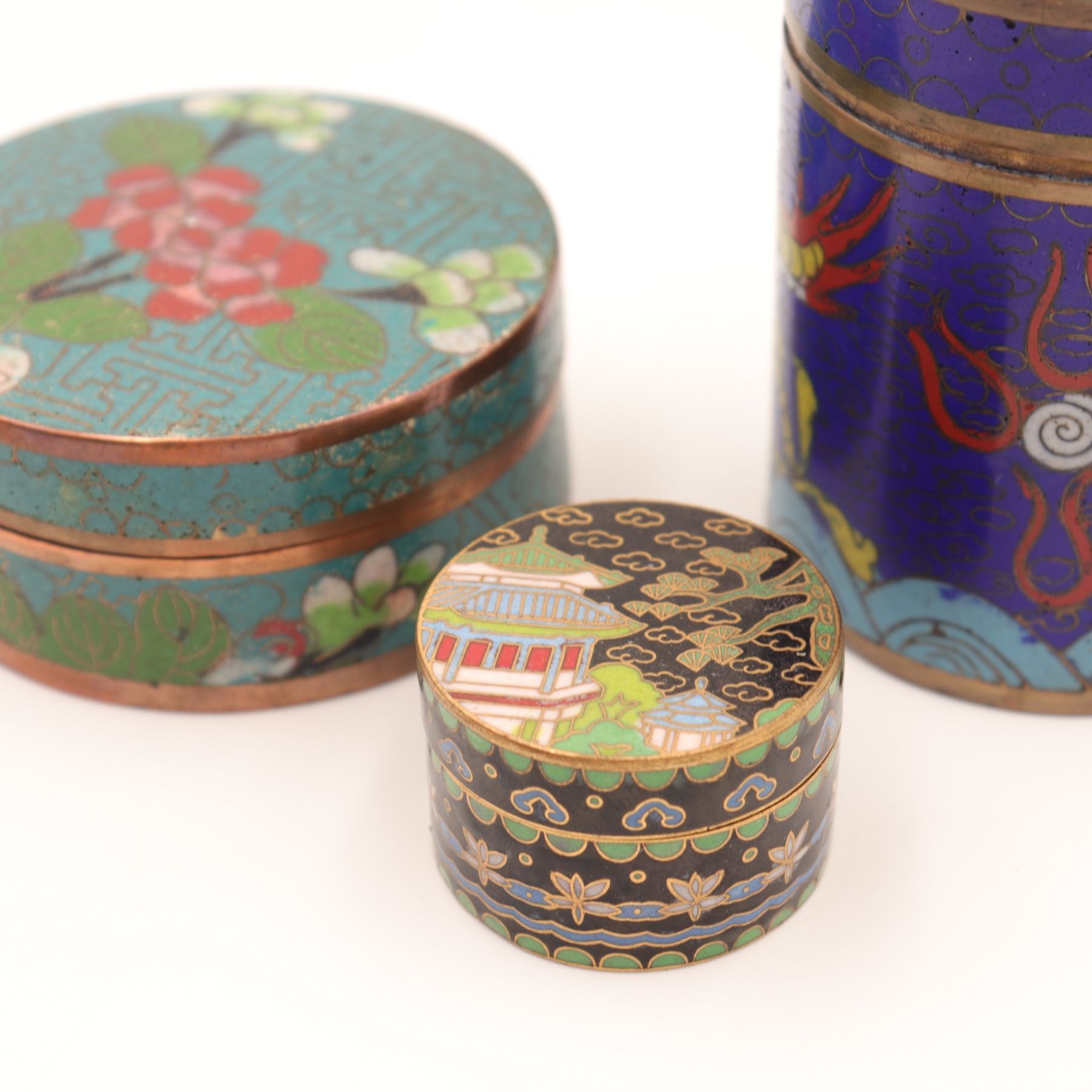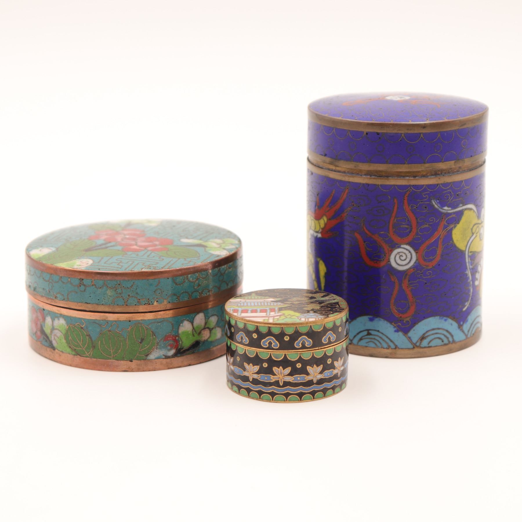 Group of three Chinese cloisonné circular covered boxes, comprising a taller cylindrical example decorated with dragons and flaming pearls on a deep blue ground, and two lower circular boxes with turquoise and black grounds, each decorated with flowers, foliage and geometric borders. All with turquoise enamel interiors and gilt metal rims. Condition: overall good, with light surface wear, minor enamel pitting and a few tiny losses to high points; interiors with some spotting and tarnish to metal. Heights from approx. 1 1/4 in. to 3 3/4 in.; diameters up to approx. 4 1/2 in.