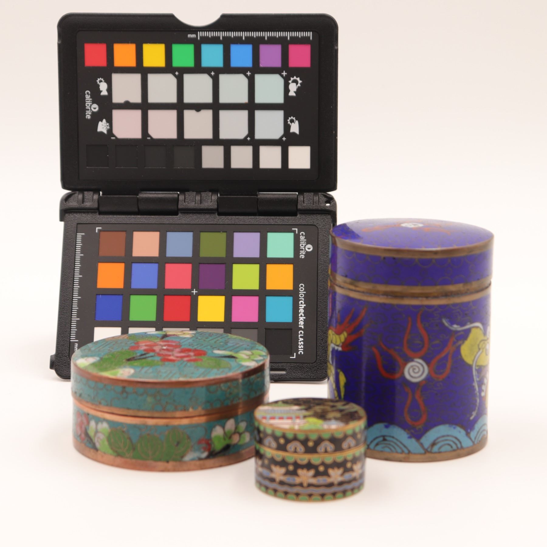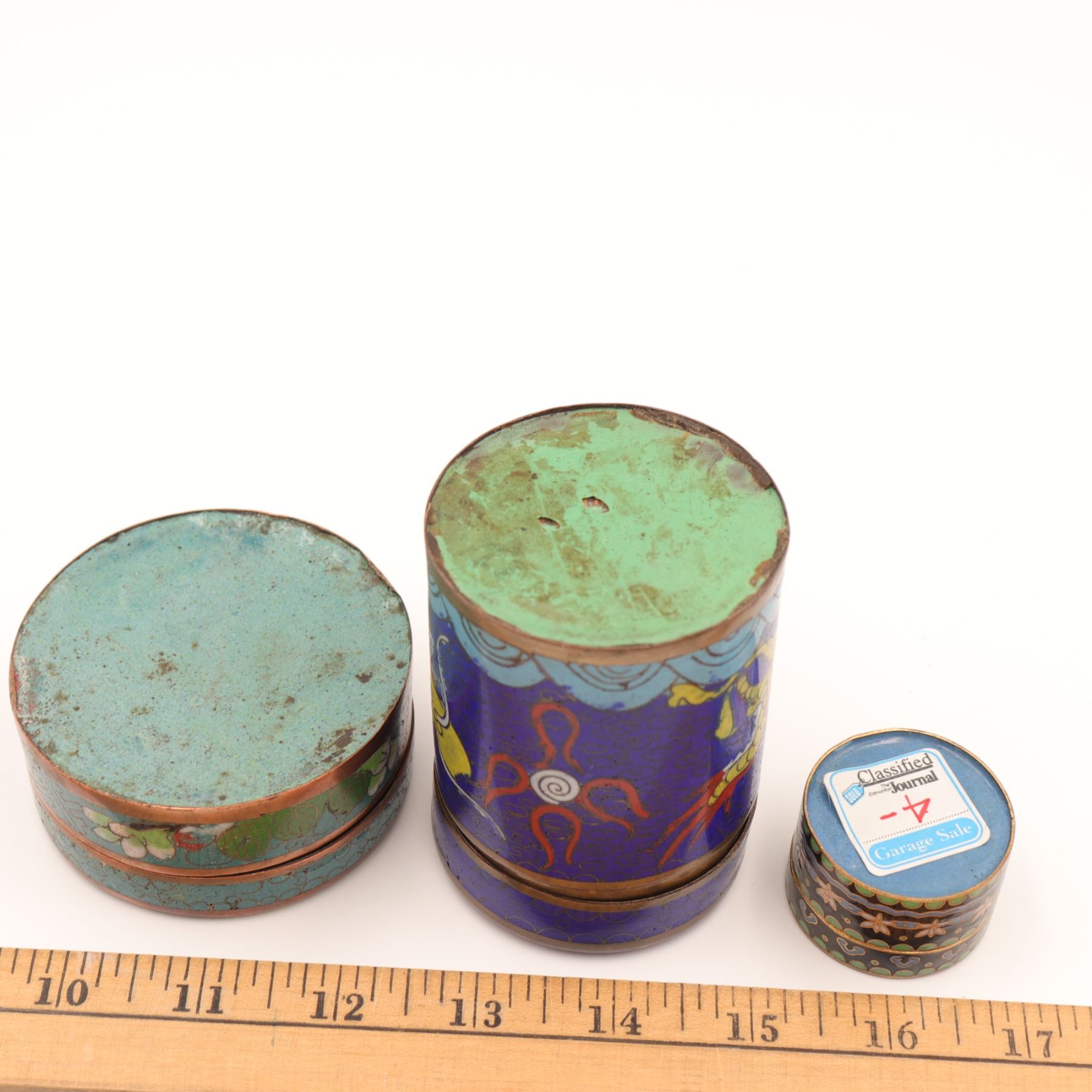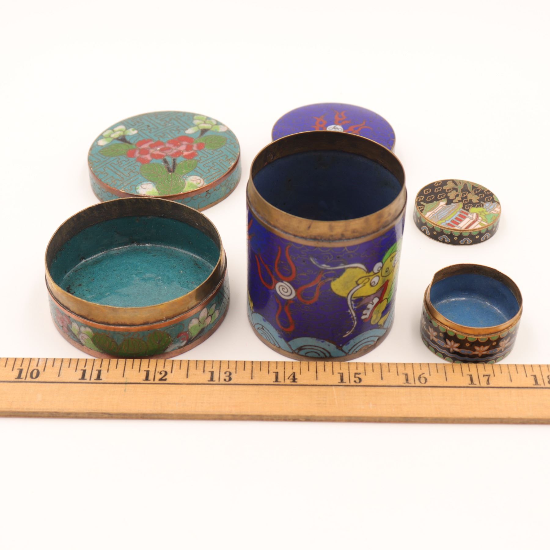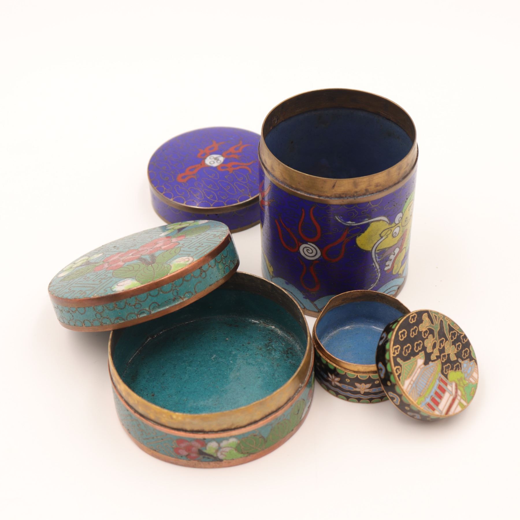 Group of three Chinese cloisonné circular covered boxes, comprising a taller cylindrical example decorated with dragons and flaming pearls on a deep blue ground, and two lower circular boxes with turquoise and black grounds, each decorated with flowers, foliage and geometric borders. All with turquoise enamel interiors and gilt metal rims. Condition: overall good, with light surface wear, minor enamel pitting and a few tiny losses to high points; interiors with some spotting and tarnish to metal. Heights from approx. 1 1/4 in. to 3 3/4 in.; diameters up to approx. 4 1/2 in.