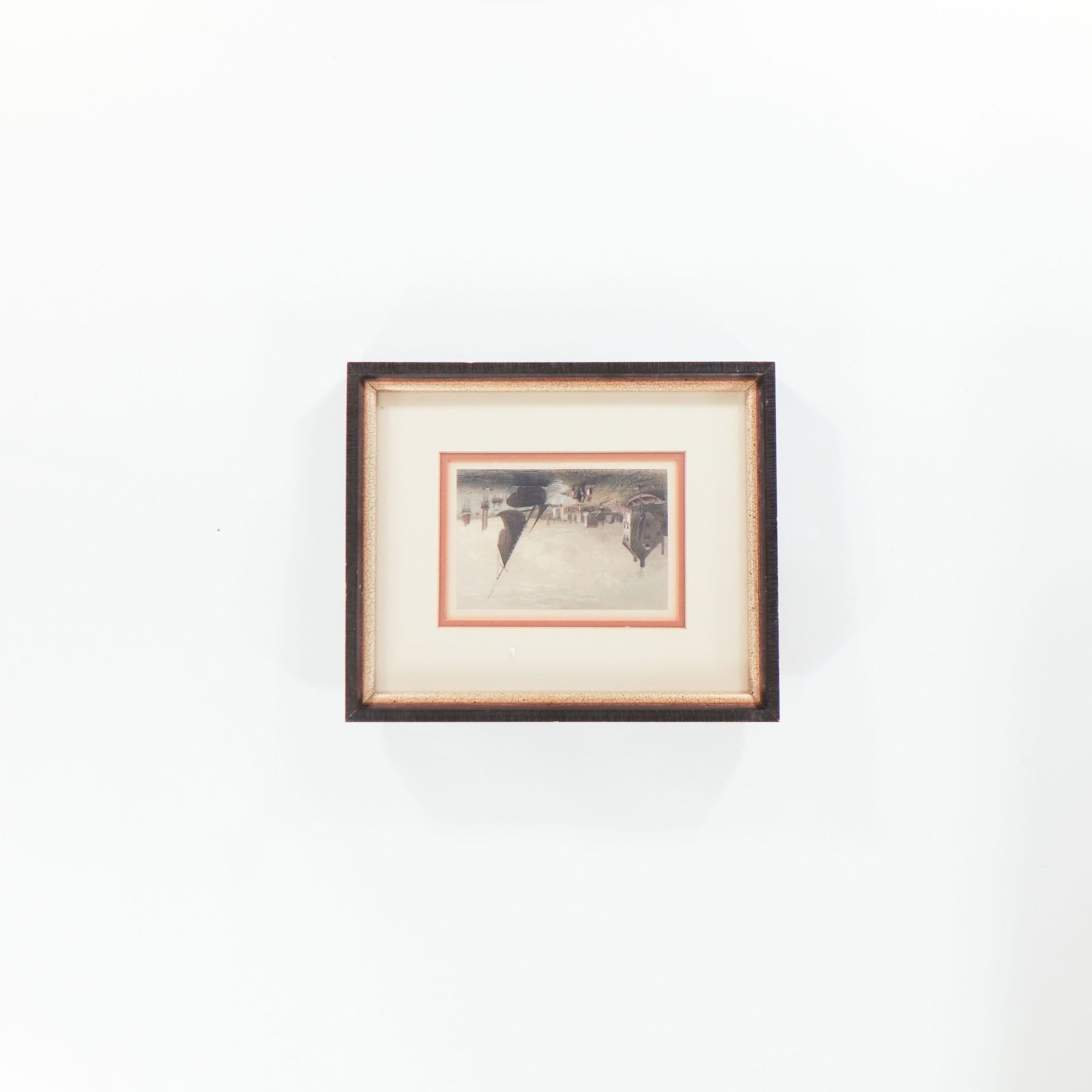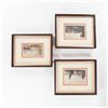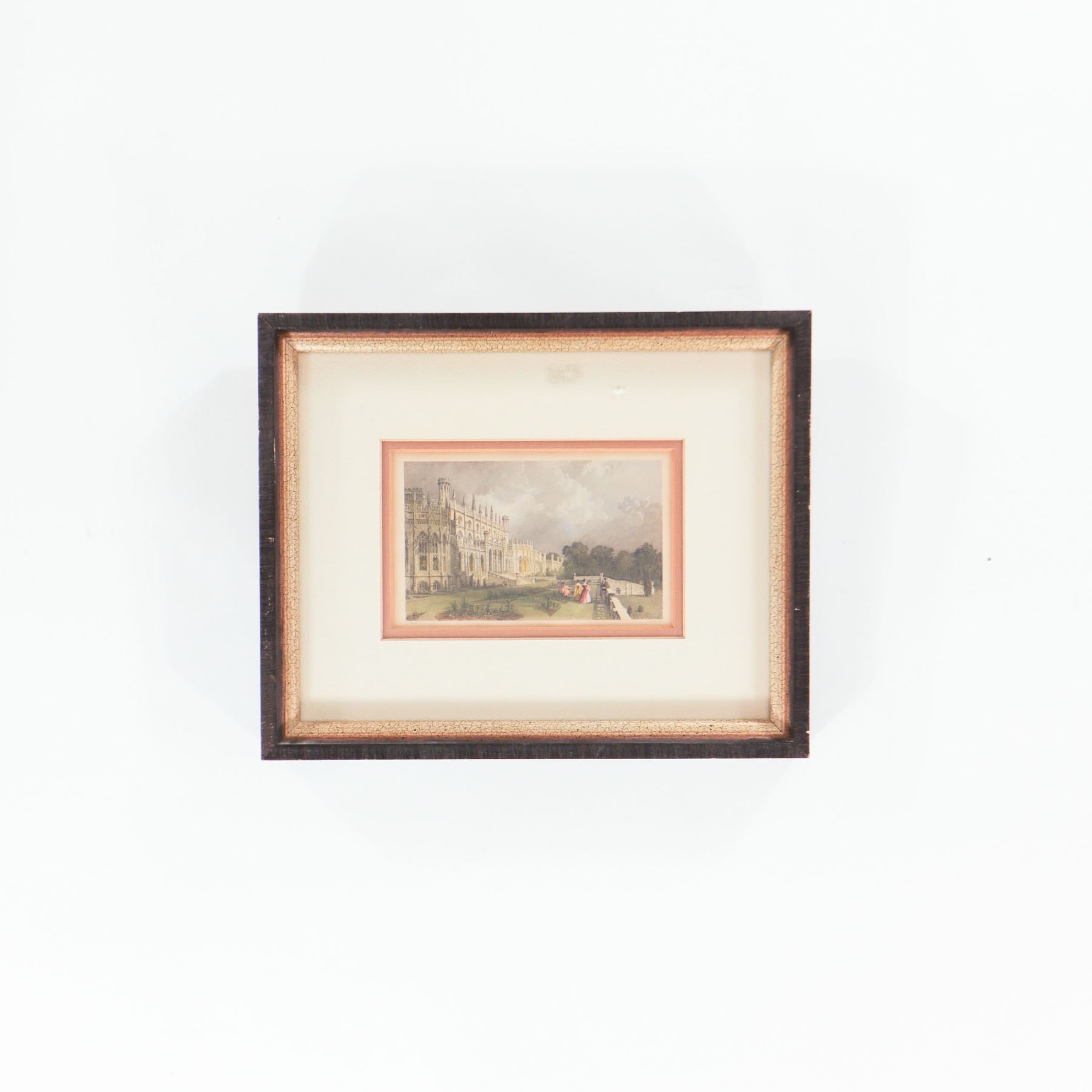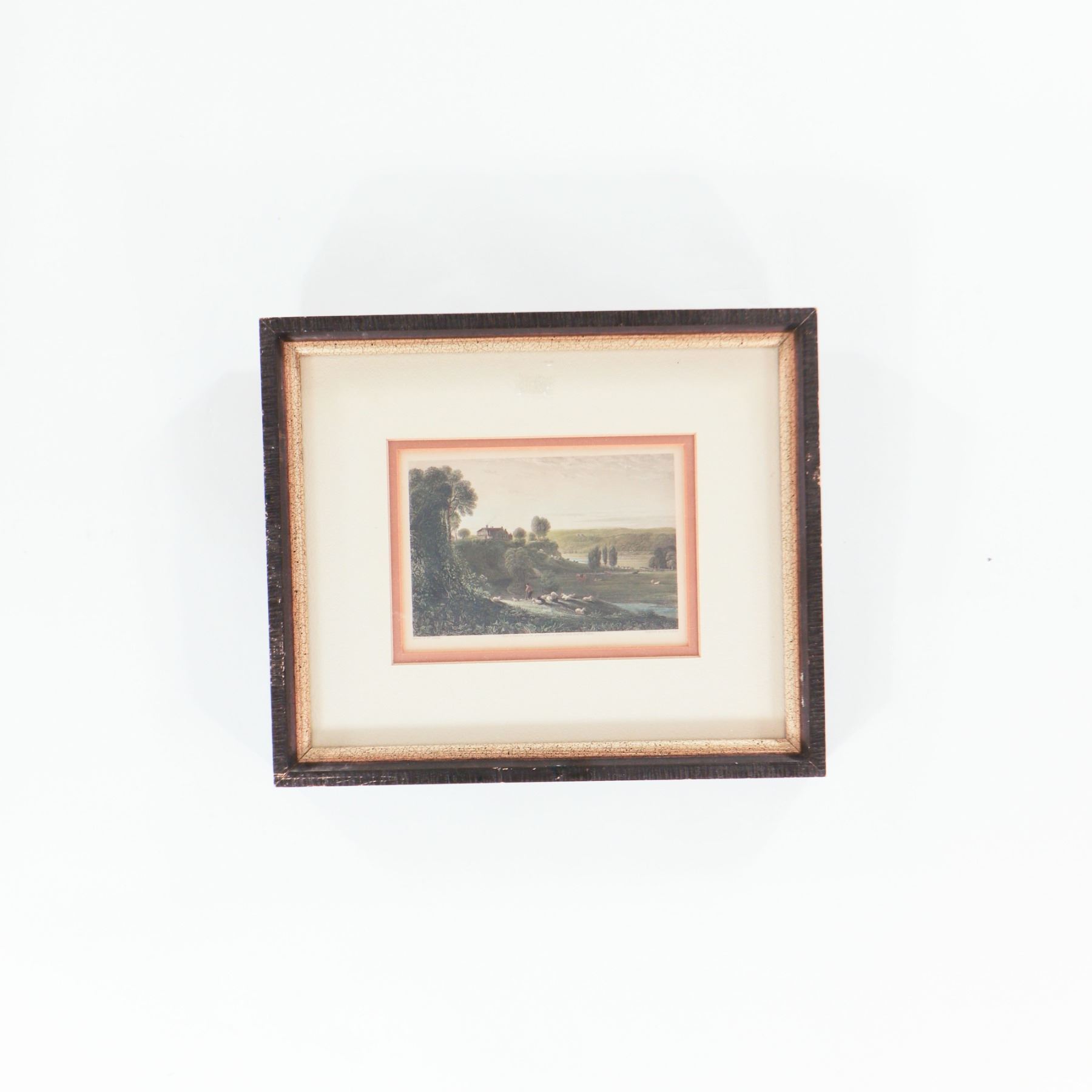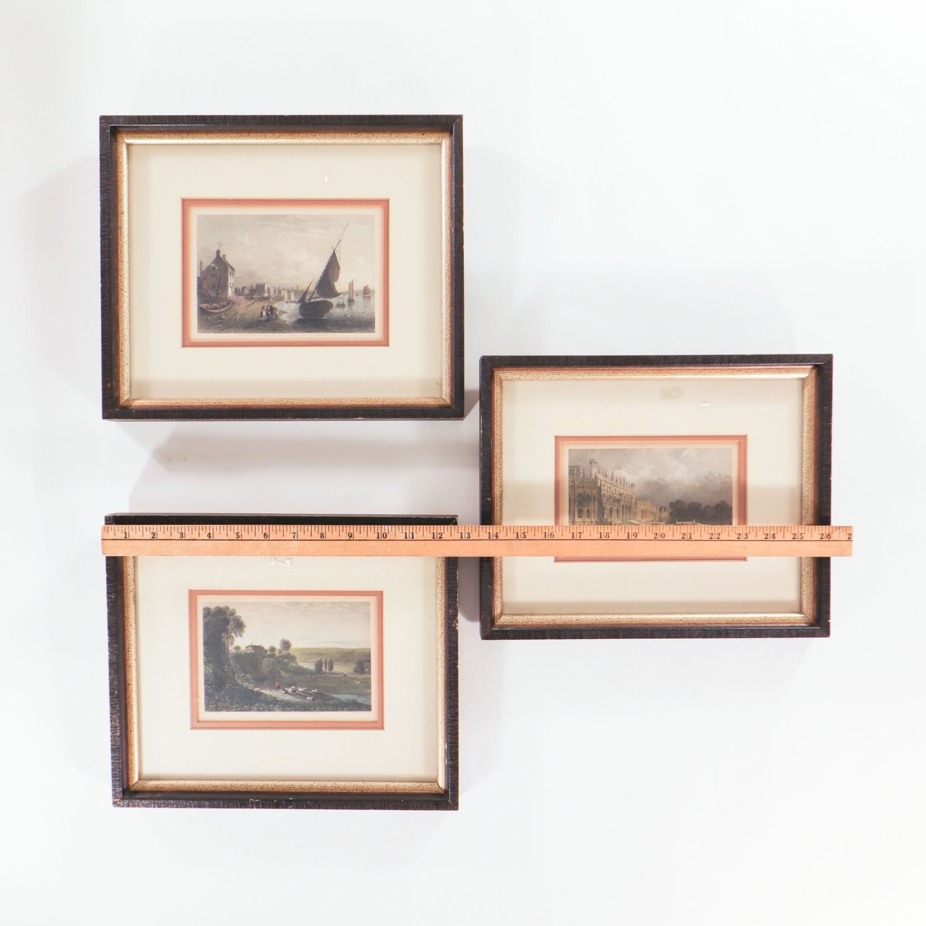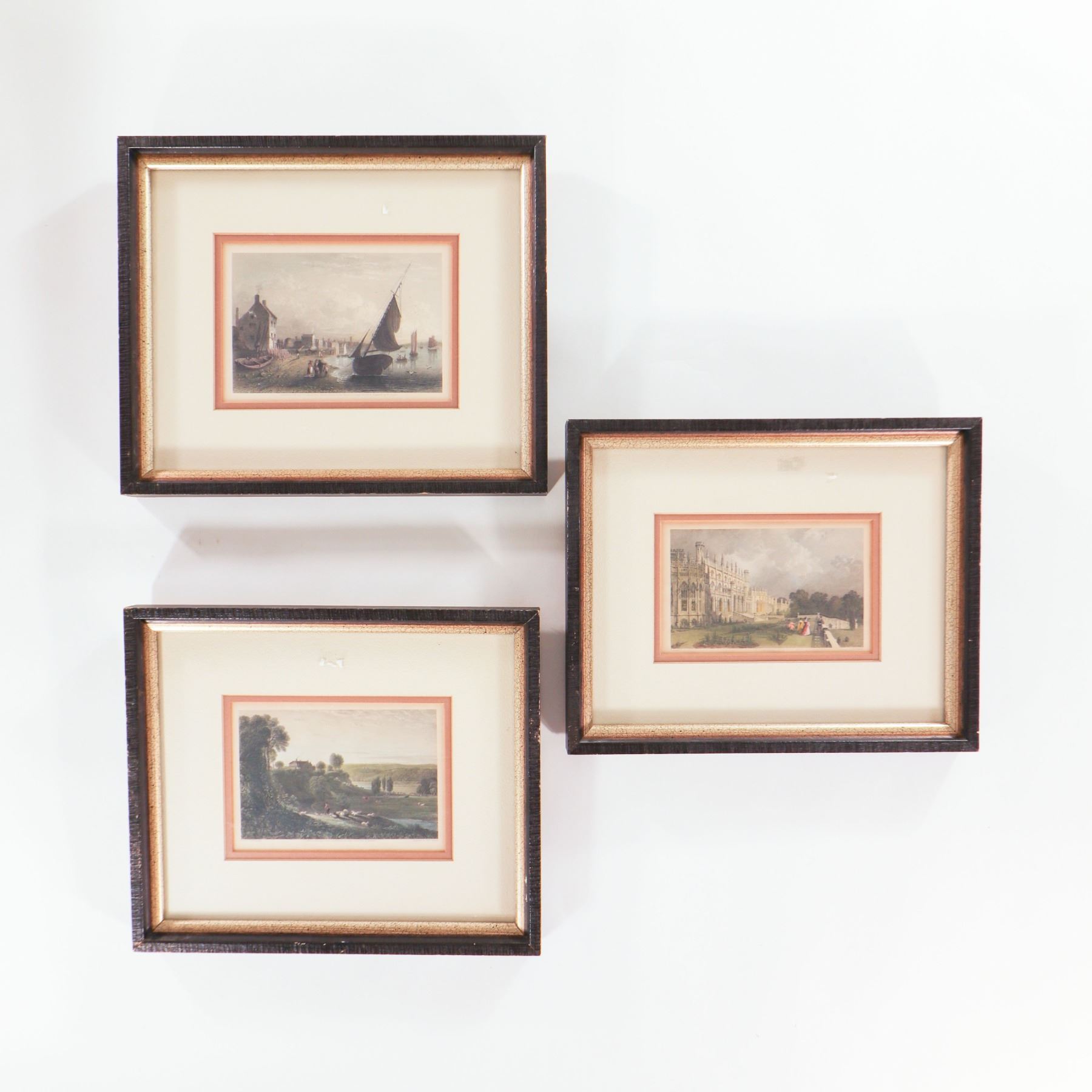 Set of three small 19th-century hand-coloured steel engravings, each framed and matted. The first a marine or riverine view inscribed “Painted in 1797 by S. F. Serres, Esq., Marine Painter to His Majesty George III, and engraved by W. Floyd”; the second an architectural view after Thomas Allom, engraved by F. J. Havell; the third a pastoral landscape “painted by W. Linton from a painting in the possession of Benj. Hick of Belton, engraved by Higham.” All three impressions with fine original or early hand colour, now presented in later cream mounts with peach-coloured slips and matching gilt-edged dark wood frames, ready for display.