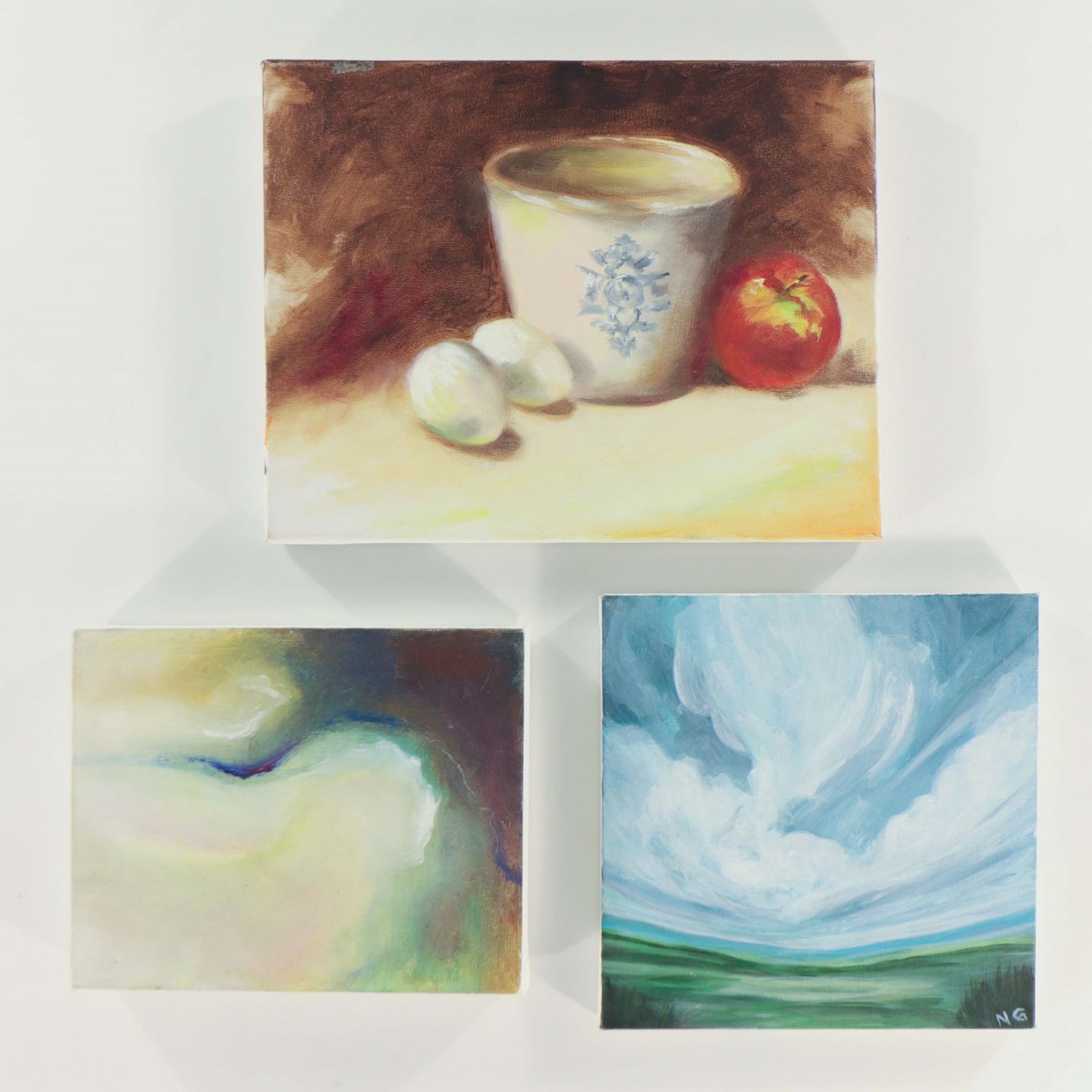 Mediums: three oils/acrylics on canvas. Sizes: ~25 × 25 cm (signed ‘NG’ sky study); ~20 × 25 cm abstract; ~about 28 × 43 cm still life (estimated from ruler). Context: contemporary decor group; the sky study evokes prairie minimalism.