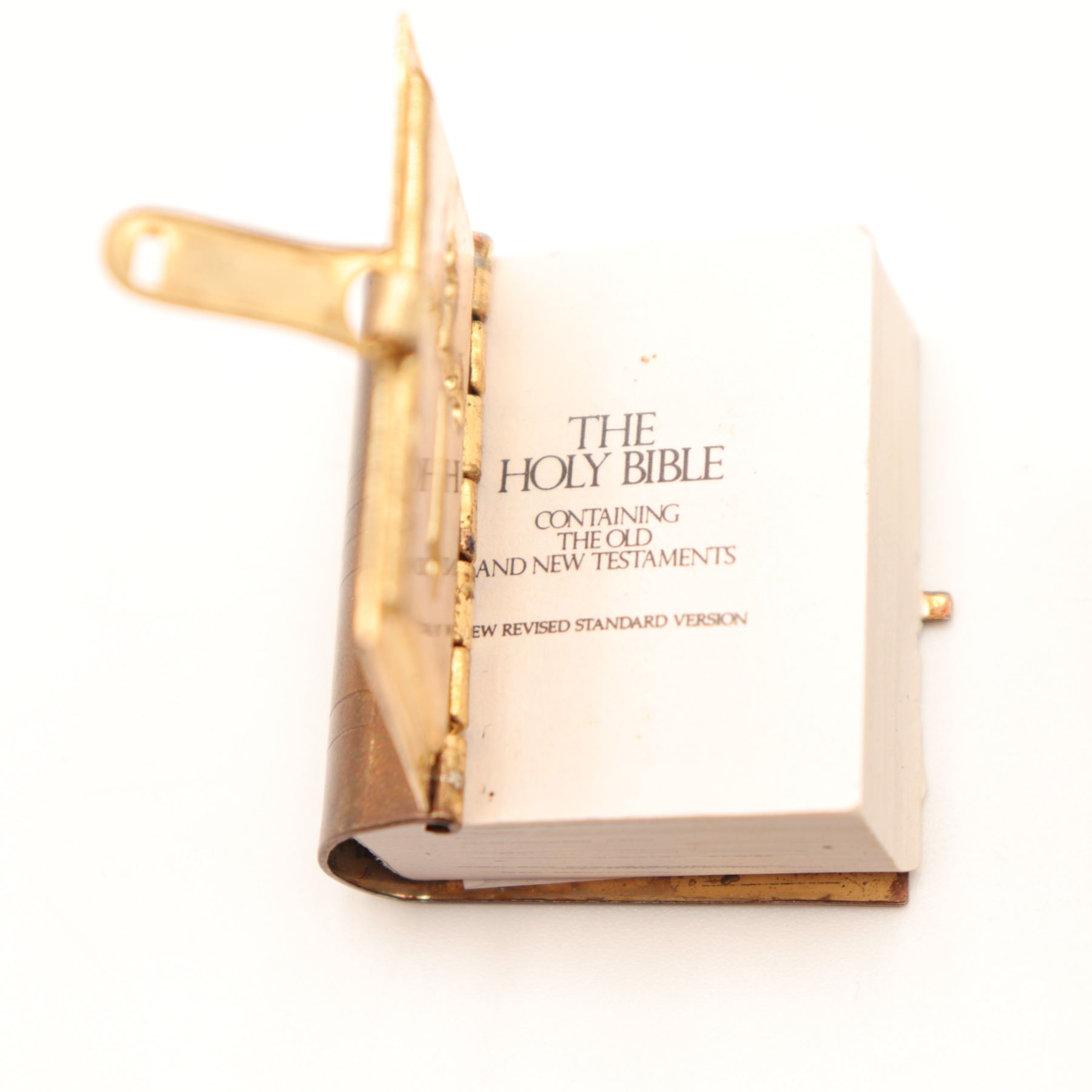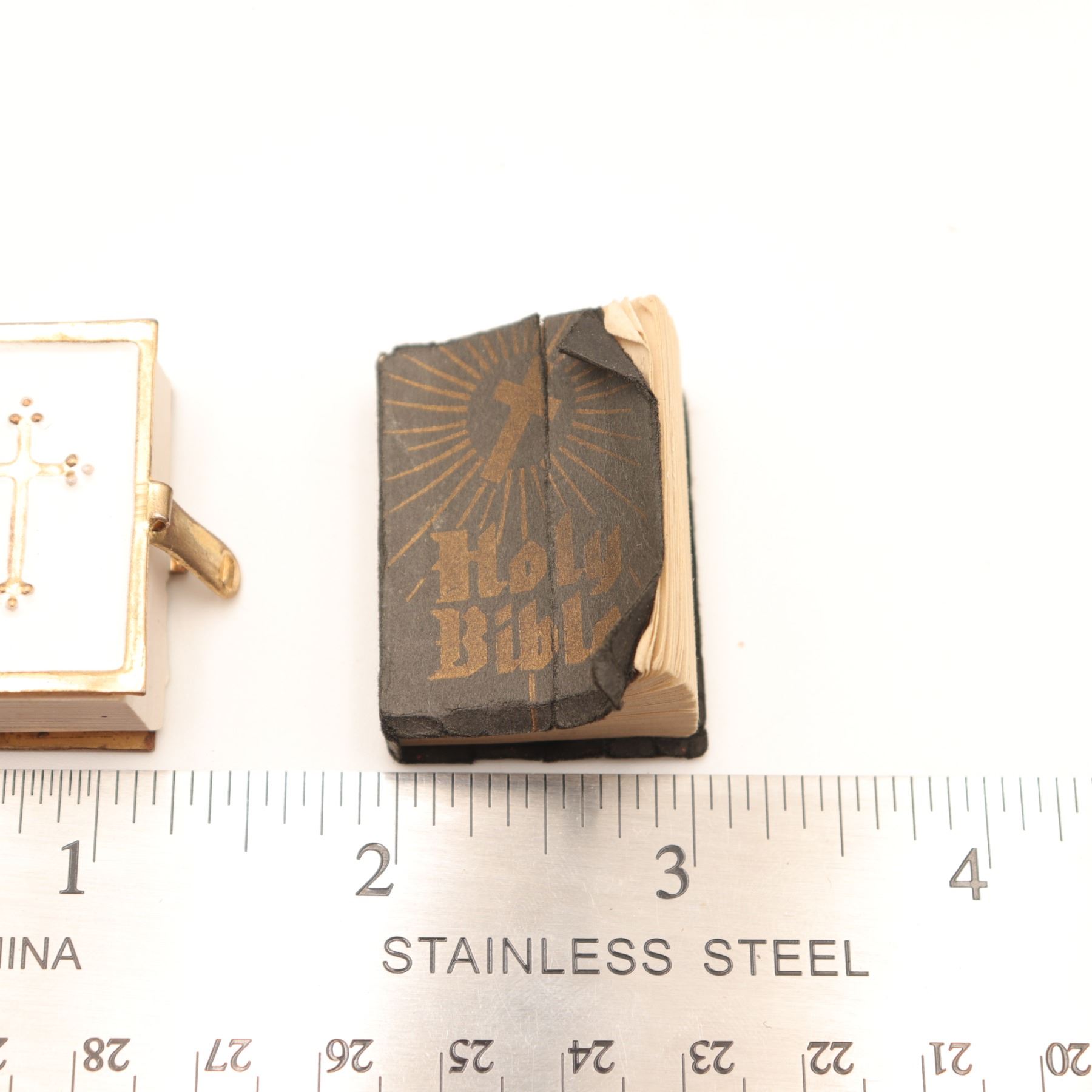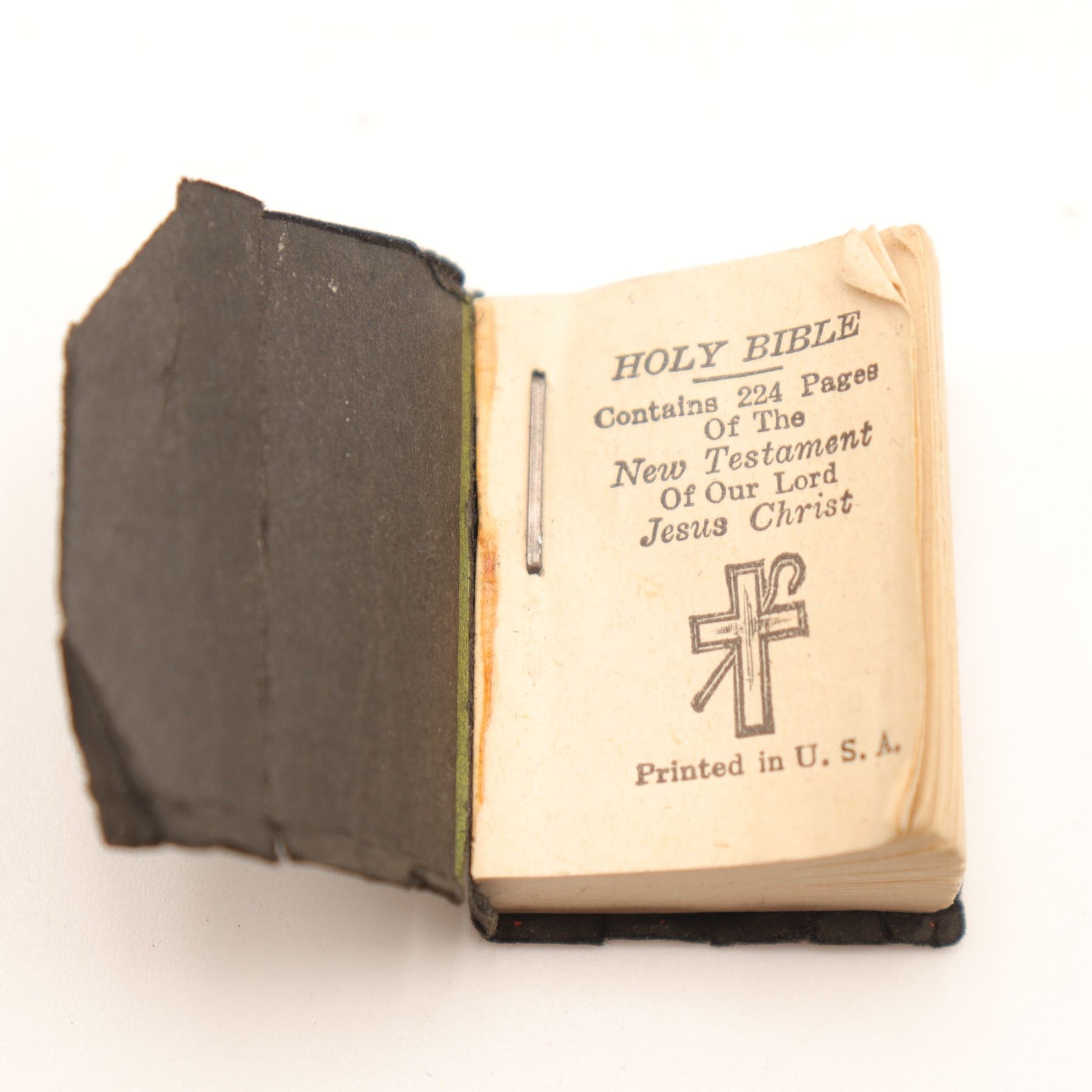 Lot of two miniature Holy Bibles, 20th century, including a New Revised Standard Version Bible housed in a small metal and enamel book-form case with white front panel and applied gilt cross, and a smaller earlier American miniature Holy Bible containing the New Testament, printed in U.S.A., in black paper covers, both originally contained within a small worn leatherette outer case. Larger Bible approx. 1 3/4 in. high. Wear, rubbing and small losses to outer case and paper covers; slight toning and handling to pages; enamel and metal book-form case with light surface wear.
