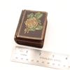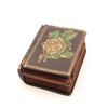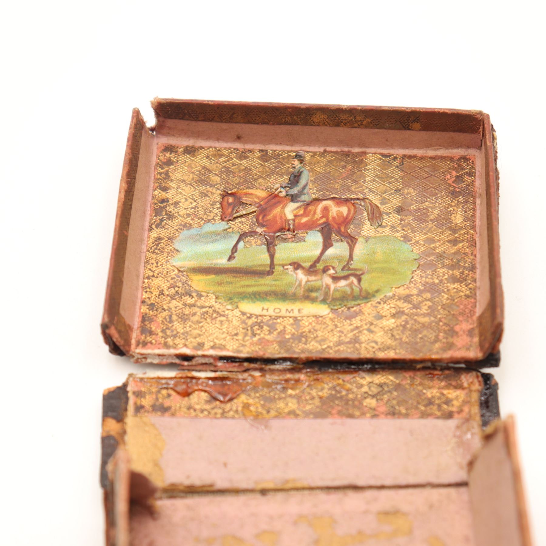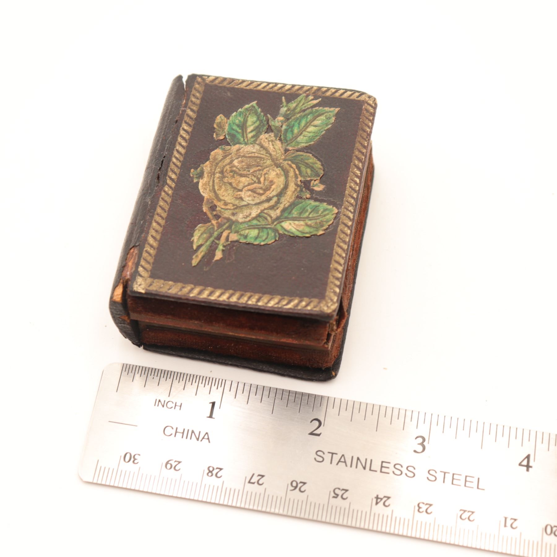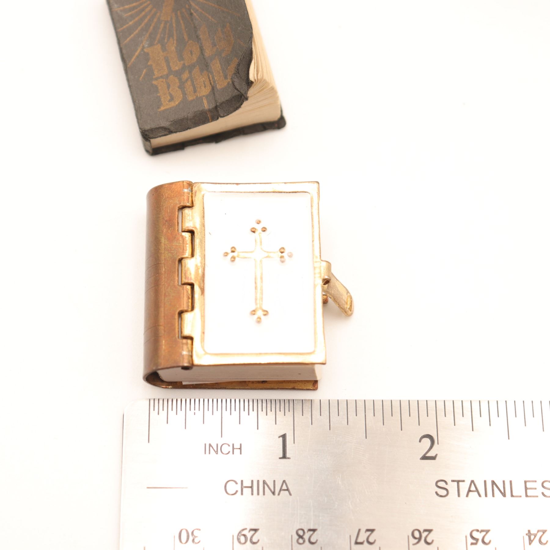 Lot of two miniature Holy Bibles, 20th century, including a New Revised Standard Version Bible housed in a small metal and enamel book-form case with white front panel and applied gilt cross, and a smaller earlier American miniature Holy Bible containing the New Testament, printed in U.S.A., in black paper covers, both originally contained within a small worn leatherette outer case. Larger Bible approx. 1 3/4 in. high. Wear, rubbing and small losses to outer case and paper covers; slight toning and handling to pages; enamel and metal book-form case with light surface wear.
