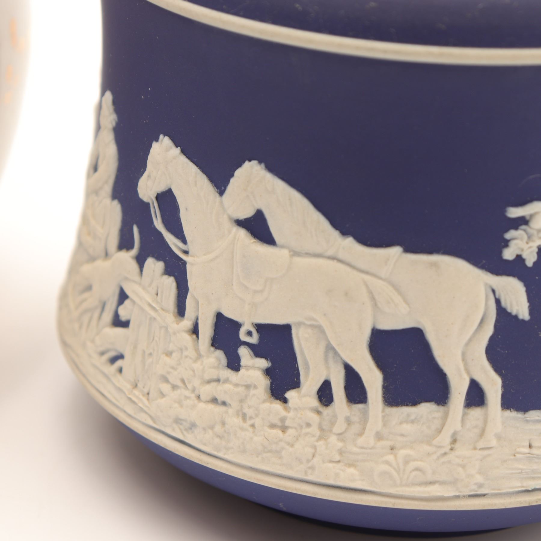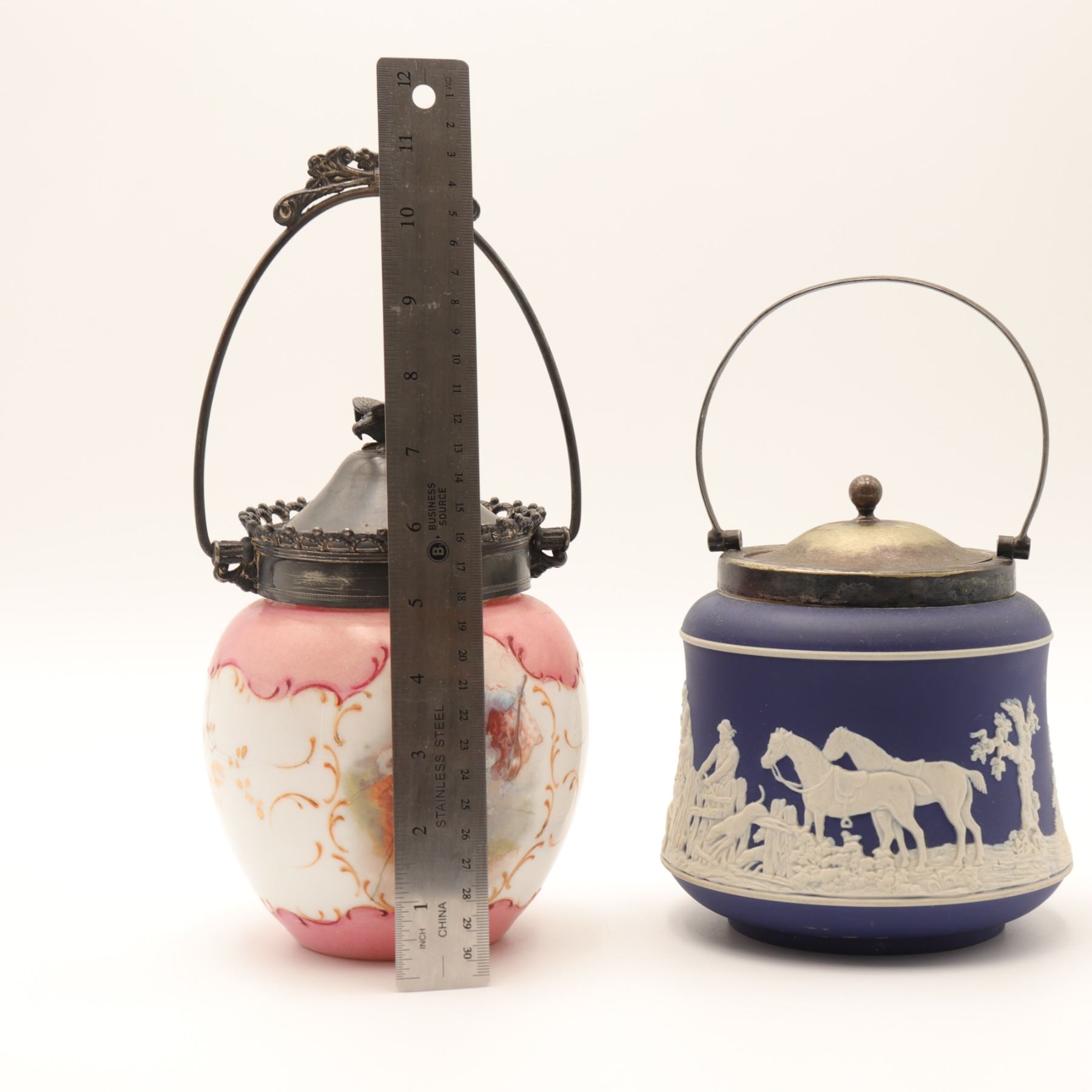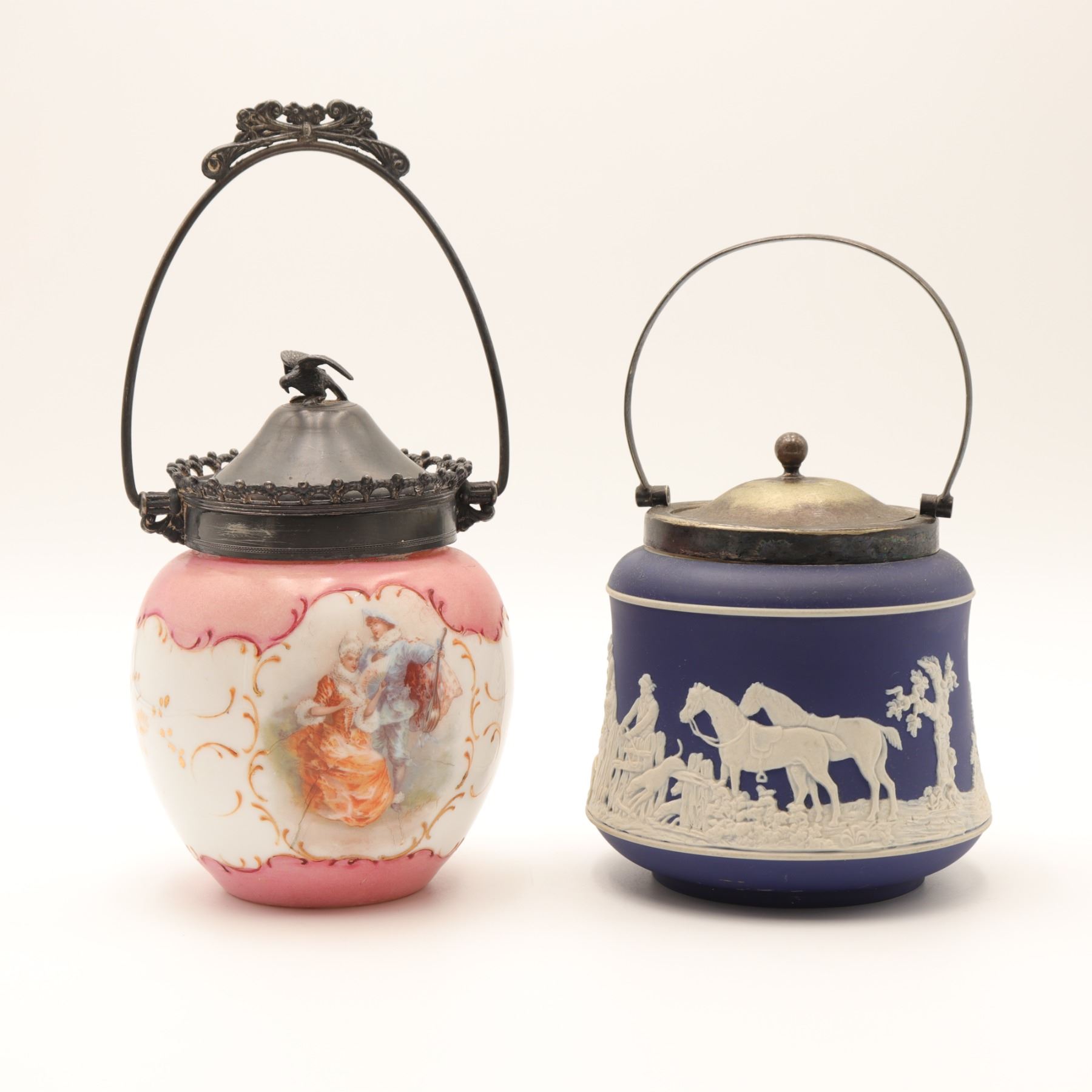 Pair of late 19th–early 20th century biscuit barrels, comprising a pink-ground enamelled glass barrel with Rococo-style painted reserve of courting couple and ornate metal mount with eagle finial, and a blue jasperware ceramic barrel with white hunting and pastoral reliefs and metal-mounted lid and swing handle. Heights approx. 10 in. and 8 in. including handles. Both with surface wear, tarnishing and patina to metal mounts; pink barrel with expected enamel and paint wear, jasperware-style barrel with a few small rim nicks and light staining to relief.