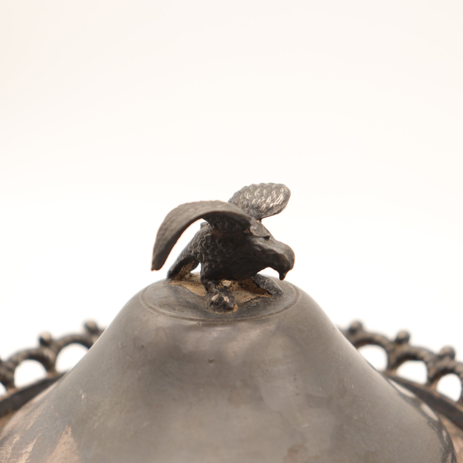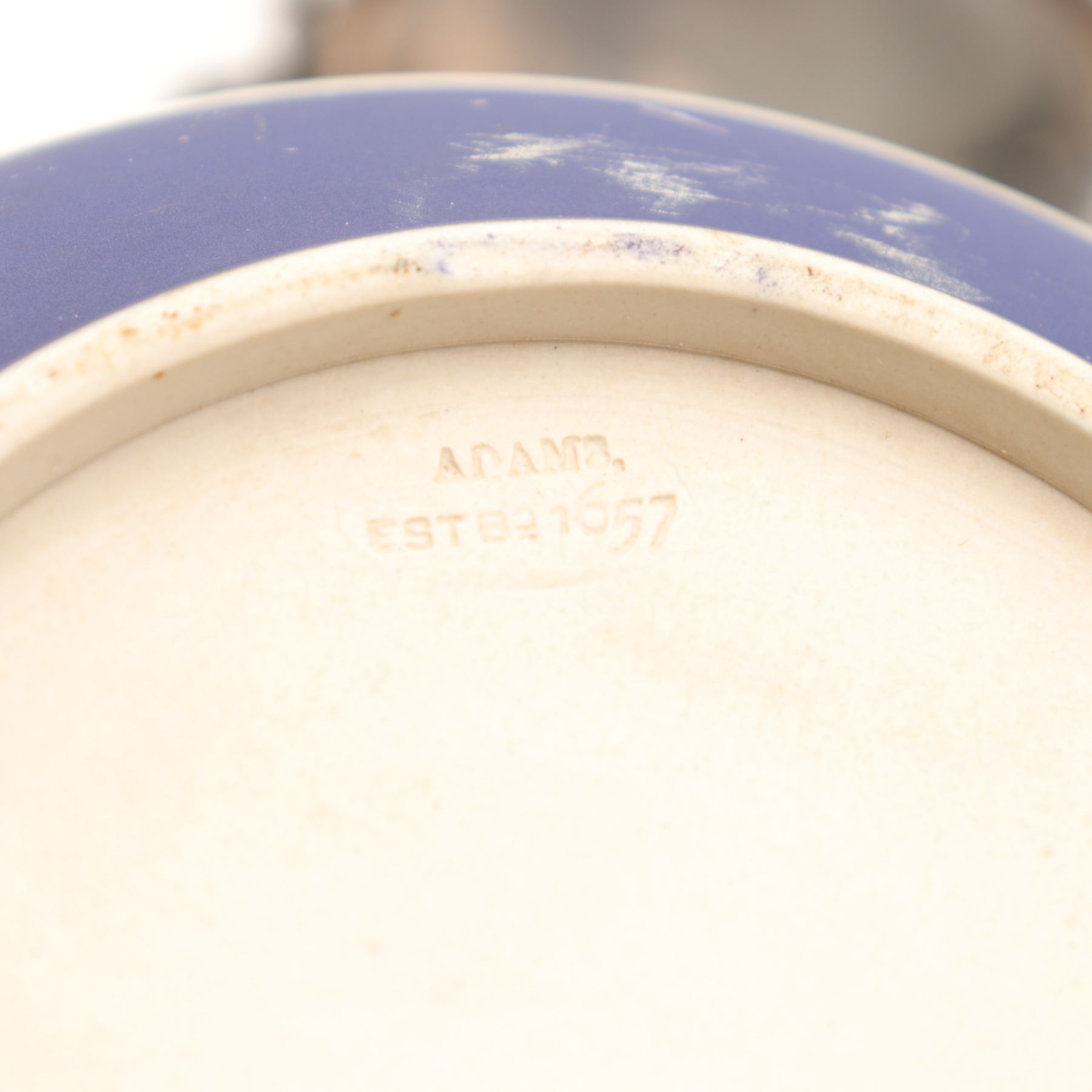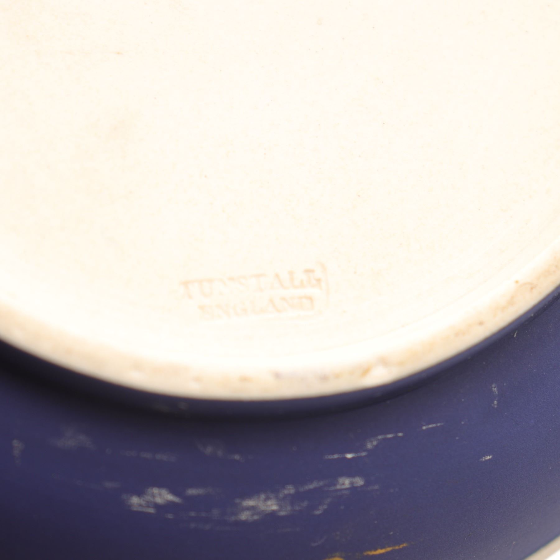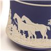 Pair of late 19th–early 20th century biscuit barrels, comprising a pink-ground enamelled glass barrel with Rococo-style painted reserve of courting couple and ornate metal mount with eagle finial, and a blue jasperware ceramic barrel with white hunting and pastoral reliefs and metal-mounted lid and swing handle. Heights approx. 10 in. and 8 in. including handles. Both with surface wear, tarnishing and patina to metal mounts; pink barrel with expected enamel and paint wear, jasperware-style barrel with a few small rim nicks and light staining to relief.