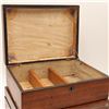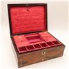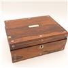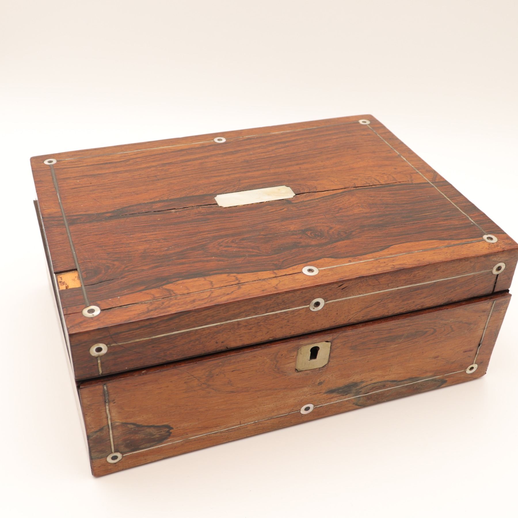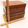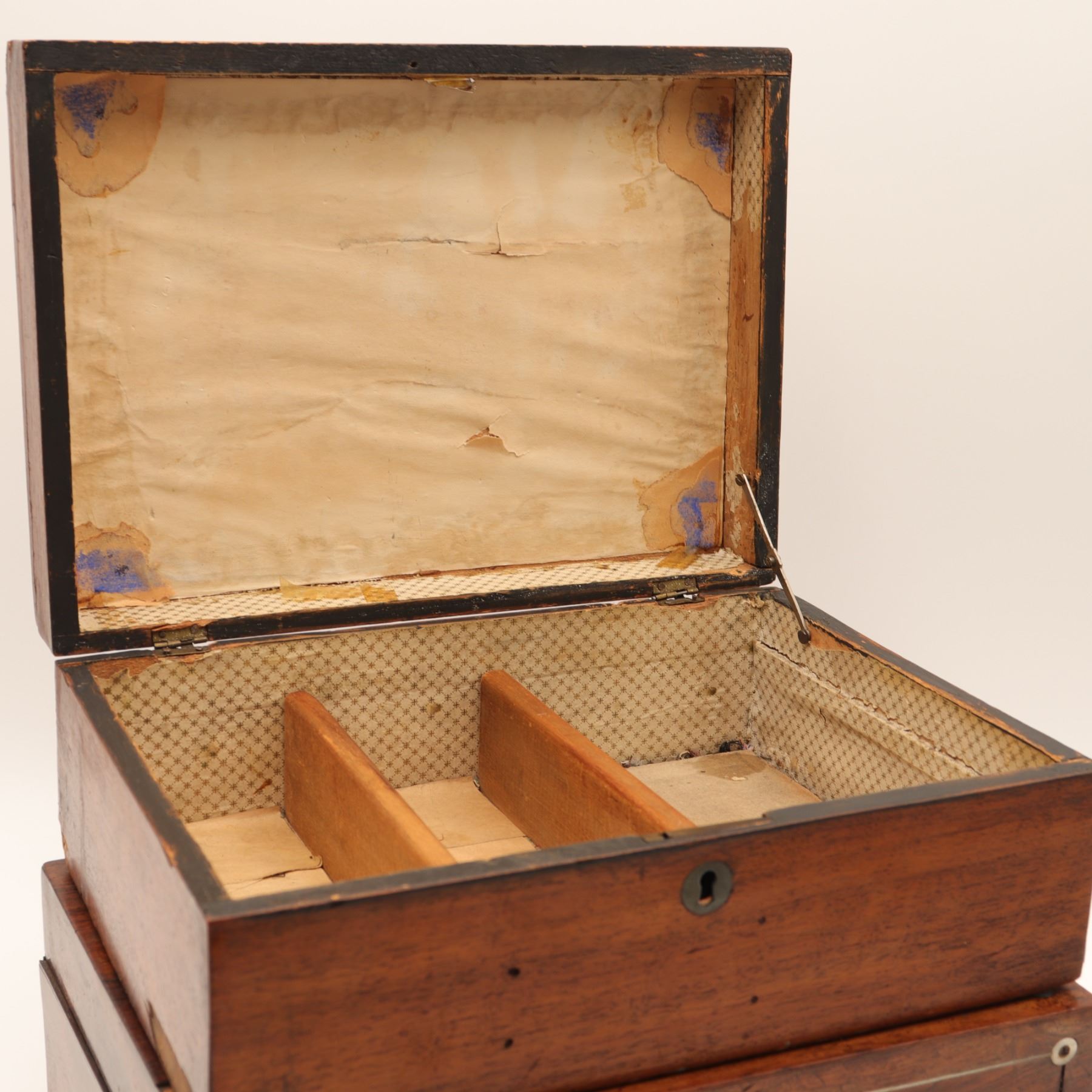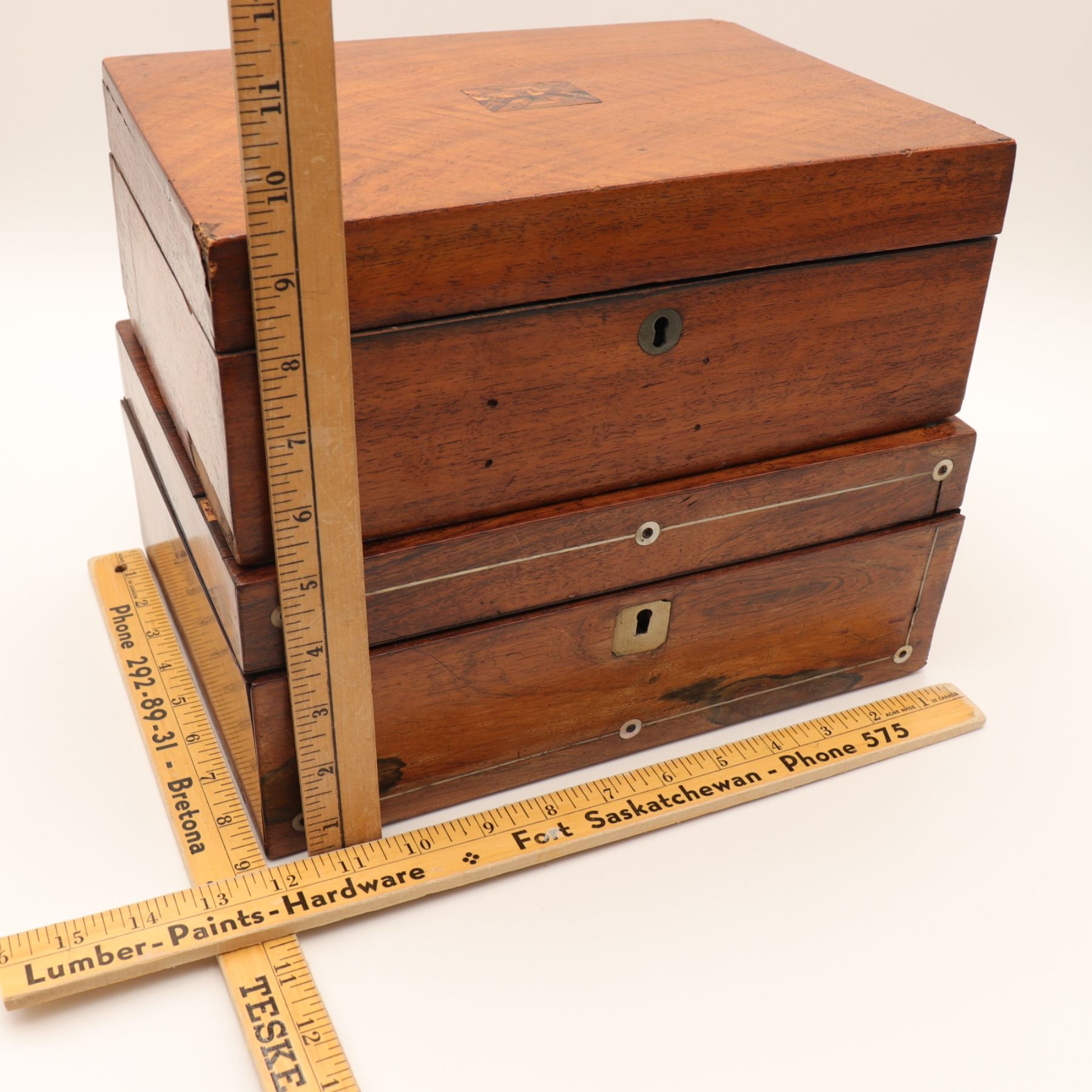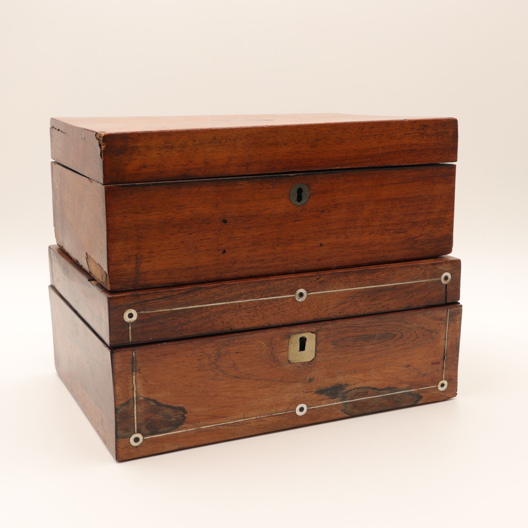 Group of two late Victorian wooden boxes, the larger a rosewood veneer jewellery or dressing box with mother-of-pearl escutcheon and stringing, fitted interior with red silk and compartmented tray; the smaller a mahogany box with simple brass escutcheon and later three-compartment interior. Both with hinged lids and brass locks (no keys). Condition: both boxes require restoration; veneers with cracks, lifting and losses, corners bumped, finish worn and scratched; interiors with staining, fading and fabric wear, one lid lining torn and detached in areas; hardware with oxidation. Larger box approx. 6 1/2 in. H x 12 in. W x 9 in. D; smaller approx. 5 in. H x 10 in. W x 6 in. D.