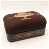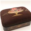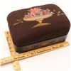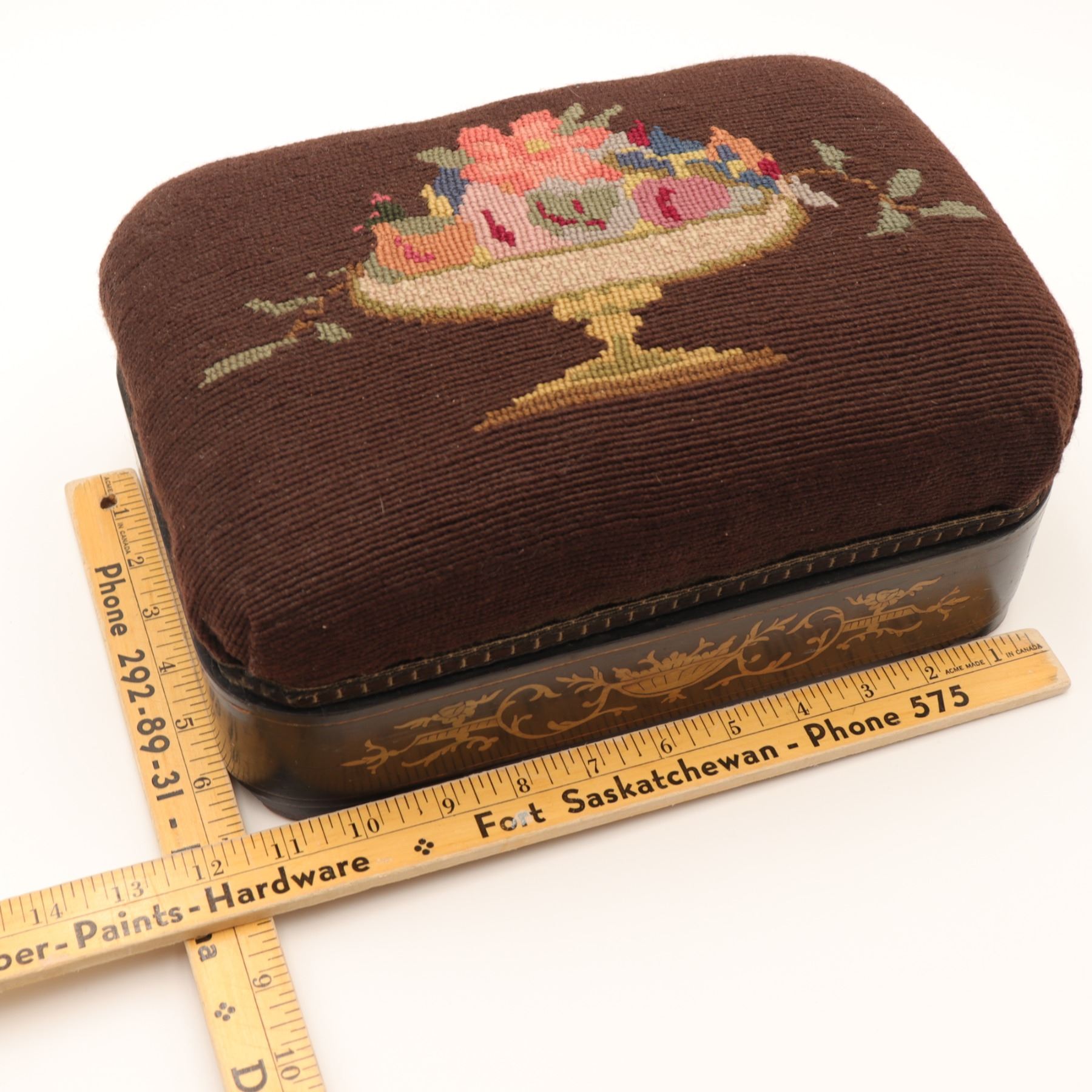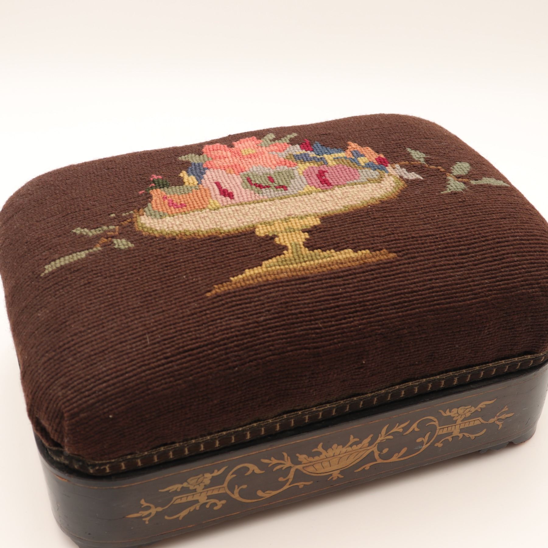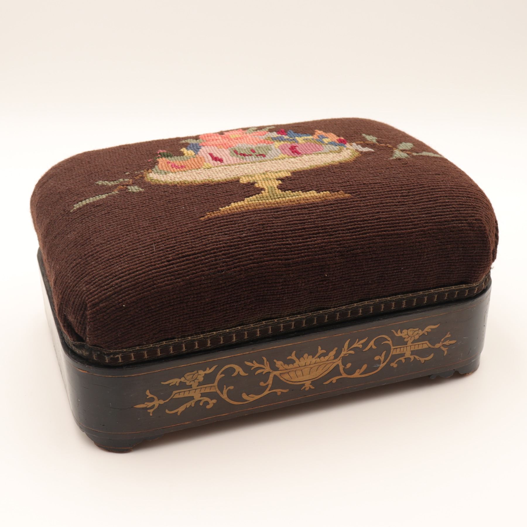 Victorian rectangular footstool, the padded top covered in brown corded fabric with wool needlework panel depicting a compote of fruit and flowers, raised on a low ebonised wooden base decorated to the sides with veneer classical urn-and-foliage scrolls. Condition: upholstery with general wear, light soiling and minor pulls to pile; colours still presentable; wood base with scattered scuffs, small edge chips and rubbing to painted decoration; structurally solid. Approx. 6 in. H x 14 in. W x 10 in. D.