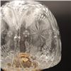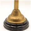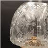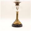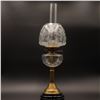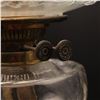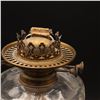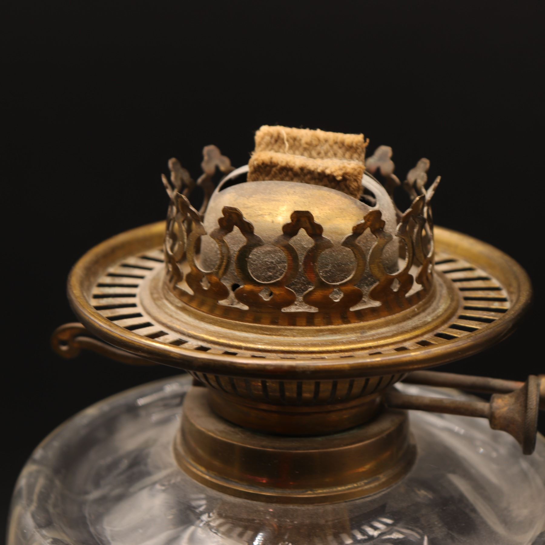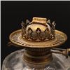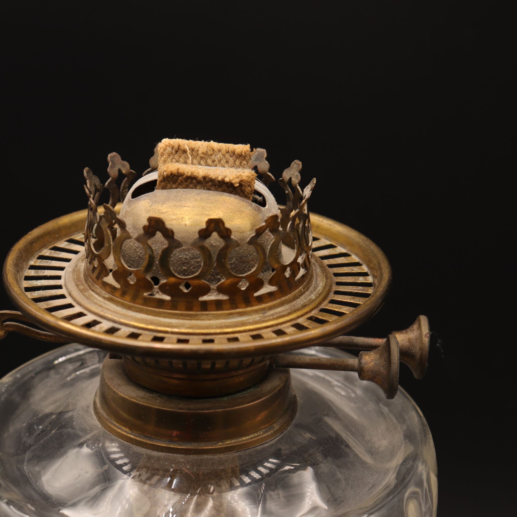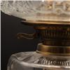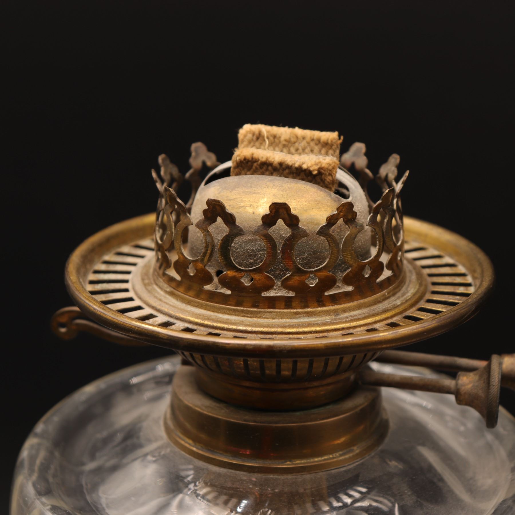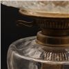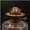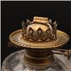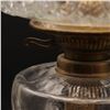 Victorian brass and glass paraffin / oil lamp with Young’s screw-fitting burner, late 19th century. The lamp with clear moulded and wheel-engraved glass shade decorated with radiating starburst and foliate motifs above a clear glass font similarly decorated with stylised foliage, fitted with brass collar and twin disc winder stamped YOUNG’S SCREW FITTING to each side. Reeded column stem rising from a domed and stepped brass socle, all mounted on a circular black glass plinth, complete with clear glass chimney. An attractive period example retaining its original burner and fittings.