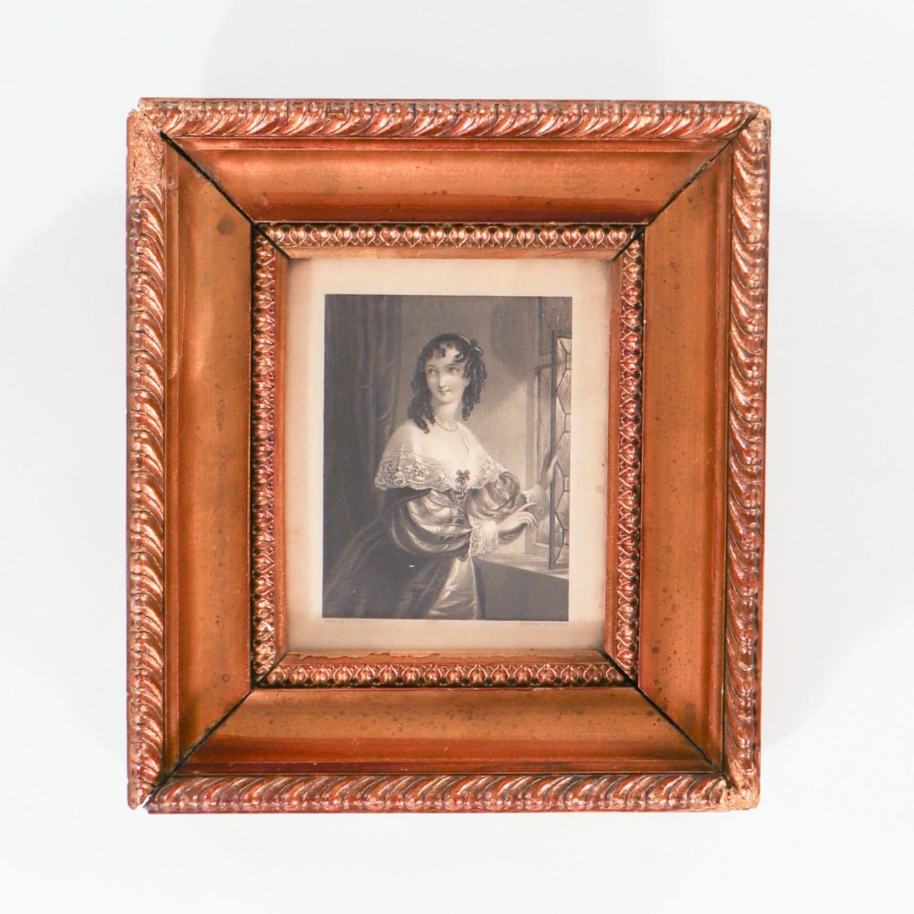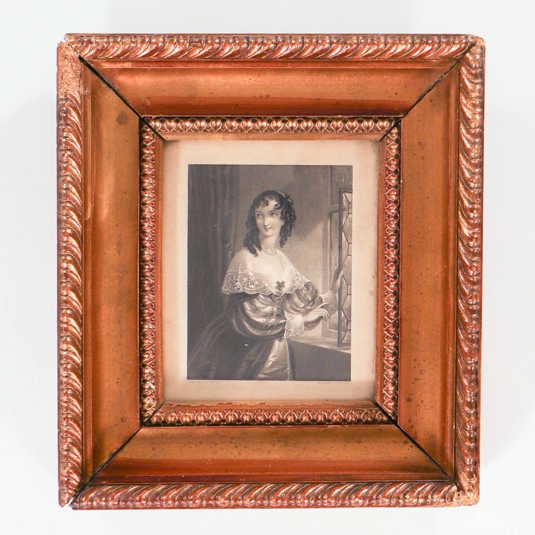 Original 19th-century British steel engraving of a young woman at a lattice window, after Edmund Thomas Parris (1793–1873), engraved by H. Cook. Three-quarter length, the sitter turned slightly to the left, wearing a voluminous gown with richly shaded sleeves and a broad lace collar, one hand resting on the window frame, the other holding a letter, her hair dressed in ringlets. Finely worked in mixed engraving and stipple, printed in warm black on wove paper. Inscribed in the lower margin “Drawn by E. T. Parris” and “Engraved by H. Cook” (title hidden by the mount, likely from one of the popular Victorian “female portrait” series issued in the 1830s–1840s). Presented in an ornate period-style copper-bronze painted moulded frame with rope-twist and leaf borders, cream mount, and glazing.