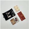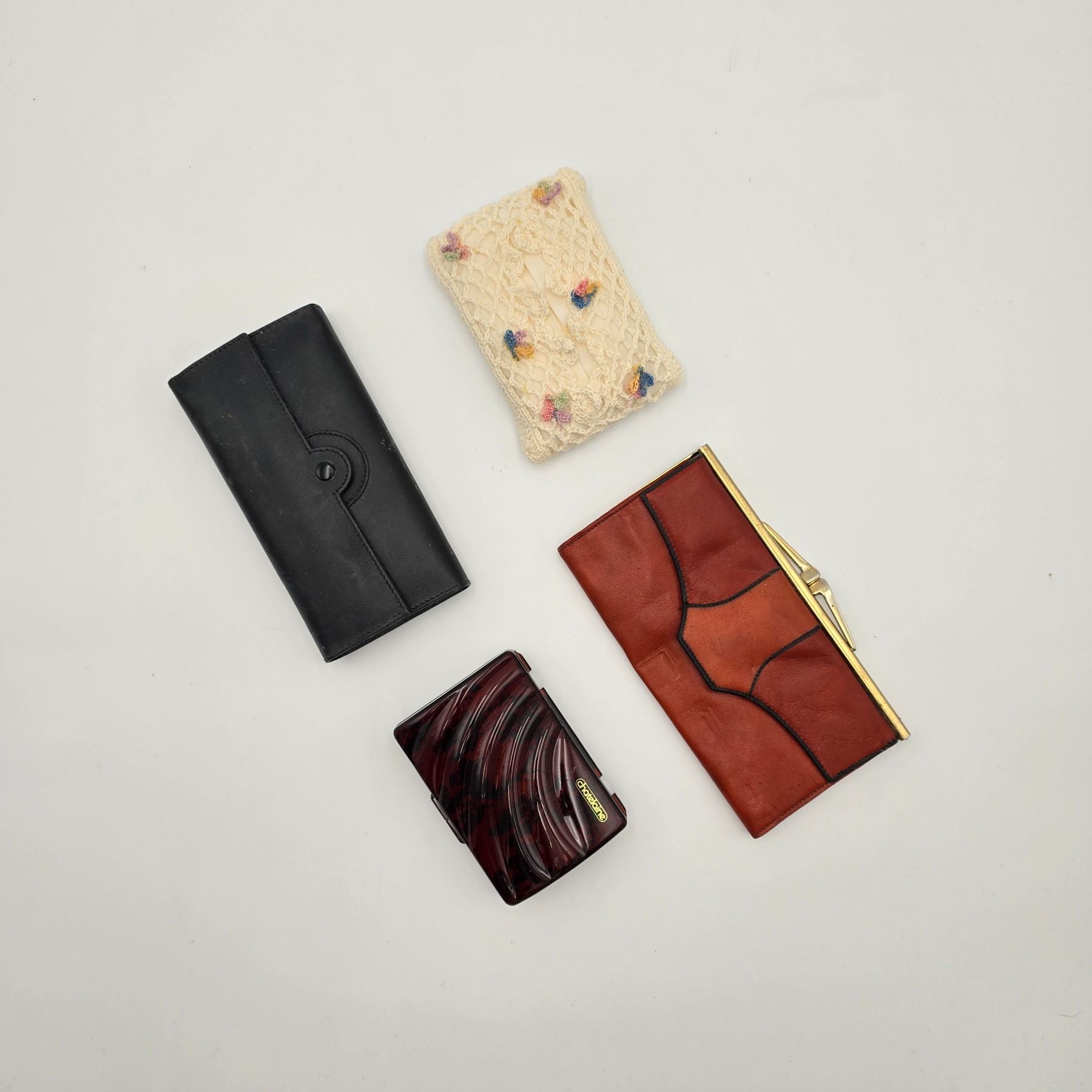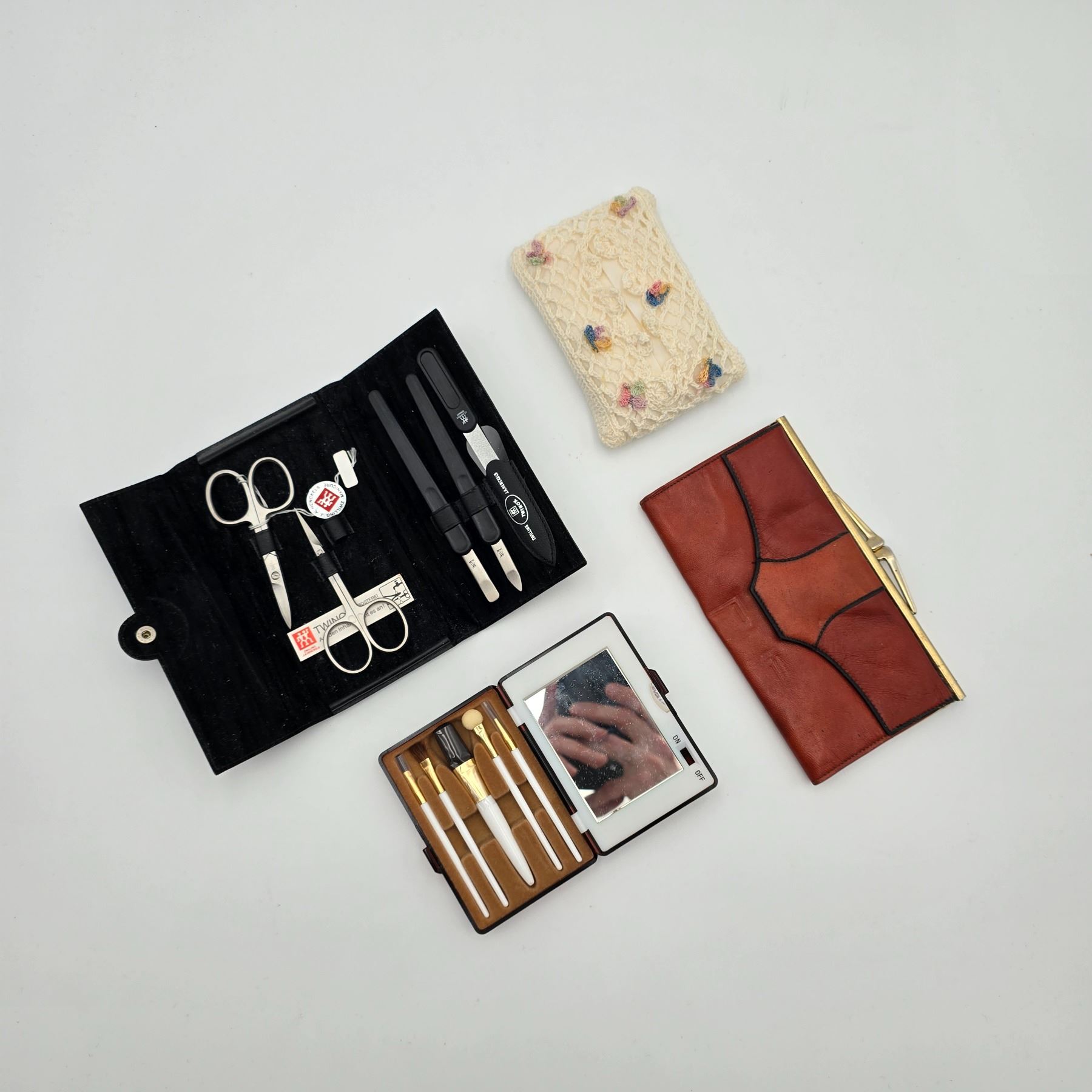Makeup kit, vintage wallet, crocheted tissue dispenser, Zwilling Twinox nail kit (unused)