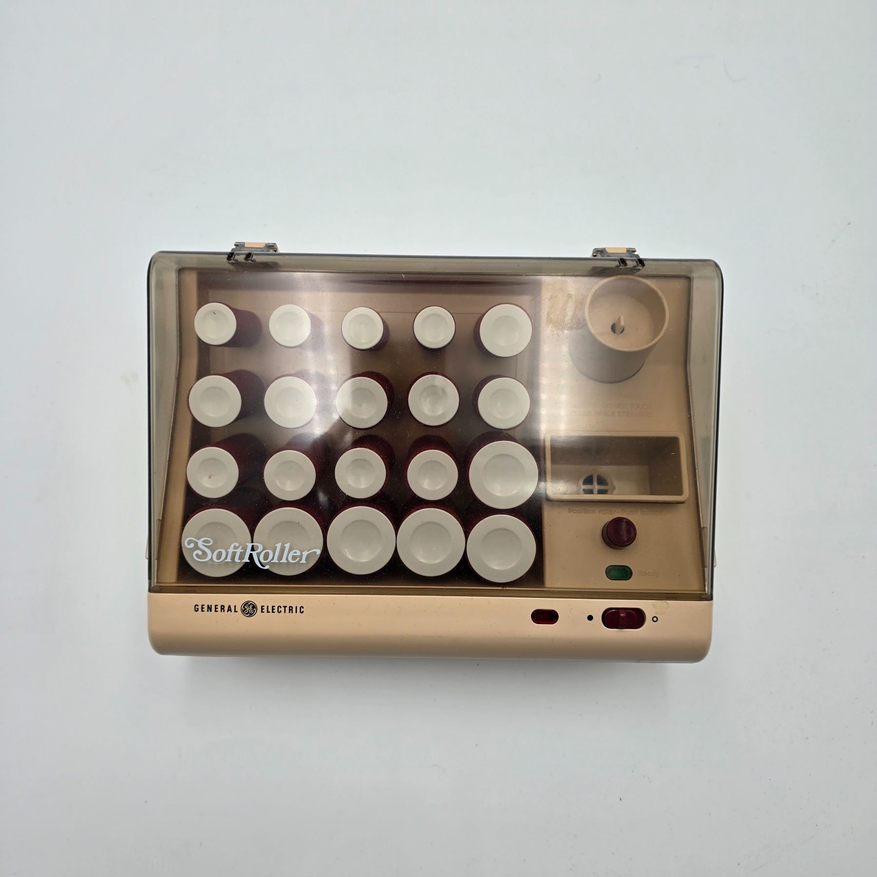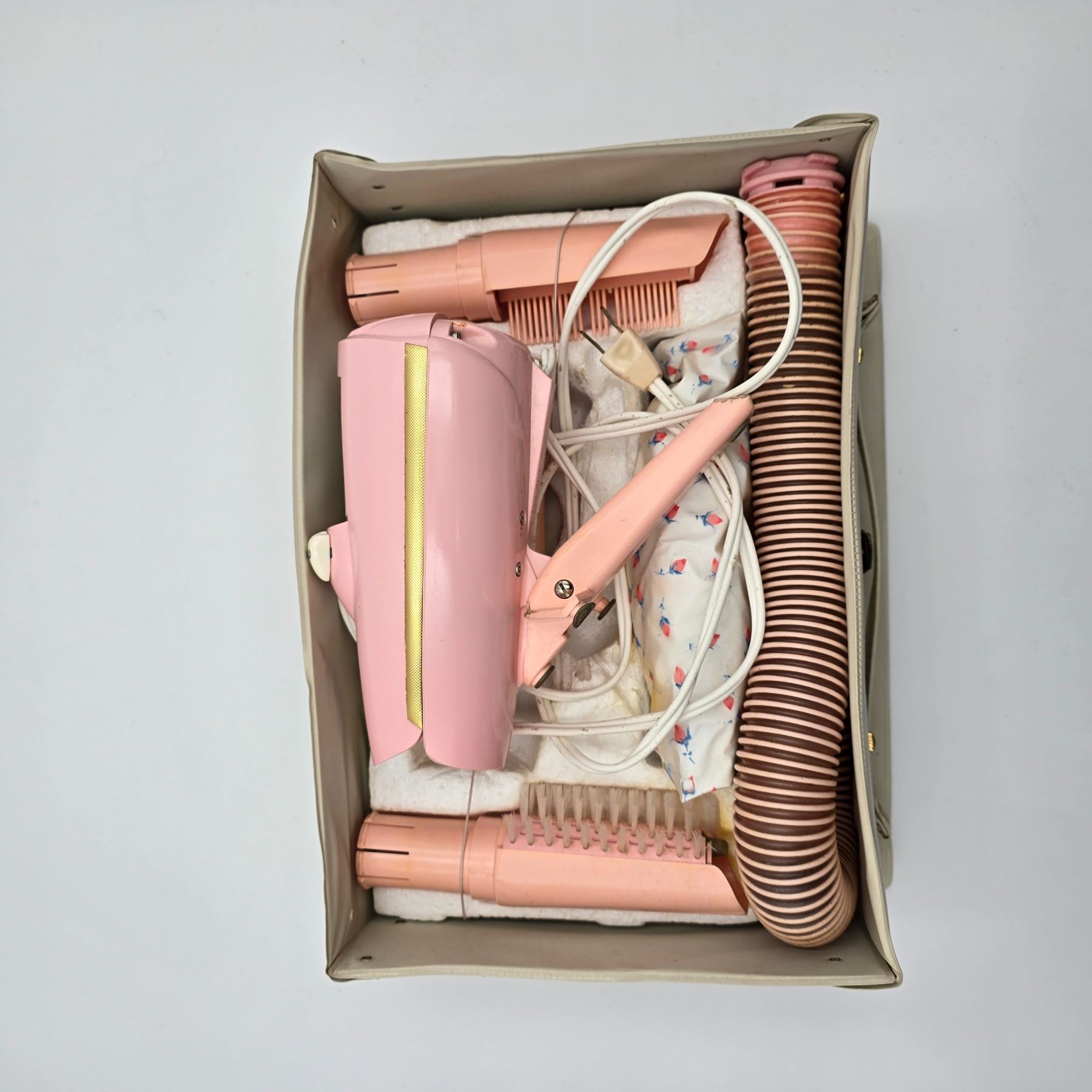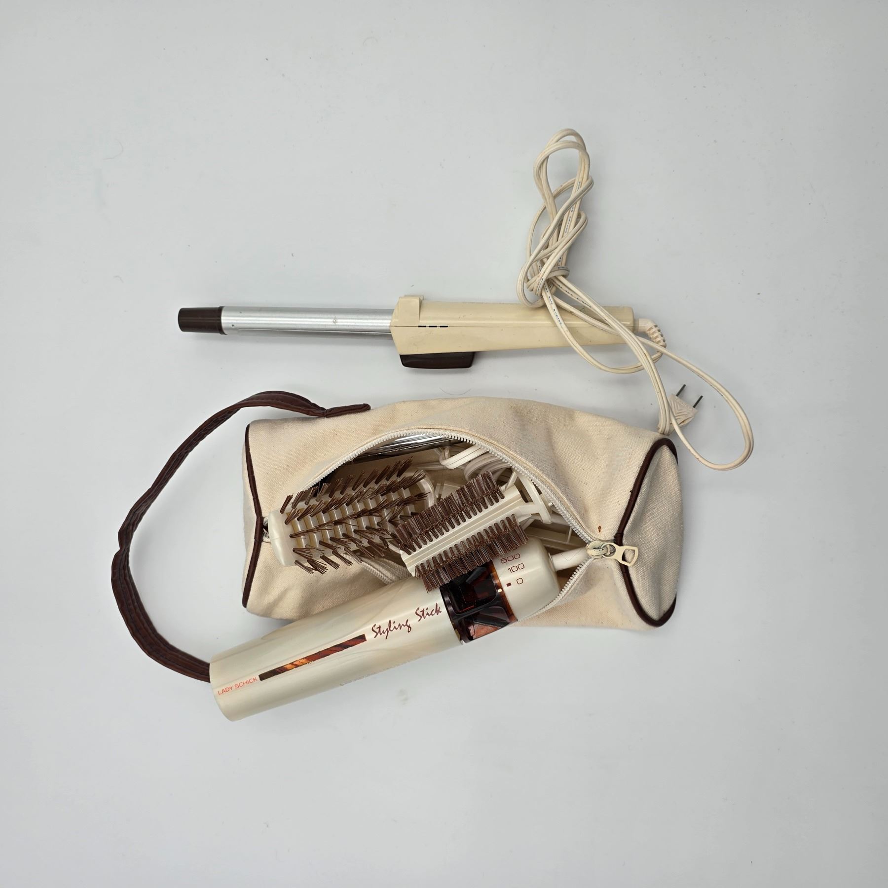 Vintage hair fan (Torcan); hair rollers (General Electric); curling iron