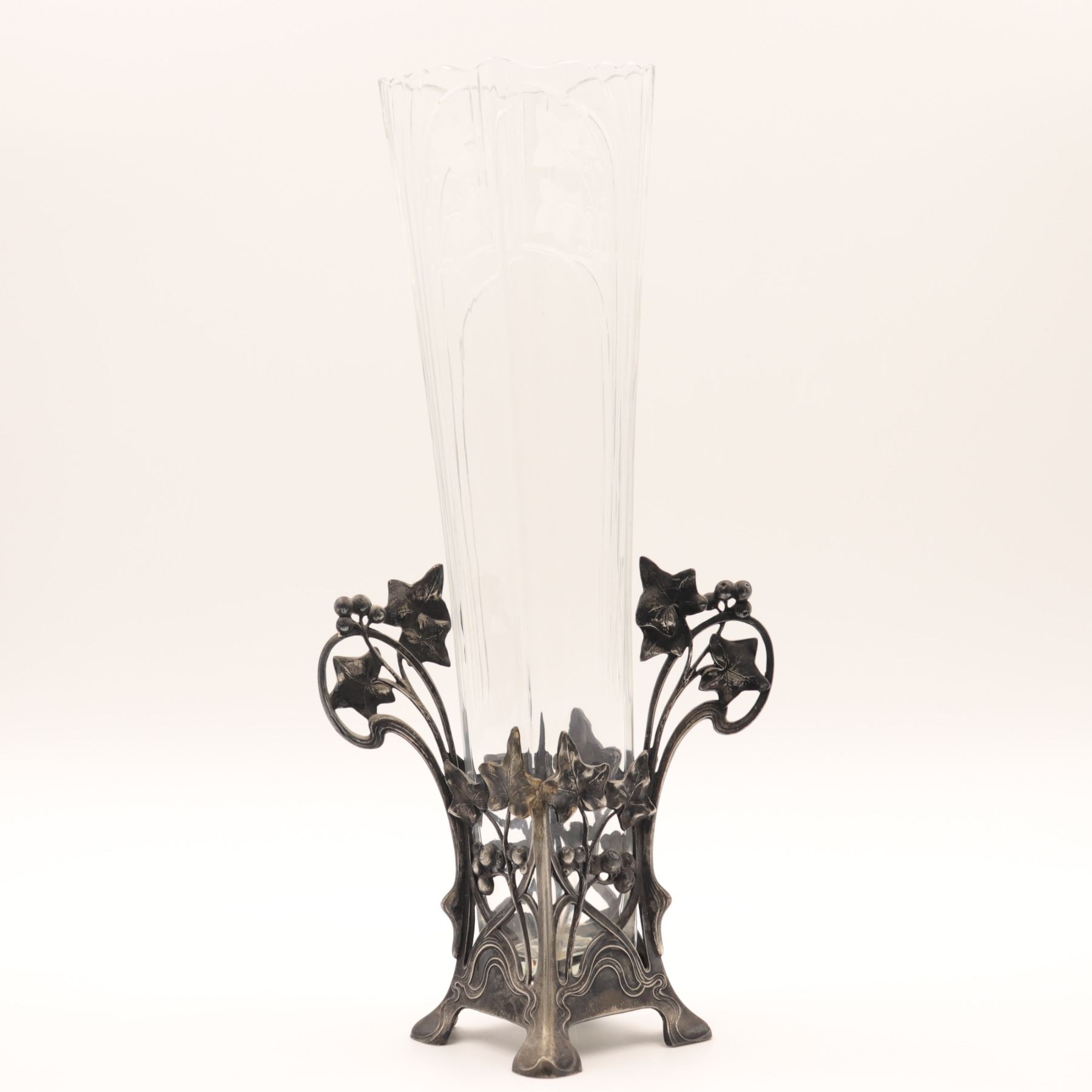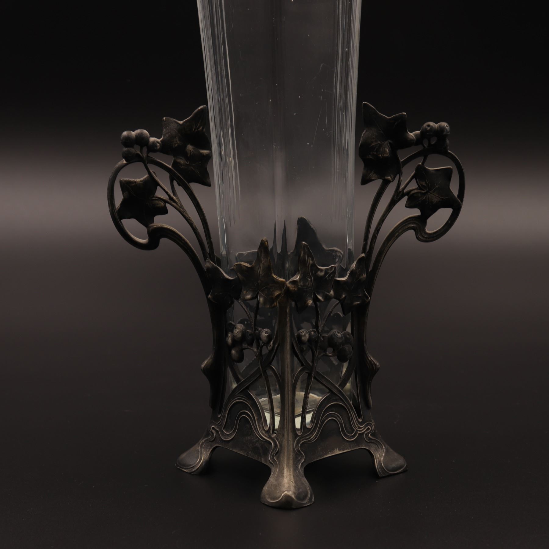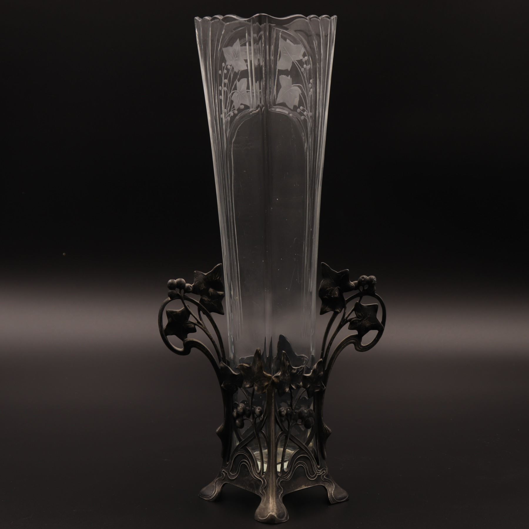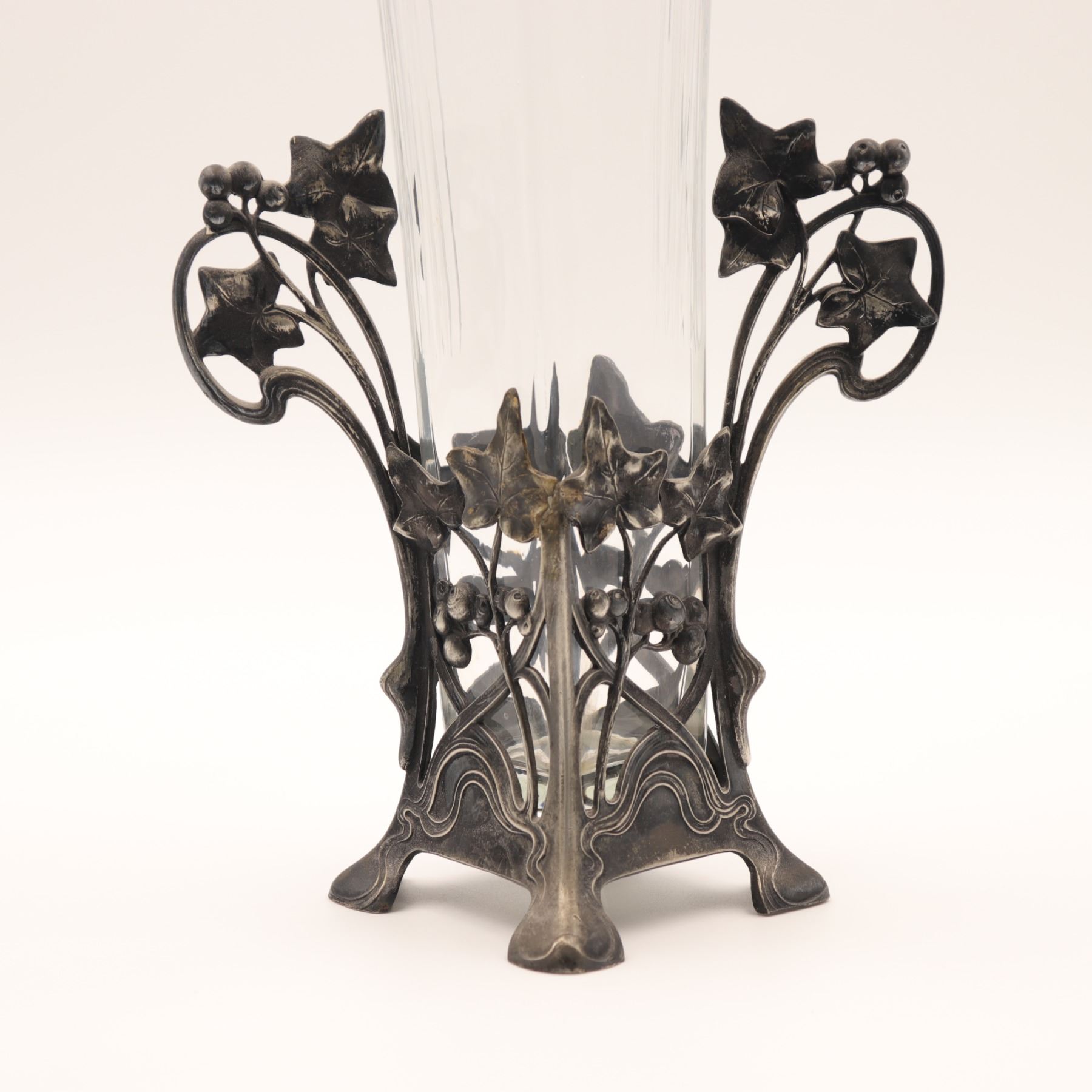Art Nouveau glass and metal-mounted vase by Württembergische Metallwarenfabrik (WMF), Germany, circa 1900–1910, the clear moulded glass liner etched with stylised lilies and set in an openwork pewter mount of flowing stems, ivy leaves and berries, underside stamped with WMF marks indicating antique silver finish. Glass in excellent condition; pewter with patina, rubbing and one applied leaf element detached and requiring reattachment.