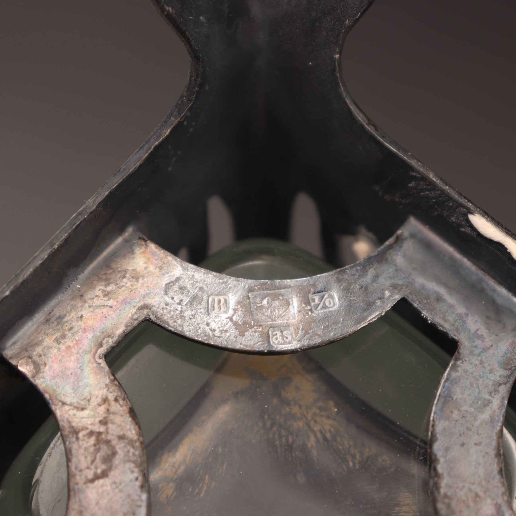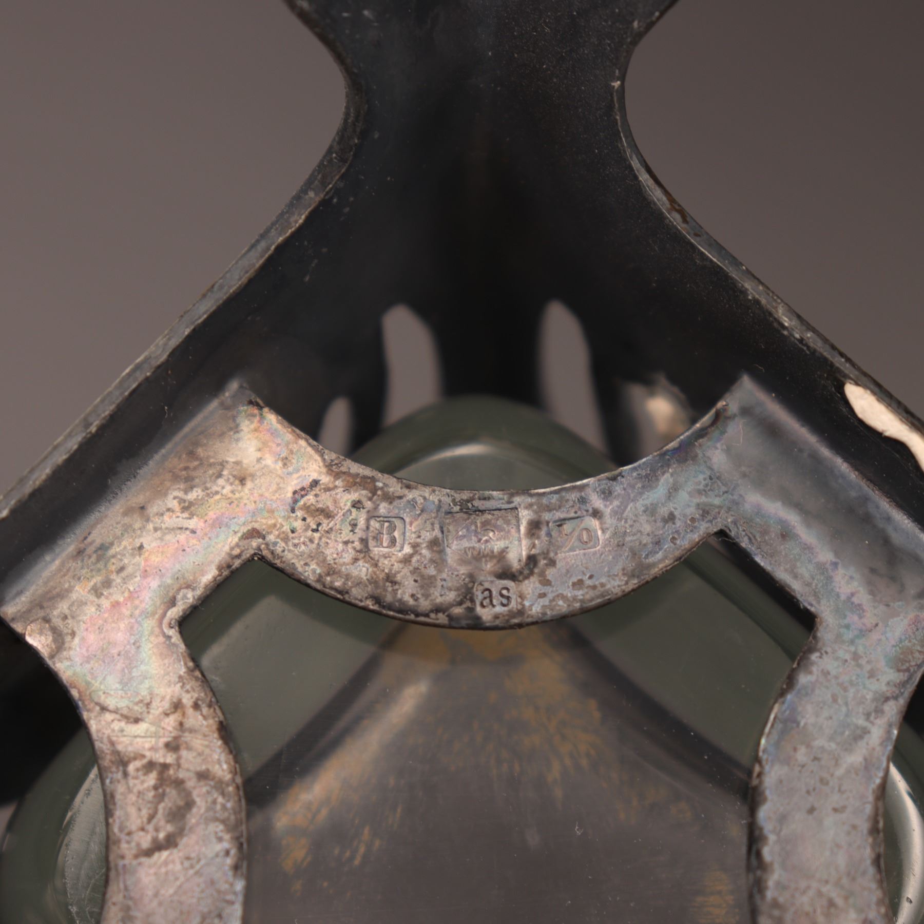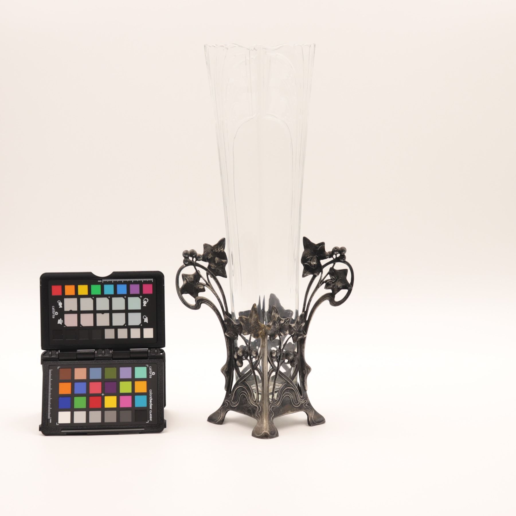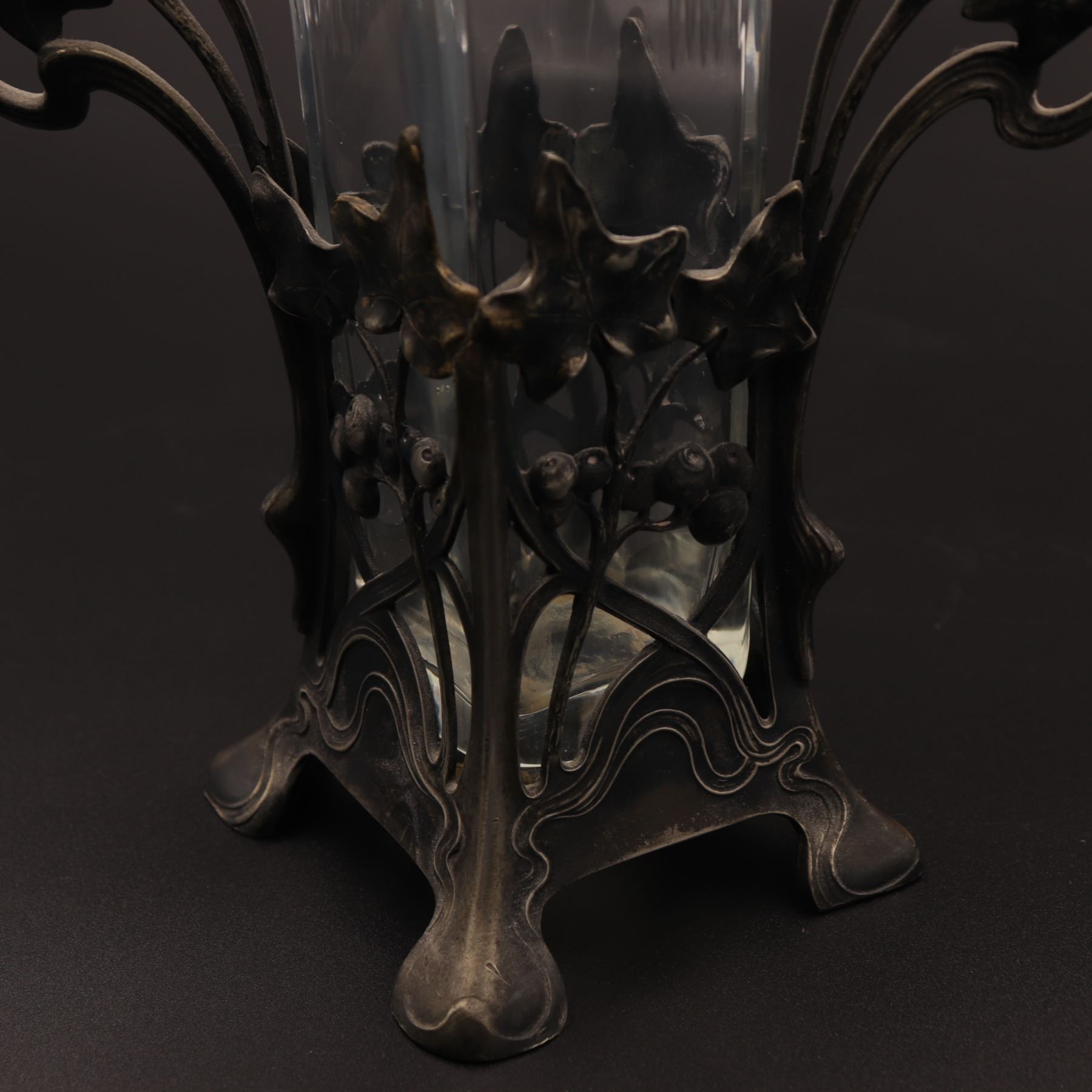 Art Nouveau glass and metal-mounted vase by Württembergische Metallwarenfabrik (WMF), Germany, circa 1900–1910, the clear moulded glass liner etched with stylised lilies and set in an openwork pewter mount of flowing stems, ivy leaves and berries, underside stamped with WMF marks indicating antique silver finish. Glass in excellent condition; pewter with patina, rubbing and one applied leaf element detached and requiring reattachment.