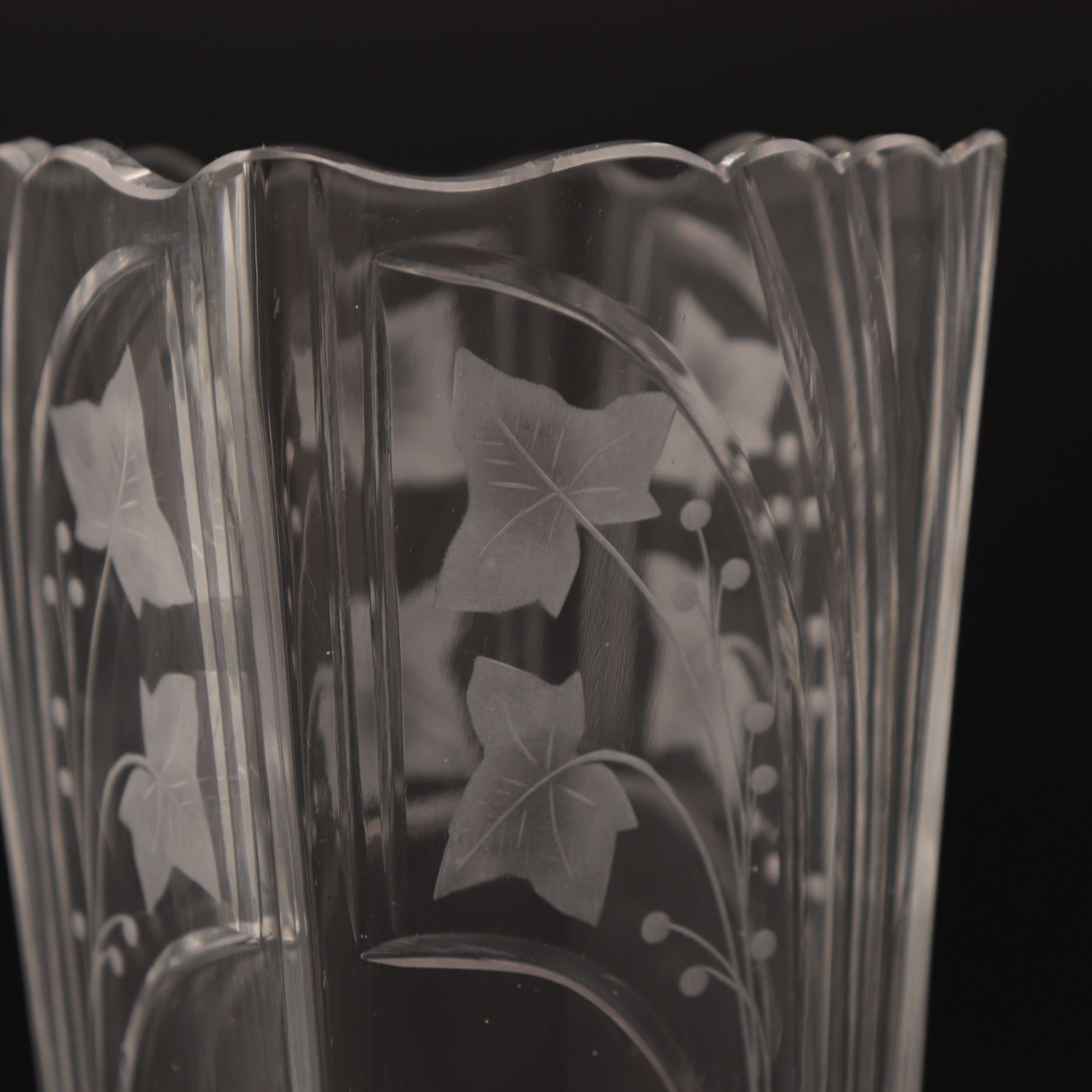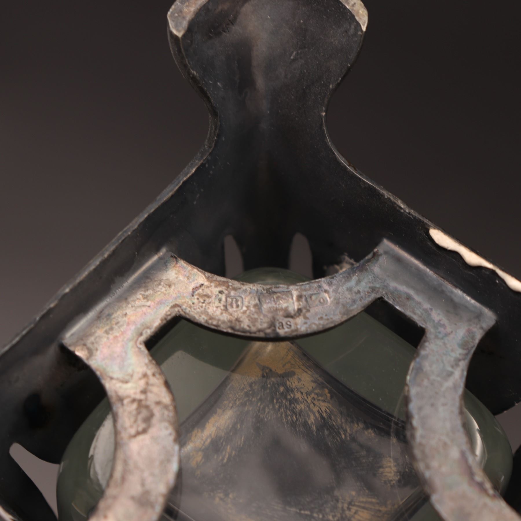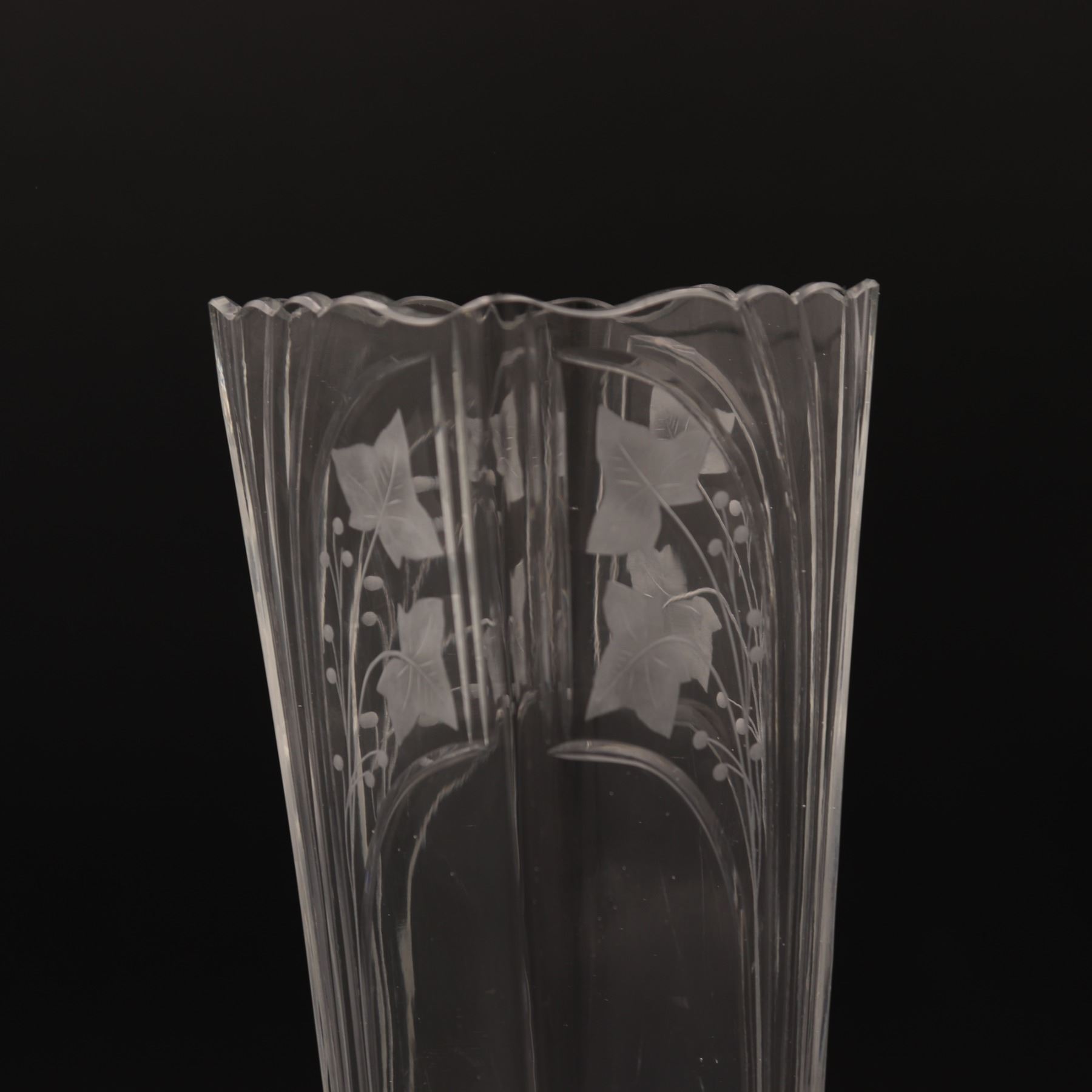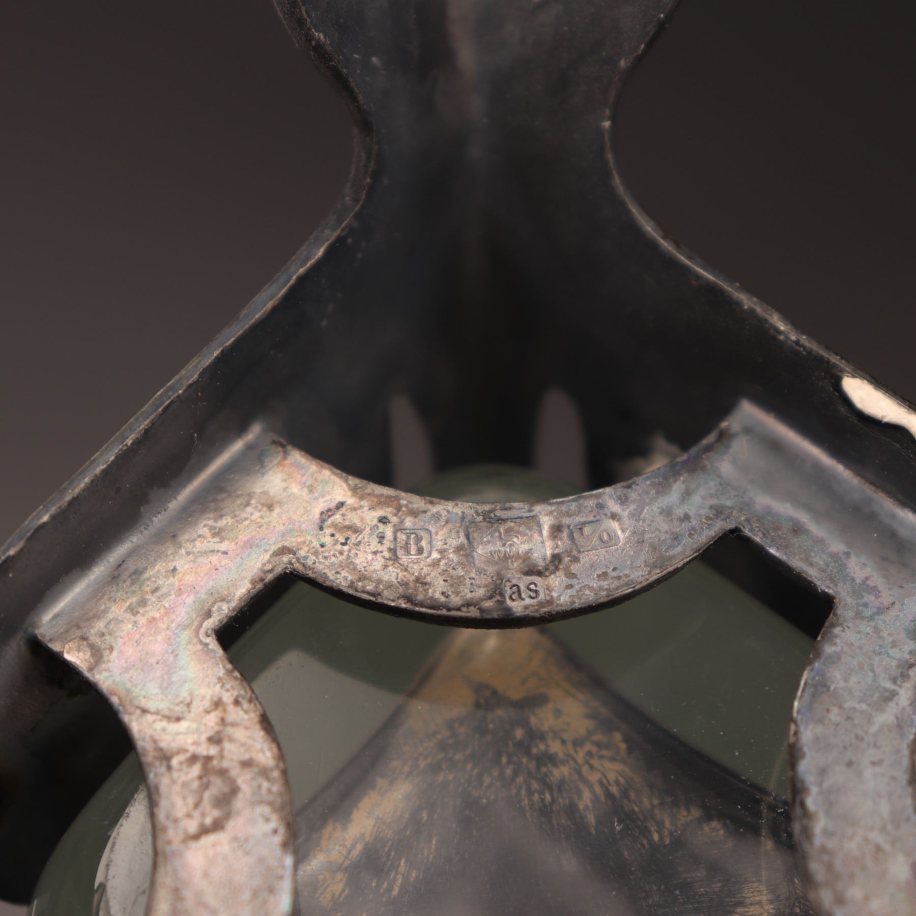 Art Nouveau glass and metal-mounted vase by Württembergische Metallwarenfabrik (WMF), Germany, circa 1900–1910, the clear moulded glass liner etched with stylised lilies and set in an openwork pewter mount of flowing stems, ivy leaves and berries, underside stamped with WMF marks indicating antique silver finish. Glass in excellent condition; pewter with patina, rubbing and one applied leaf element detached and requiring reattachment.